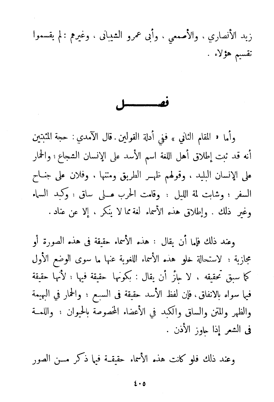 قَالَ الآمدي: حُجَّةُ الْمُثْبِتِينَ أَنَّهُ قَدْ ثَبَتَ إطْلَاقُ أَهْلِ اللُّغَةِ اسْمَ الْأَسَدِ عَلَى الْإِنْسَانِ الشُّجَاعِ؛ وَالْحِمَارِ عَلَى الْإِنْسَانِ الْبَلِيدِ وَقَوْلُهُمْ ظَهَرَ الطَّرِيقُ وَمَتْنُهَا وَفُلَانٌ عَلَى جَنَاحِ السَّفَرِ؛ وَشَابَتْ لُمَّةُ اللَّيْلِ؛ وَقَامَتْ الْحَرْبُ عَلَى سَاقٍ؛ وَكَبِدِ السَّمَاءِ وَغَيْرِ ذَلِكَ. وَإِطْلَاقُ هَذِهِ الْأَسْمَاءِ لُغَةُ مِمَّا لَا يُنْكِرُ إلَّا عَنْ عِنَادٍ. وَعِنْدَ ذَلِكَ فَإِمَّا أَنْ يُقَالَ: هَذِهِ الْأَسْمَاءُ حَقِيقَةٌ فِي هَذِهِ الصُّورَةِ أَوْ مَجَازِيَّةٌ؛ لِاسْتِحَالَةِ خُلُوِّ هَذِهِ الْأَسْمَاءِ اللُّغَوِيَّةِ عَنْهَا مَا سِوَى الْوَضْعِ الْأَوَّلِ كَمَا سَبَقَ تَحْقِيقُهُ لَا جَائِزٌ أَنْ يُقَالَ: بِكَوْنِهَا حَقِيقَةً فِيهَا؛ لِأَنَّهَا حَقِيقَةٌ فِيمَا سِوَاهُ بِالِاتِّفَاقِ فَإِنَّ لَفْظَ الْأَسَدِ حَقِيقَةٌ فِي السَّبُعِ؛ وَالْحِمَارِ فِي الْبَهِيمَةِ وَالظَّهْرِ وَالْمَتْنِ وَالسَّاقِ وَالْكَبِدِ فِي الْأَعْضَاءِ الْمَخْصُوصَةِ بِالْحَيَوَانِ؛ وَاللُّمَّةِ فِي الشَّعْرِ إذَا جَاوَزَ الْأُذُنَ. وَعِنْدَ ذَلِكَ فَلَوْ كَانَتْ هَذِهِ الْأَسْمَاءُ حَقِيقَةً فِيمَا ذَكَرَ مِنْ الصُّوَرِ