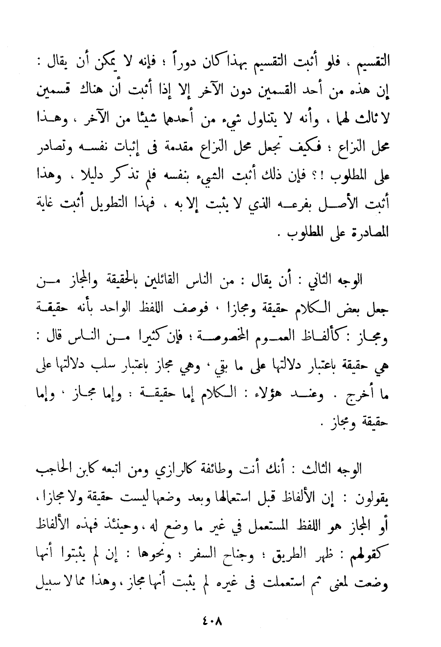 التَّقْسِيمِ فَلَوْ أَثْبَتَ التَّقْسِيمَ بِهَذَا كَانَ دَوْرًا؛ فَإِنَّهُ لَا يُمْكِنُ أَنْ يُقَالَ: إنَّ هَذِهِ مِنْ أَحَدِ الْقِسْمَيْنِ دُونَ الْآخَرِ إلَّا إذَا أَثْبَتَ أَنَّ هُنَاكَ قِسْمَيْنِ لَا ثَالِثَ لَهُمَا وَأَنَّهُ لَا يَتَنَاوَلُ شَيْءٌ مِنْ أَحَدِهِمَا شَيْئًا مِنْ الْآخَرِ؟ وَهَذَا مَحَلُّ النِّزَاعِ؛ فَكَيْفَ تَجْعَلُ مَحَلَّ النِّزَاعِ مُقَدِّمَةً فِي إثْبَاتِ نَفْسِهِ وَتُصَادِرُ عَلَى الْمَطْلُوبِ؟ فَإِنَّ ذَلِكَ أَثْبَتَ الشَّيْءَ بِنَفْسِهِ فَلَمْ تَذْكُرْ دَلِيلًا وَهَذَا أَثْبَتَ الْأَصْلَ بِفَرْعِهِ الَّذِي لَا يَثْبُتُ إلَّا بِهِ فَهَذَا التَّطْوِيلُ أَثْبَتَ غَايَةَ الْمُصَادَرَةِ عَلَى الْمَطْلُوبِ. الْوَجْهُ الثَّانِي: أَنْ يُقَالَ: مِنْ النَّاسِ الْقَائِلِينَ بِالْحَقِيقَةِ وَالْمَجَازِ مَنْ جَعَلَ بَعْضَ الْكَلَامِ حَقِيقَةً وَمَجَازًا فَوَصَفَ اللَّفْظَ الْوَاحِدَ بِأَنَّهُ حَقِيقَةٌ وَمَجَازٌ: كَأَلْفَاظِ الْعُمُومِ الْمَخْصُوصَةِ؛ فَإِنَّ كَثِيرًا مِنْ النَّاسِ قَالَ: هِيَ حَقِيقَةٌ بِاعْتِبَارِ دَلَالَتِهَا عَلَى مَا بَقِيَ وَهِيَ مَجَازٌ بِاعْتِبَارِ سَلْبِ دَلَالَتِهَا عَلَى مَا أَخْرَجَ. وَعِنْدَ هَؤُلَاءِ: الْكَلَامُ إمَّا حَقِيقَةٌ؛ وَإِمَّا مَجَازٌ وَإِمَّا حَقِيقَةٌ وَمَجَازٌ. الْوَجْهُ الثَّالِثُ: أَنَّك أَنْتَ وَطَائِفَةٌ كالرَّازِي وَمَنْ اتَّبَعَهُ كَابْنِ الْحَاجِبِ يَقُولُونَ: إنَّ الْأَلْفَاظَ قَبْلَ اسْتِعْمَالِهَا وَبَعْدَ وَضْعِهَا لَيْسَتْ حَقِيقَةً وَلَا مَجَازًا أَوْ الْمَجَازُ هُوَ اللَّفْظُ الْمُسْتَعْمَلُ فِي غَيْرِ مَا وُضِعَ لَهُ وَحِينَئِذٍ فَهَذِهِ الْأَلْفَاظُ كَقَوْلِهِمْ: ظَهْرُ الطَّرِيقِ؛ وَجَنَاحُ السَّفَرِ؛ وَنَحْوِهَا: إنْ لَمْ يُثْبِتُوا أَنَّهَا وُضِعَتْ لِمَعْنَى ثُمَّ اُسْتُعْمِلَتْ فِي غَيْرِهِ لَمْ يَثْبُتْ أَنَّهَا مَجَازٌ وَهَذَا مِمَّا لَا سَبِيلَ