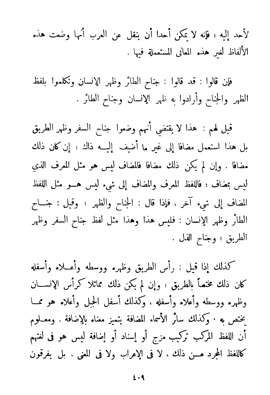 لِأَحَدِ إلَيْهِ؛ فَإِنَّهُ لَا يُمْكِنُ أَحَدًا أَنْ يَنْقُلَ عَنْ الْعَرَبِ أَنَّهَا وَضَعَتْ هَذِهِ الْأَلْفَاظَ لِغَيْرِ هَذِهِ الْمَعَانِي الْمُسْتَعْمَلَةِ فِيهَا. فَإِنْ قَالُوا: قَدْ قَالُوا: جَنَاحُ الطَّائِرِ وَظَهْرُ الْإِنْسَانِ وَتَكَلَّمُوا بِلَفْظِ الظَّهْرِ وَالْجَنَاحِ وَأَرَادُوا بِهِ ظَهْرَ الْإِنْسَانِ وَجَنَاحَ الطَّائِرِ. قِيلَ لَهُمْ: هَذَا لَا يَقْتَضِي أَنَّهُمْ وَضَعُوا جَنَاحَ السَّفَرِ وَظَهْرَ الطَّرِيقِ بَلْ هَذَا اُسْتُعْمِلَ مُضَافًا إلَى غَيْرِ مَا أُضِيفَ إلَيْهِ ذَاكَ؛ إنْ كَانَ ذَلِكَ مُضَافًا. وَإِنْ لَمْ يَكُنْ ذَلِكَ مُضَافًا فَالْمُضَافُ لَيْسَ هُوَ مِثْلَ الْمُعَرَّفِ الَّذِي لَيْسَ بِمُضَافِ؛ فَاللَّفْظُ الْمُعَرَّفُ وَالْمُضَافُ إلَى شَيْءٍ لَيْسَ هُوَ مِثْلَ اللَّفْظِ الْمُضَافِ إلَى شَيْءٍ آخَرَ فَإِذَا قَالَ: الْجَنَاحُ وَالظَّهْرُ؛ وَقِيلَ: جَنَاحُ الطَّائِرِ وَظَهْرُ الْإِنْسَانِ: فَلَيْسَ هَذَا وَهَذَا مِثْلَ لَفْظِ جَنَاحِ السَّفَرِ وَظَهْرِ الطَّرِيقِ؛ وَجَنَاحِ الذُّلِّ. كَذَلِكَ إذَا قِيلَ: رَأْسُ الطَّرِيقِ وَظَهْرُهُ وَوَسَطُهُ وَأَعْلَاهُ وَأَسْفَلُهُ كَانَ ذَلِكَ مُخْتَصًّا بِالطَّرِيقِ؛ وَإِنْ لَمْ يَكُنْ ذَلِكَ مُمَاثِلًا كَرَأْسِ الْإِنْسَانِ وَظَهْرِهِ وَوَسَطِهِ وَأَعْلَاهُ وَأَسْفَلِهِ وَكَذَلِكَ أَسْفَلُ الْجَبَلِ وَأَعْلَاهُ هُوَ مِمَّا يَخْتَصُّ بِهِ وَكَذَلِكَ سَائِرُ الْأَسْمَاءِ الْمُضَافَةِ يَتَمَيَّزُ مَعْنَاهُ بِالْإِضَافَةِ وَمَعْلُومٌ أَنَّ اللَّفْظَ الْمُرَكَّبَ تَرْكِيبَ مَزْجٍ أَوْ إسْنَادٍ أَوْ إضَافَةٍ لَيْسَ هُوَ مِنْ لُغَتِهِمْ كَاللَّفْظِ الْمُجَرَّدِ عَنْ ذَلِكَ لَا فِي الْإِعْرَابِ وَلَا فِي الْمَعْنَى. بَلْ يُفَرِّقُونَ