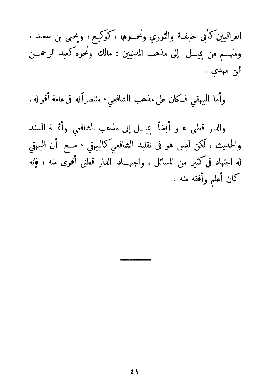 الْعِرَاقِيِّينَ كَأَبِي حَنِيفَةَ وَالثَّوْرِيِّ وَنَحْوِهِمَا كَوَكِيعِ؛ وَيَحْيَى بْنِ سَعِيدٍ وَمِنْهُمْ مَنْ يَمِيلُ إلَى مَذْهَبِ الْمَدَنِيِّينَ: مَالِكٌ وَنَحْوُهُ كَعَبْدِ الرَّحْمَنِ بْنِ مَهْدِيٍّ. وَأَمَّا البيهقي فَكَانَ عَلَى مَذْهَبِ الشَّافِعِيِّ؛ مُنْتَصِرًا لَهُ فِي عَامَّةِ أَقْوَالِهِ. وَالدَّارَقُطْنِي هُوَ أَيْضًا يَمِيلُ إلَى مَذْهَبِ الشَّافِعِيِّ وَأَئِمَّةِ السَّنَدِ وَالْحَدِيثِ لَكِنْ لَيْسَ هُوَ فِي تَقْلِيدِ الشَّافِعِيِّ كالبيهقي مَعَ أَنَّ البيهقي لَهُ اجْتِهَادٌ فِي كَثِيرٍ مِنْ الْمَسَائِلِ وَاجْتِهَادُ الدارقطني أَقْوَى مِنْهُ؛ فَإِنَّهُ كَانَ أَعْلَمَ وَأَفْقَهَ مِنْهُ.