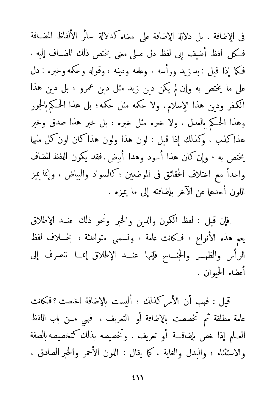 فِي الْإِضَافَةِ بَلْ دَلَالَةُ الْإِضَافَةِ عَلَى مَعْنَاهُ كَدَلَالَةِ سَائِرُ الْأَلْفَاظِ الْمُضَافَةِ فَكُلُّ لَفْظٍ أُضِيفَ إلَى لَفْظٍ دَلَّ عَلَى مَعْنًى يَخْتَصُّ ذَلِكَ الْمُضَافُ إلَيْهِ فَكَمَا إذَا قِيلَ: يَدُ زَيْدٍ وَرَأْسُهُ؛ وَعِلْمُهُ وَدِينُهُ؛ وَقَوْلُهُ وَحُكْمُهُ وَخَبَرُهُ: دَلَّ عَلَى مَا يَخْتَصُّ بِهِ وَإِنْ لَمْ يَكُنْ دِينُ زَيْدٍ مِثْلَ دِينِ عَمْرٍو؛ بَلْ دِينُ هَذَا الْكُفْرُ وَدِينُ هَذَا الْإِسْلَامُ وَلَا حُكْمُهُ مِثْلُ حُكْمِهِ؛ بَلْ هَذَا الْحُكْمُ بِالْجَوْرِ وَهَذَا الْحُكْمُ بِالْعَدْلِ وَلَا خَبَرُهُ مِثْلُ خَبَرِهِ؛ بَلْ خَبَرُ هَذَا صِدْقٌ وَخَبَرُ هَذَا كَذِبٌ وَكَذَلِكَ إذَا قِيلَ: لَوْنُ هَذَا وَلَوْنُ هَذَا كَانَ لَوْنُ كَلٍّ مِنْهُمَا يَخْتَصُّ بِهِ وَإِنْ كَانَ هَذَا أَسْوَدَ وَهَذَا أَبْيَضَ. فَقَدْ يَكُونُ اللَّفْظُ الْمُضَافُ وَاحِدًا مَعَ اخْتِلَافِ الْحَقَائِقِ فِي الْمَوْضِعَيْنِ؛ كَالسَّوَادِ وَالْبَيَاضِ وَإِنَّمَا يُمَيِّزُ اللَّوْنُ أَحَدَهُمَا عَنْ الْآخَرِ بِإِضَافَتِهِ إلَى مَا يُمَيِّزُهُ. فَإِنْ قِيلَ: لَفْظُ الْكَوْنِ وَالدِّينِ وَالْخَبَرِ وَنَحْوِ ذَلِكَ عِنْدَ الْإِطْلَاقِ يَعُمُّ هَذِهِ الْأَنْوَاعَ؛ فَكَانَتْ عَامَّةً؛ وَتُسَمَّى مُتَوَاطِئَةً؛ بِخِلَافِ لَفْظِ الرَّأْسِ وَالظَّهْرِ وَالْجَنَاحِ فَإِنَّهَا عِنْدَ الْإِطْلَاقِ إنَّمَا تَنْصَرِفُ إلَى أَعْضَاءِ الْحَيَوَانِ. قِيلَ: فَهَبْ أَنَّ الْأَمْرَ كَذَلِكَ: أَلَيْسَتْ بِالْإِضَافَةِ اخْتَصَّتْ؟ فَكَانَتْ عَامَّةً مُطْلَقَةً ثُمَّ تَخَصَّصَتْ بِالْإِضَافَةِ أَوْ التَّعْرِيفِ فَهِيَ مِنْ بَابِ اللَّفْظِ الْعَامِّ إذَا خُصَّ بِإِضَافَةِ أَوْ تَعْرِيفٍ. وَتَخْصِيصُهُ بِذَلِكَ كَتَخْصِيصِهِ بِالصِّفَةِ وَالِاسْتِثْنَاءِ؛ وَالْبَدَلِ وَالْغَايَةِ كَمَا يُقَالُ: اللَّوْنُ الْأَحْمَرُ وَالْخَبَرُ الصَّادِقُ
