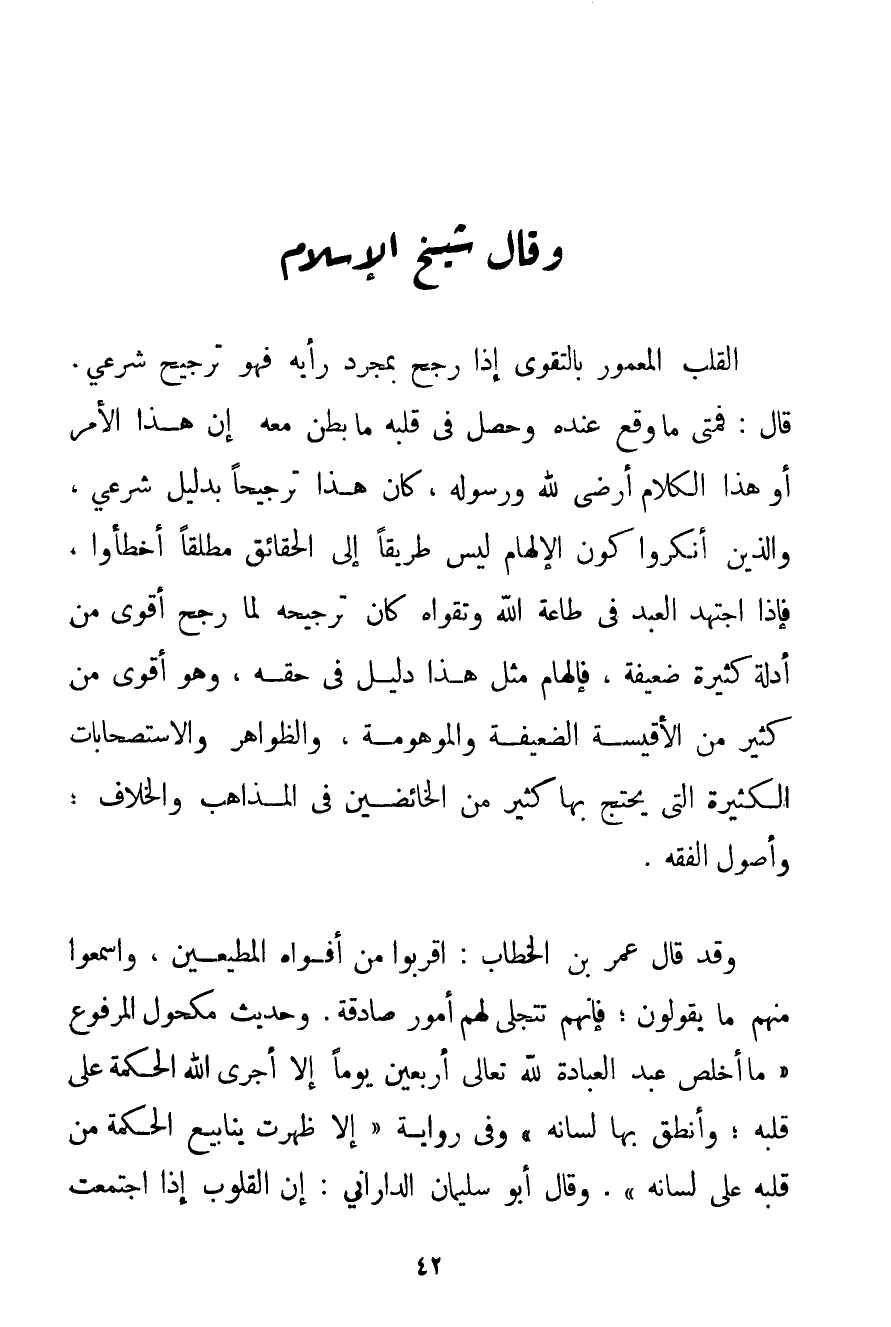 قَالَ: فَمَتَى مَا وَقَعَ عِنْدَهُ وَحَصَلَ فِي قَلْبِهِ مَا بَطَنَ مَعَهُ إنَّ هَذَا الْأَمْرَ أَوْ هَذَا الْكَلَامَ أَرْضَى لِلَّهِ وَرَسُولِهِ كَانَ هَذَا تَرْجِيحًا بِدَلِيلِ شَرْعِيٍّ (*) وَاَلَّذِينَ أَنْكَرُوا كَوْنَ الْإِلْهَامِ لَيْسَ طَرِيقًا إلَى الْحَقَائِقِ مُطْلَقًا أَخْطَؤُوا فَإِذَا اجْتَهَدَ الْعَبْدُ فِي طَاعَةِ اللَّهِ وَتَقْوَاهُ كَانَ تَرْجِيحُهُ لِمَا رَجَّحَ أَقْوَى مِنْ أَدِلَّةٍ كَثِيرَةٍ ضَعِيفَةٍ فَإِلْهَامُ مِثْلِ هَذَا دَلِيلٌ فِي حَقِّهِ وَهُوَ أَقْوَى مِنْ كَثِيرٍ مِنْ الْأَقْيِسَةِ الضَّعِيفَةِ وَالْمَوْهُومَةِ وَالظَّوَاهِرِ والاستصحابات الْكَثِيرَةِ الَّتِي يَحْتَجُّ بِهَا كَثِيرٌ مِنْ الْخَائِضِينَ فِي الْمَذَاهِبِ وَالْخِلَافِ؛ وَأُصُولِ الْفِقْهِ. وَقَدْ قَالَ عُمَرُ بْنُ الْخَطَّابِ: اقْرَبُوا مِنْ أَفْوَاهِ الْمُطِيعِينَ وَاسْمَعُوا مِنْهُمْ مَا يَقُولُونَ؛ فَإِنَّهُمْ تَتَجَلَّى لَهُمْ أُمُورٌ صَادِقَةٌ. وَحَدِيثُ مَكْحُولٍ الْمَرْفُوعُ {مَا أَخْلَصَ عَبْدٌ الْعِبَادَةَ لِلَّهِ تَعَالَى أَرْبَعِينَ يَوْمًا إلَّا أَجْرَى اللَّهُ الْحِكْمَةَ عَلَى قَلْبِهِ؛ وَأَنْطَقَ بِهَا لِسَانَهُ وَفِي رِوَايَةٍ إلَّا ظَهَرَتْ يَنَابِيعُ الْحِكْمَةِ مِنْ قَلْبِهِ عَلَى لِسَانِهِ} . وَقَالَ أَبُو سُلَيْمَانَ الداراني: إنَّ الْقُلُوبَ إذَا اجْتَمَعَتْ