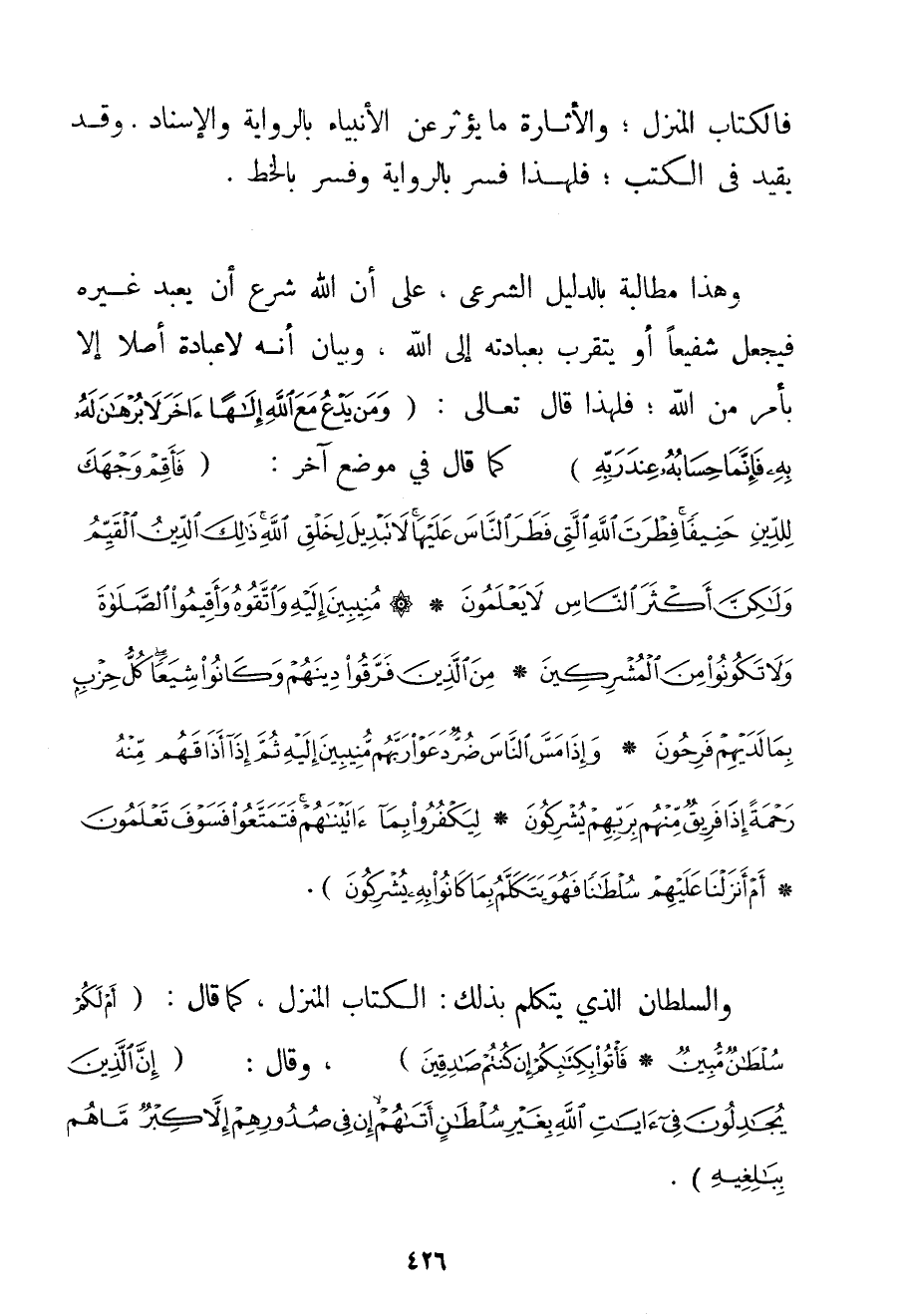 مِنْ قَبْلِ هَذَا أَوْ أَثَارَةٍ مِنْ عِلْمٍ.} فَالْكِتَابُ الْمُنَزَّلُ؛ وَالْأَثَارَةُ مَا يُؤْثَرُ عَنْ الْأَنْبِيَاءِ بِالرِّوَايَةِ وَالْإِسْنَادِ. وَقَدْ يُقَيَّدُ فِي الْكُتُبِ؛ فَلِهَذَا فُسِّرَ بِالرِّوَايَةِ وَفُسِّرَ بِالْخَطِّ. وَهَذَا مُطَالَبَةٌ بِالدَّلِيلِ الشَّرْعِيِّ عَلَى أَنَّ اللَّهَ شَرَعَ أَنْ يُعْبَدَ غَيْرُهُ فَيُجْعَلَ شَفِيعًا أَوْ يُتَقَرَّبَ بِعِبَادَتِهِ إلَى اللَّهِ وَبَيَانُ أَنَّهُ لَا عِبَادَةَ أَصْلًا إلَّا بِأَمْرِ مِنْ اللَّهِ؛ فَلِهَذَا قَالَ تَعَالَى: {وَمَنْ يَدْعُ مَعَ اللَّهِ إلَهًا آخَرَ لَا بُرْهَانَ لَهُ بِهِ فَإِنَّمَا حِسَابُهُ عِنْدَ رَبِّهِ} كَمَا قَالَ فِي مَوْضِعٍ آخَرَ: {فَأَقِمْ وَجْهَكَ لِلدِّينِ حَنِيفًا فِطْرَةَ اللَّهِ الَّتِي فَطَرَ النَّاسَ عَلَيْهَا لَا تَبْدِيلَ لِخَلْقِ اللَّهِ ذَلِكَ الدِّينُ الْقَيِّمُ وَلَكِنَّ أَكْثَرَ النَّاسِ لَا يَعْلَمُونَ} {مُنِيبِينَ إلَيْهِ وَاتَّقُوهُ وَأَقِيمُوا الصَّلَاةَ وَلَا تَكُونُوا مِنَ الْمُشْرِكِينَ} {مِنَ الَّذِينَ فَرَّقُوا دِينَهُمْ وَكَانُوا شِيَعًا كُلُّ حِزْبٍ بِمَا لَدَيْهِمْ فَرِحُونَ} {وَإِذَا مَسَّ النَّاسَ ضُرٌّ دَعَوْا رَبَّهُمْ مُنِيبِينَ إلَيْهِ ثُمَّ إذَا أَذَاقَهُمْ مِنْهُ رَحْمَةً إذَا فَرِيقٌ مِنْهُمْ بِرَبِّهِمْ يُشْرِكُونَ} {لِيَكْفُرُوا بِمَا آتَيْنَاهُمْ فَتَمَتَّعُوا فَسَوْفَ تَعْلَمُونَ} {أَمْ أَنْزَلْنَا عَلَيْهِمْ سُلْطَانًا فَهُوَ يَتَكَلَّمُ بِمَا كَانُوا بِهِ يُشْرِكُونَ} . وَالسُّلْطَانُ الَّذِي يَتَكَلَّمُ بِذَلِكَ: الْكِتَابُ الْمُنَزَّلُ كَمَا قَالَ: {أَمْ لَكُمْ سُلْطَانٌ مُبِينٌ} {فَأْتُوا بِكِتَابِكُمْ إنْ كُنْتُمْ صَادِقِينَ} وَقَالَ: {إنَّ الَّذِينَ يُجَادِلُونَ فِي آيَاتِ اللَّهِ بِغَيْرِ سُلْطَانٍ أَتَاهُمْ إنْ فِي صُدُورِهِمْ إلَّا كِبْرٌ مَا هُمْ بِبَالِغِيهِ} .
