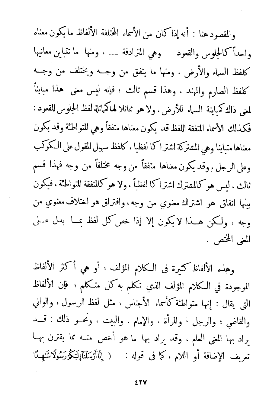وَالْمَقْصُودُ هُنَا: أَنَّهُ إذَا كَانَ مِنْ الْأَسْمَاءِ الْمُخْتَلِفَةِ الْأَلْفَاظِ مَا يَكُونُ مَعْنَاهُ وَاحِدًا كَالْجُلُوسِ وَالْقُعُودِ - وَهِيَ الْمُتَرَادِفَةُ - وَمِنْهَا مَا تَتَبَايَنُ مَعَانِيهَا كَلَفْظِ السَّمَاءِ وَالْأَرْضِ وَمِنْهَا مَا يَتَّفِقُ مِنْ وَجْهٍ وَيَخْتَلِفُ مِنْ وَجْهٍ كَلَفْظِ الصَّارِمِ وَالْمُهَنَّدِ وَهَذَا قِسْمٌ ثَالِثٌ؛ فَإِنَّهُ لَيْسَ مَعْنَى هَذَا مُبَايِنًا لِمَعْنَى ذَاكَ كَمُبَايَنَةِ السَّمَاءِ لِلْأَرْضِ وَلَا هُوَ مُمَاثِلًا لَهَا كَمُمَاثَلَةِ لَفْظِ الْجُلُوسِ لِلْقُعُودِ: فَكَذَلِكَ الْأَسْمَاءُ الْمُتَّفِقَةُ اللَّفْظُ قَدْ يَكُونُ مَعْنَاهَا مُتَّفِقًا وَهِيَ الْمُتَوَاطِئَةُ وَقَدْ يَكُونُ مَعْنَاهَا مُتَبَايِنًا وَهِيَ الْمُشْتَرِكَةُ اشْتِرَاكًا لَفْظِيًّا كَلَفْظِ سُهَيْلٍ الْمَقُولِ عَلَى الْكَوْكَبِ وَعَلَى الرَّجُلِ وَقَدْ يَكُونُ مَعْنَاهَا مُتَّفِقًا مِنْ وَجْهٍ مُخْتَلِفًا مَنْ وَجْهٍ فَهَذَا قِسْمٌ ثَالِثٌ لَيْسَ هُوَ كَالْمُشْتَرَكِ اشْتِرَاكًا لَفْظِيًّا وَلَا هُوَ كَالْمُتَّفِقَةِ الْمُتَوَاطِئَةِ فَيَكُونُ بَيْنَهَا اتِّفَاقٌ هُوَ اشْتِرَاكٌ مَعْنَوِيٌّ مِنْ وَجْهٍ وَافْتِرَاقٌ هُوَ اخْتِلَافٌ مَعْنَوِيٌّ مِنْ وَجْهٍ وَلَكِنَّ هَذَا لَا يَكُونُ إلَّا إذَا خُصَّ كُلُّ لَفْظٍ بِمَا يَدُلُّ عَلَى الْمَعْنَى الْمُخْتَصِّ. وَهَذِهِ الْأَلْفَاظُ كَثِيرَةٌ فِي الْكَلَامِ الْمُؤَلَّفِ؛ أَوْ هِيَ أَكْثَرُ الْأَلْفَاظِ الْمَوْجُودَةِ فِي الْكَلَامِ الْمُؤَلَّفِ الَّذِي تَكَلَّمَ بِهِ كُلُّ مُتَكَلِّمٍ؛ فَإِنَّ الْأَلْفَاظَ الَّتِي يُقَالُ: إنَّهَا مُتَوَاطِئَةٌ كَأَسْمَاءِ الْأَجْنَاسِ؛ مِثْلَ لَفْظِ الرَّسُولِ وَالْوَالِي وَالْقَاضِي؛ وَالرَّجُلِ؛ وَالْمَرْأَةِ وَالْإِمَامِ وَالْبَيْتِ؛ وَنَحْوِ ذَلِكَ: قَدْ يُرَادُ بِهَا الْمَعْنَى الْعَامُّ وَقَدْ يُرَادُ بِهَا مَا هُوَ أَخَصُّ مِنْهُ مِمَّا يَقْتَرِنُ بِهَا تَعْرِيفُ الْإِضَافَةِ أَوْ اللَّامِ كَمَا فِي قَوْلِهِ: {إنَّا أَرْسَلْنَا إلَيْكُمْ رَسُولًا