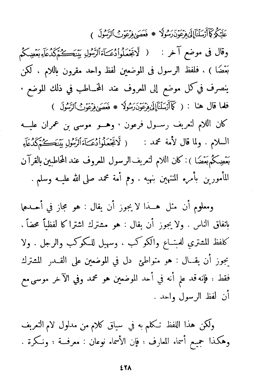 شَاهِدًا عَلَيْكُمْ كَمَا أَرْسَلْنَا إلَى فِرْعَوْنَ رَسُولًا} {فَعَصَى فِرْعَوْنُ الرَّسُولَ} وَقَالَ فِي مَوْضِعٍ آخَرَ: {لَا تَجْعَلُوا دُعَاءَ الرَّسُولِ بَيْنَكُمْ كَدُعَاءِ بَعْضِكُمْ بَعْضًا} فَلَفْظُ الرَّسُولِ فِي الْمَوْضِعَيْنِ لَفْظٌ وَاحِدٌ مَقْرُونٌ بِاللَّامِ لَكِنْ يَنْصَرِفُ فِي كُلِّ مَوْضِعٍ إلَى الْمَعْرُوفِ عِنْدَ الْمُخَاطَبِ فِي ذَلِكَ الْمَوْضِعِ فَلَمَّا قَالَ هُنَا: {كَمَا أَرْسَلْنَا إلَى فِرْعَوْنَ رَسُولًا} {فَعَصَى فِرْعَوْنُ الرَّسُولَ} كَانَ اللَّامُ لِتَعْرِيفِ رَسُولِ فِرْعَوْنَ وَهُوَ مُوسَى بْنُ عِمْرَانَ عَلَيْهِ السَّلَامُ. وَلَمَّا قَالَ لِأُمَّةِ مُحَمَّدٍ: {لَا تَجْعَلُوا دُعَاءَ الرَّسُولِ بَيْنَكُمْ كَدُعَاءِ بَعْضِكُمْ بَعْضًا} كَانَ اللَّامُ لِتَعْرِيفِ الرَّسُولِ الْمَعْرُوفِ عِنْدَ الْمُخَاطَبِينَ بِالْقُرْآنِ الْمَأْمُورِينَ بِأَمْرِهِ الْمُنْتَهِينَ بِنَهْيِهِ وَهُمْ أُمَّةُ مُحَمَّدٍ صَلَّى اللَّهُ عَلَيْهِ وَسَلَّمَ. وَمَعْلُومٌ أَنَّ مِثْلَ هَذَا لَا يَجُوزُ أَنْ يُقَالَ: هُوَ مَجَازٌ فِي أَحَدِهِمَا بِاتِّفَاقِ النَّاسِ. وَلَا يَجُوزُ أَنْ يُقَالَ: هُوَ مُشْتَرَكٌ اشْتِرَاكًا لَفْظِيًّا مَحْضًا كَلَفْظِ الْمُشْتَرِي لِلْمُبْتَاعِ وَالْكَوْكَبِ وَسُهَيْلٍ لِلْكَوْكَبِ وَالرَّجُلِ. وَلَا يَجُوزُ أَنْ يُقَالَ: هُوَ مُتَوَاطِئٌ دَلَّ فِي الْمَوْضِعَيْنِ عَلَى الْقَدْرِ الْمُشْتَرَكِ فَقَطْ؛ فَإِنَّهُ قَدْ عُلِمَ أَنَّهُ فِي أَحَدِ الْمَوْضِعَيْنِ هُوَ مُحَمَّدٌ وَفِي الْآخَرِ مُوسَى مَعَ أَنَّ لَفْظَ الرَّسُولِ وَاحِدٌ. وَلَكِنَّ هَذَا اللَّفْظَ تَكَلَّمَ بِهِ فِي سِيَاقِ كَلَامٍ مِنْ مَدْلُولِ لَامِ التَّعْرِيفِ وَهَكَذَا جَمِيعُ أَسْمَاءِ الْمَعَارِفِ؛ فَإِنَّ الْأَسْمَاءَ نَوْعَانِ: مَعْرِفَةٌ؛ وَنَكِرَةٌ.