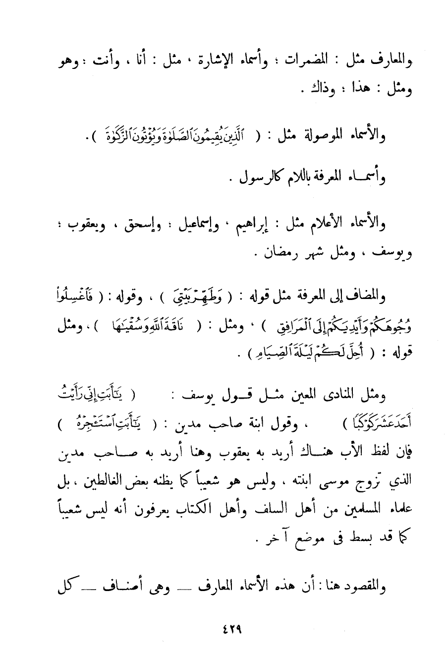 وَالْمَعَارِفُ مِثْلُ: الْمُضْمَرَاتِ؛ وَأَسْمَاءُ الْإِشَارَةِ مِثْلُ: أَنَا وَأَنْتَ؛ وَهُوَ وَمِثْلُ: هَذَا؛ وَذَاكَ. وَالْأَسْمَاءُ الْمَوْصُولَةُ مِثْلُ: {الَّذِينَ يُقِيمُونَ الصَّلَاةَ وَيُؤْتُونَ الزَّكَاةَ} . وَأَسْمَاءُ الْمَعْرِفَةِ بِاللَّامِ كَالرَّسُولِ. وَالْأَسْمَاءُ الْأَعْلَامُ مِثْلُ: إبْرَاهِيمُ وَإِسْمَاعِيلُ: وَإِسْحَاقُ وَيَعْقُوبُ؛ وَيُوسُفُ وَمِثْلُ شَهْرِ رَمَضَانَ. وَالْمُضَافُ إلَى الْمَعْرِفَةِ مِثْلُ قَوْلِهِ: {وَطَهِّرْ بَيْتِيَ} وَقَوْلِهِ: {فَاغْسِلُوا وُجُوهَكُمْ وَأَيْدِيَكُمْ إلَى الْمَرَافِقِ} وَمِثْلُ: {نَاقَةَ اللَّهِ وَسُقْيَاهَا} وَمِثْلُ قَوْلِهِ: {أُحِلَّ لَكُمْ لَيْلَةَ الصِّيَامِ} . وَمِثْلُ الْمُنَادَى الْمُعَيَّنِ مِثْلَ قَوْلِ يُوسُفَ: {يَا أَبَتِ إنِّي رَأَيْتُ أَحَدَ عَشَرَ كَوْكَبًا} وَقَوْلُ ابْنَةِ صَاحِبِ مَدْيَنَ: {يَا أَبَتِ اسْتَأْجِرْهُ} فَإِنَّ لَفْظَ الْأَبِ هُنَاكَ أُرِيدَ بِهِ يَعْقُوبُ وَهُنَا أُرِيدَ بِهِ صَاحِبُ مَدْيَنَ الَّذِي تَزَوَّجَ مُوسَى ابْنَتَهُ وَلَيْسَ هُوَ شُعَيْبًا كَمَا يَظُنُّهُ بَعْضُ الغالطين بَلْ عُلَمَاءُ الْمُسْلِمِينَ مِنْ أَهْلِ السَّلَفِ وَأَهْلِ الْكِتَابِ يَعْرِفُونَ أَنَّهُ لَيْسَ شُعَيْبًا كَمَا قَدْ بُسِطَ فِي مَوْضِعٍ آخَرَ. وَالْمَقْصُودُ هُنَا: أَنَّ هَذِهِ الْأَسْمَاءَ الْمَعَارِفَ - وَهِيَ أَصْنَافٌ - كُلُّ