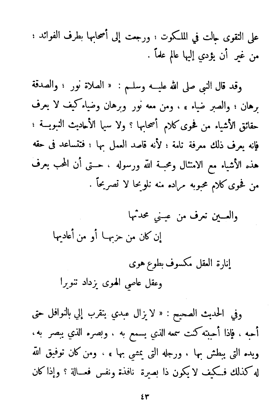 وَفِي الْحَدِيثِ الصَّحِيحِ: {لَا يَزَالُ عَبْدِي يَتَقَرَّبُ إلَيَّ بِالنَّوَافِلِ حَتَّى أُحِبَّهُ فَإِذَا أَحْبَبْته كُنْت سَمْعَهُ الَّذِي يَسْمَعُ بِهِ وَبَصَرَهُ الَّذِي يُبْصِرُ بِهِ وَيَدَهُ الَّتِي يَبْطِشُ بِهَا وَرِجْلَهُ الَّتِي يَمْشِي بِهَا} " وَمَنْ كَانَ تَوْفِيقُ اللَّهِ لَهُ كَذَلِكَ فَكَيْفَ لَا يَكُونُ ذَا بَصِيرَةٍ نَافِذَةٍ وَنَفْسٍ فَعَّالَةٍ؟ وَإِذَا كَانَ