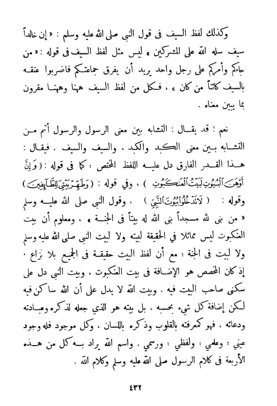 وَكَذَلِكَ لَفْظُ السَّيْفِ فِي {قَوْلِ النَّبِيِّ صَلَّى اللَّهُ عَلَيْهِ وَسَلَّمَ إنَّ خَالِدًا سَيْفٌ سَلَّهُ اللَّهُ عَلَى الْمُشْرِكِينَ} لَيْسَ مِثْلَ لَفْظِ السَّيْفِ فِي قَوْلِهِ: {مَنْ جَاءَكُمْ وَأَمْرُكُمْ عَلَى رَجُلٍ وَاحِدٍ يُرِيدُ أَنْ يُفَرِّقَ جَمَاعَتَكُمْ فَاضْرِبُوا عُنُقَهُ بِالسَّيْفِ كَائِنًا مَنْ كَانَ} فَكُلٌّ مِنْ لَفْظِ السَّيْفِ هَاهُنَا وَهَاهُنَا مَقْرُونٌ بِمَا يُبَيِّنُ مَعْنَاهُ. نَعَمْ قَدْ يُقَالُ: التَّشَابُهُ بَيْنَ مَعْنَى الرَّسُولِ وَالرَّسُولِ أَتَمُّ مِنْ التَّشَابُهِ بَيْنَ مَعْنَى الْكَبِدِ وَالْكَبِدِ وَالسَّيْفِ وَالسَّيْفِ. فَيُقَالُ: هَذَا الْقَدْرُ الْفَارِقُ دَلَّ عَلَيْهِ اللَّفْظُ الْمُخْتَصُّ؛ كَمَا فِي قَوْلِهِ: {وَإِنَّ أَوْهَنَ الْبُيُوتِ لَبَيْتُ الْعَنْكَبُوتِ} وَفِي قَوْلِهِ: {وَطَهِّرْ بَيْتِيَ لِلطَّائِفِينَ} وَقَوْلِهِ: {لَا تَدْخُلُوا بُيُوتَ النَّبِيِّ} وَقَوْلِ النَّبِيِّ صَلَّى اللَّهُ عَلَيْهِ وَسَلَّمَ {مَنْ بَنَى لِلَّهِ مَسْجِدًا بَنَى اللَّهُ لَهُ بَيْتًا فِي الْجَنَّةِ} وَمَعْلُومٌ أَنَّ بَيْتَ الْعَنْكَبُوتِ لَيْسَ مُمَاثِلًا فِي الْحَقِيقَةِ لِبَيْتِهِ وَلَا لِبَيْتِ النَّبِيِّ صَلَّى اللَّهُ عَلَيْهِ وَسَلَّمَ وَلَا لِبَيْتِ فِي الْجَنَّةِ؛ مَعَ أَنَّ لَفْظَ الْبَيْتِ حَقِيقَةٌ فِي الْجَمِيعِ بِلَا نِزَاعٍ إذْ كَانَ الْمُخَصِّصُ هُوَ الْإِضَافَةَ فِي بَيْتِ الْعَنْكَبُوتِ وَبَيْتِ النَّبِيِّ دَلَّ عَلَى سُكْنَى صَاحِبِ الْبَيْتِ فِيهِ وَبَيْتُ اللَّهِ لَا يَدُلُّ عَلَى أَنَّ اللَّهَ سَاكِنٌ فِيهِ لَكِنَّ إضَافَةَ كُلِّ شَيْءٍ بِحَسَبِهِ بَلْ بَيْتُهُ هُوَ الَّذِي جَعَلَهُ لِذِكْرِهِ وَعِبَادَتِهِ وَدُعَائِهِ فَهُوَ كَمَعْرِفَتِهِ بِالْقُلُوبِ وَذِكْرِهِ بِاللِّسَانِ وَكُلُّ مَوْجُودٍ فَلَهُ وُجُودٌ عَيْنِيٌّ؛ وَعِلْمِيٌّ؛ وَلَفْظِيٌّ؛ وَرَسْمِيٌّ. وَاسْمُ اللَّهِ يُرَادُ بِهِ كُلٌّ مِنْ هَذِهِ الْأَرْبَعَةِ فِي كَلَامِ الرَّسُولِ صَلَّى اللَّهُ عَلَيْهِ وَسَلَّمَ وَكَلَامِ اللَّهِ.