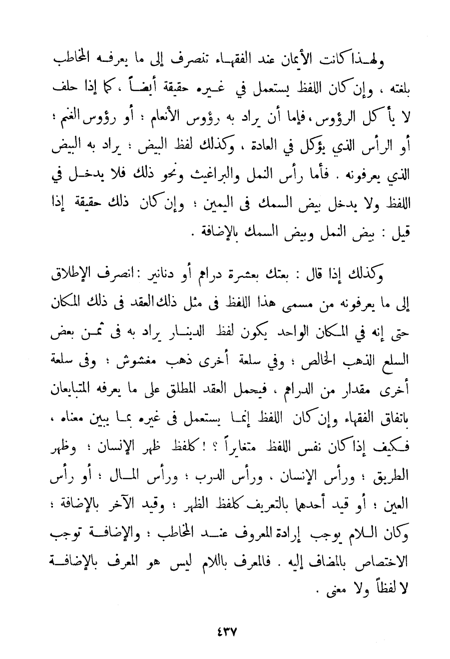 وَلِهَذَا كَانَتْ الْأَيْمَانُ عِنْدَ الْفُقَهَاءِ تَنْصَرِفُ إلَى مَا يَعْرِفُهُ الْمُخَاطَبُ بِلُغَتِهِ وَإِنْ كَانَ اللَّفْظُ يُسْتَعْمَلُ فِي غَيْرِهِ حَقِيقَةً أَيْضًا كَمَا إذَا حَلَفَ لَا يَأْكُلُ الرُّءُوسَ فَإِمَّا أَنْ يُرَادَ بِهِ رُءُوسُ الْأَنْعَامِ: أَوْ رُءُوسُ الْغَنَمِ؛ أَوْ الرَّأْسُ الَّذِي يُؤْكَلُ فِي الْعَادَةِ وَكَذَلِكَ لَفْظُ الْبَيْضِ؛ يُرَادُ بِهِ الْبَيْضُ الَّذِي يَعْرِفُونَهُ. فَأَمَّا رَأْسُ النَّمْلِ وَالْبَرَاغِيثِ وَنَحْوِ ذَلِكَ فَلَا يَدْخُلُ فِي اللَّفْظِ وَلَا يَدْخُلُ بَيْضُ السَّمَكِ فِي الْيَمِينِ؛ وَإِنْ كَانَ ذَلِكَ حَقِيقَةً إذَا قِيلَ: بَيْضُ النَّمْلِ وَبَيْضُ السَّمَكِ بِالْإِضَافَةِ وَكَذَلِكَ إذَا قَالَ: بِعْتُك بِعَشَرَةِ دَرَاهِمَ أَوْ دَنَانِيرَ: انْصَرَفَ الْإِطْلَاقُ إلَى مَا يَعْرِفُونَهُ مِنْ مُسَمَّى هَذَا اللَّفْظِ فِي مِثْلِ ذَلِكَ الْعَقْدِ فِي ذَلِكَ الْمَكَانِ حَتَّى إنَّهُ فِي الْمَكَانِ الْوَاحِدِ يَكُونُ لَفْظُ الدِّينَارِ يُرَادُ بِهِ فِي ثَمَنِ بَعْضِ السِّلَعِ الذَّهَبُ الْخَالِصُ؛ وَفِي سِلْعَةٍ أُخْرَى ذَهَبٌ مَغْشُوشٌ؛ وَفِي سِلْعَةٍ أُخْرَى مِقْدَارٌ مِنْ الدَّرَاهِمِ فَيُحْمَلُ الْعَقْدُ الْمُطْلَقُ عَلَى مَا يَعْرِفُهُ الْمُتَبَايِعَانِ بِاتِّفَاقِ الْفُقَهَاءِ وَإِنْ كَانَ اللَّفْظُ إنَّمَا يُسْتَعْمَلُ فِي غَيْرِهِ بِمَا يُبَيِّنُ مَعْنَاهُ فَكَيْفَ إذَا كَانَ نَفْسُ اللَّفْظِ مُتَغَايِرًا كَلَفْظِ ظَهْرِ الْإِنْسَانِ؛ وَظَهْرِ الطَّرِيقِ؛ وَرَأْسِ الْإِنْسَانِ وَرَأْسِ الدَّرْبِ؛ وَرَأْسِ الْمَالِ؛ أَوْ رَأْسِ الْعَيْنِ؛ أَوْ قُيِّدَ أَحَدُهُمَا بِالتَّعْرِيفِ كَلَفْظِ الظَّهْر؛ وَقُيِّدَ الْآخَرُ بِالْإِضَافَةِ؛ وَكَانَ اللَّامُ يُوجِبُ إرَادَةَ الْمَعْرُوفِ عِنْدَ الْمُخَاطَبِ؛ وَالْإِضَافَةُ تُوجِبُ الِاخْتِصَاصَ بِالْمُضَافِ إلَيْهِ. فَالْمُعَرَّفُ بِاللَّامِ لَيْسَ هُوَ الْمُعَرَّفَ بِالْإِضَافَةِ لَا لَفْظًا وَلَا مَعْنًى.