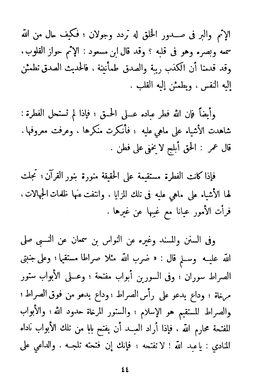 الْإِثْمُ وَالْبِرُّ فِي صُدُورِ الْخَلْقِ لَهُ تَرَدُّدٌ وَجَوَلَانٌ؛ فَكَيْفَ حَالُ مَنْ اللَّهُ سَمْعُهُ وَبَصَرُهُ وَهُوَ فِي قَلْبِهِ. وَقَدْ قَالَ ابْنُ مَسْعُودٍ: الْإِثْمُ حواز الْقُلُوبِ وَقَدْ قَدَّمْنَا أَنَّ الْكَذِبَ رِيبَةٌ وَالصِّدْقَ طُمَأْنِينَةٌ فَالْحَدِيثُ الصِّدْقُ تَطْمَئِنُّ إلَيْهِ النَّفْسُ وَيَطْمَئِنُّ إلَيْهِ الْقَلْبُ. وَأَيْضًا فَإِنَّ اللَّهَ فَطَرَ عِبَادَهُ عَلَى الْحَقِّ؛ فَإِذَا لَمْ تَسْتَحِلَّ الْفِطْرَةُ: شَاهَدَتْ الْأَشْيَاءَ عَلَى مَا هِيَ عَلَيْهِ؛ فَأَنْكَرَتْ مُنْكِرَهَا وَعَرَّفَتْ مَعْرُوفَهَا. قَالَ عُمَرُ: الْحَقُّ أَبْلَجُ لَا يَخْفَى عَلَى فَطِنٍ. فَإِذَا كَانَتْ الْفِطْرَةُ مُسْتَقِيمَةً عَلَى الْحَقِيقَةِ مُنَوَّرَةً بِنُورِ الْقُرْآنِ. تَجَلَّتْ لَهَا الْأَشْيَاءُ عَلَى مَا هِيَ عَلَيْهِ فِي تِلْكَ الْمَزَايَا وَانْتَفَتْ عَنْهَا ظُلُمَاتُ الْجَهَالَاتِ فَرَأَتْ الْأُمُورَ عِيَانًا مَعَ غَيْبِهَا عَنْ غَيْرِهَا. وَفِي السُّنَنِ وَالْمُسْنَدِ وَغَيْرِهِ عَنْ النَّوَّاسِ بْنِ سَمْعَانَ عَنْ النَّبِيِّ صَلَّى اللَّهُ عَلَيْهِ وَسَلَّمَ قَالَ: {ضَرَبَ اللَّهُ مَثَلًا صِرَاطًا مُسْتَقِيمًا؛ وَعَلَى جَنَبَتَيْ الصِّرَاطِ سُورَانِ؛ وَفِي السُّورَيْنِ أَبْوَابٌ مُفَتَّحَةٌ؛ وَعَلَى الْأَبْوَابِ سُتُورٌ مُرْخَاةٌ؛ وَدَاعٍ يَدْعُو عَلَى رَأْسِ الصِّرَاطِ. وَدَاعٍ يَدْعُو مِنْ فَوْقِ الصِّرَاطِ؛ وَالصِّرَاطُ الْمُسْتَقِيمُ هُوَ الْإِسْلَامُ؛ وَالسُّتُورُ الْمُرْخَاةُ حُدُودُ اللَّهِ؛ وَالْأَبْوَابُ الْمُفَتَّحَةُ مَحَارِمُ اللَّهِ فَإِذَا أَرَادَ الْعَبْدُ أَنْ يَفْتَحَ بَابًا مِنْ تِلْكَ الْأَبْوَابِ نَادَاهُ الْمُنَادِي: يَا عَبْدَ اللَّهِ لَا تَفْتَحْهُ؛ فَإِنَّك إنْ فَتَحْته تَلِجْهُ. وَالدَّاعِي عَلَى رَأْسِ