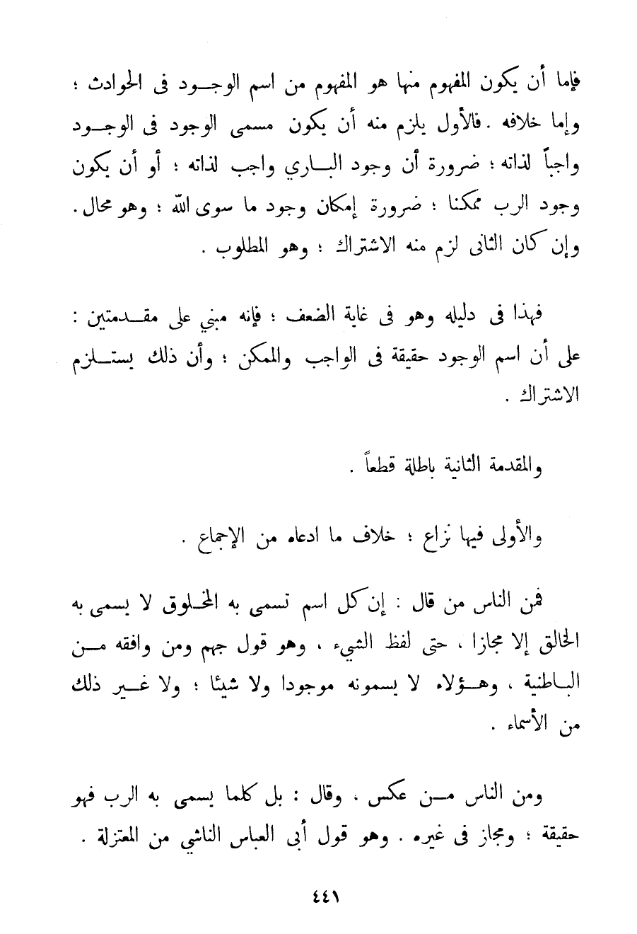 فَإِمَّا أَنْ يَكُونَ الْمَفْهُومُ مِنْهَا هُوَ الْمَفْهُومُ مِنْ اسْمِ الْوُجُودِ فِي الْحَوَادِثِ؛ وَإِمَّا خِلَافُهُ. فَالْأَوَّلُ يَلْزَمُ مِنْهُ أَنْ يَكُونَ مُسَمَّى الْوُجُودِ فِي الْوُجُودِ وَاجِبًا لِذَاتِهِ؛ ضَرُورَةَ أَنَّ وُجُودَ الْبَارِي وَاجِبٌ لِذَاتِهِ؛ أَوْ أَنْ يَكُونَ وُجُودُ الرَّبِّ مُمْكِنًا؛ ضَرُورَةَ إمْكَانِ وُجُودِ مَا سِوَى اللَّهِ؛ وَهُوَ مُحَالٌ. وَإِنْ كَانَ الثَّانِيَ لَزِمَ مِنْهُ الِاشْتِرَاكُ؛ وَهُوَ الْمَطْلُوبُ. فَهَذَا فِي دَلِيلِهِ وَهُوَ فِي غَايَةِ الضَّعْفِ؛ فَإِنَّهُ مَبْنِيٌّ عَلَى مُقَدِّمَتَيْنِ: عَلَى أَنَّ اسْمَ الْوُجُودِ حَقِيقَةٌ فِي الْوَاجِبِ وَالْمُمْكِنِ؛ وَأَنَّ ذَلِكَ يَسْتَلْزِمُ الِاشْتِرَاكَ. وَالْمُقَدِّمَةُ الثَّانِيَةُ بَاطِلَةٌ قَطْعًا. وَالْأُولَى فِيهَا نِزَاعٌ؛ خِلَافُ مَا ادَّعَاهُ مِنْ الْإِجْمَاعِ. فَمِنْ النَّاسِ مَنْ قَالَ: إنَّ كُلَّ اسْمٍ تَسَمَّى بِهِ الْمَخْلُوقُ لَا يُسَمَّى بِهِ الْخَالِقُ إلَّا مَجَازًا حَتَّى لَفْظِ الشَّيْءِ وَهُوَ قَوْلُ جَهْمٍ وَمَنْ وَافَقَهُ مِنْ الْبَاطِنِيَّةِ وَهَؤُلَاءِ لَا يُسَمُّونَهُ مَوْجُودًا وَلَا شَيْئًا؛ وَلَا غَيْرَ ذَلِكَ مِنْ الْأَسْمَاءِ. وَمِنْ النَّاسِ مَنْ عَكَسَ وَقَالَ: بَلْ كُلَّمَا يُسَمَّى بِهِ الرَّبُّ فَهُوَ حَقِيقَةٌ؛ وَمَجَازٌ فِي غَيْرِهِ. وَهُوَ قَوْلُ أَبِي الْعَبَّاسِ النَّاشِي مِنْ الْمُعْتَزِلَةِ.