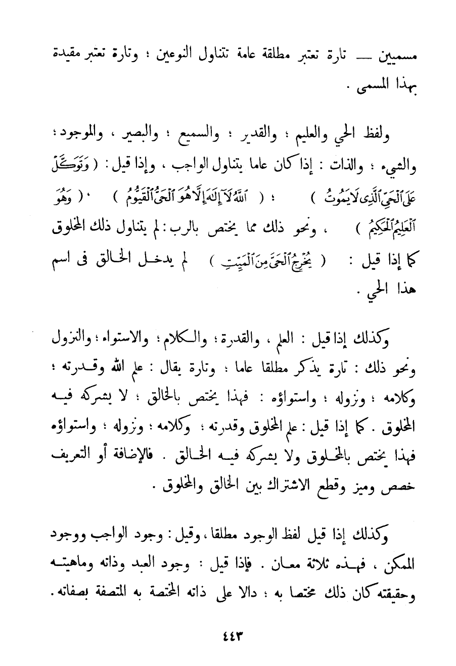 مُسَمَّيَيْنِ - تَارَةً تُعْتَبَرُ مُطْلَقَةً عَامَّةً تَتَنَاوَلُ النَّوْعَيْنِ؛ وَتَارَةً تُعْتَبَرُ مُقَيَّدَةً بِهَذَا الْمُسَمَّى. وَلَفْظُ الْحَيِّ وَالْعَلِيمِ؛ وَالْقَدِيرِ؛ وَالسَّمِيعِ؛ وَالْبَصِيرِ وَالْمَوْجُودِ؛ وَالشَّيْءِ؛ وَالذَّاتِ: إذَا كَانَ عَامًّا يَتَنَاوَلُ الْوَاجِبَ وَإِذَا قِيلَ: {وَتَوَكَّلْ عَلَى الْحَيِّ الَّذِي لَا يَمُوتُ} {اللَّهُ لَا إلَهَ إلَّا هُوَ الْحَيُّ الْقَيُّومُ} {وَهُوَ الْعَلِيمُ الْحَكِيمُ} وَنَحْوُ ذَلِكَ مِمَّا يَخْتَصُّ بِالرَّبِّ: لَمْ يَتَنَاوَلْ ذَلِكَ الْمَخْلُوقَ كَمَا إذَا قِيلَ: {يُخْرِجُ الْحَيَّ مِنَ الْمَيِّتِ} لَمْ يَدْخُلْ الْخَالِقُ فِي اسْمِ هَذَا الْحَيِّ. وَكَذَلِكَ إذَا قِيلَ: الْعِلْمُ وَالْقُدْرَةُ؛ وَالْكَلَامُ؛ وَالِاسْتِوَاءُ؛ وَالنُّزُولُ وَنَحْوُ ذَلِكَ: تَارَةً يُذْكَرُ مُطْلَقًا عَامًّا: وَتَارَةً يُقَالُ: عِلْمُ اللَّهِ وَقُدْرَتُهُ؛ وَكَلَامُهُ؛ وَنُزُولُهُ؛ وَاسْتِوَاؤُهُ: فَهَذَا يَخْتَصُّ بِالْخَالِقِ؛ لَا يَشْرَكُهُ فِيهِ الْمَخْلُوقُ. كَمَا إذَا قِيلَ: عِلْمُ الْمَخْلُوقِ وَقُدْرَتُهُ: وَكَلَامُهُ؛ وَنُزُولُهُ؛ وَاسْتِوَاؤُهُ فَهَذَا يَخْتَصُّ بِالْمَخْلُوقِ وَلَا يَشْرَكُهُ فِيهِ الْخَالِقُ. فَالْإِضَافَةُ أَوْ التَّعْرِيفُ خَصَّصَ وَمَيَّزَ وَقَطَعَ الِاشْتِرَاكَ بَيْنَ الْخَالِقِ وَالْمَخْلُوقِ. وَكَذَلِكَ إذَا قِيلَ لَفْظُ الْوُجُودِ مُطْلَقًا وَقِيلَ: وُجُودُ الْوَاجِبِ وَوُجُودُ الْمُمْكِنِ فَهَذِهِ ثَلَاثَةُ مَعَانٍ. فَإِذَا قِيلَ: وُجُودُ الْعَبْدِ وَذَاتُهُ وَمَاهِيَّتُه وَحَقِيقَتُهُ كَانَ ذَلِكَ مُخْتَصًّا بِهِ دَالًّا عَلَى ذَاتِهِ الْمُخْتَصَّةِ بِهِ الْمُتَّصِفَةِ بِصِفَاتِهِ.