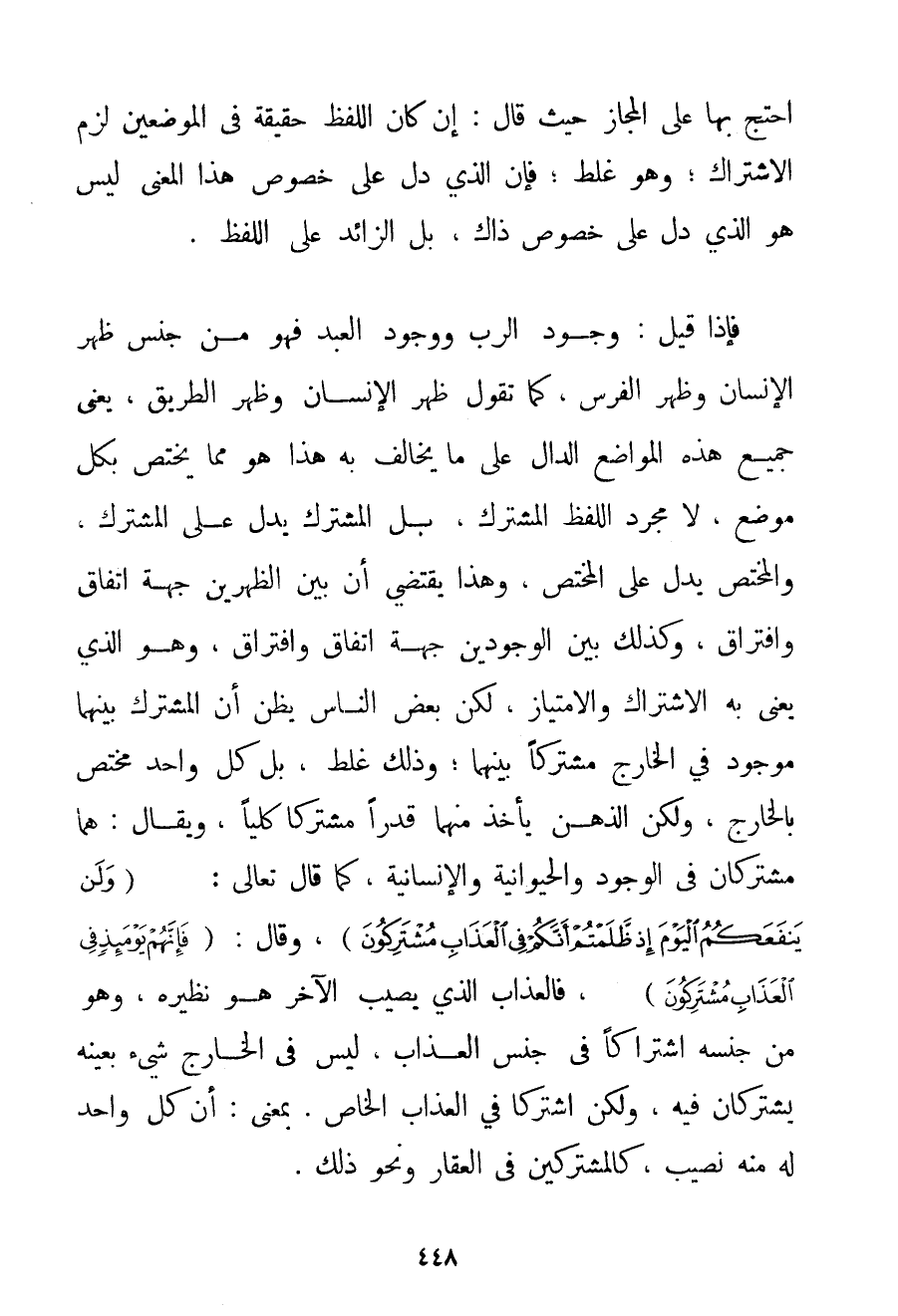 احْتَجَّ بِهَا عَلَى الْمَجَازِ حَيْثُ قَالَ: إنْ كَانَ اللَّفْظُ حَقِيقَةً فِي الْمَوْضِعَيْنِ لَزِمَ الِاشْتِرَاكُ؛ وَهُوَ غَلَطٌ؛ فَإِنَّ الَّذِي دَلَّ عَلَى خُصُوصِ هَذَا الْمَعْنَى لَيْسَ هُوَ الَّذِي دَلَّ عَلَى خُصُوصِ ذَاكَ بَلْ الزَّائِدُ عَلَى اللَّفْظِ. فَإِذَا قِيلَ: وُجُودُ الرَّبِّ وَوُجُودُ الْعَبْدِ فَهُوَ مِنْ جِنْسِ ظَهْرِ الْإِنْسَانِ وَظَهْرِ الْفَرَسِ كَمَا تَقُولُ ظَهْرَ الْإِنْسَانِ وَظَهْرَ الطَّرِيقِ يَعْنِي جَمِيعَ هَذِهِ الْمَوَاضِعِ الدَّالِّ عَلَى مَا يُخَالِفُ بِهِ هَذَا هُوَ مِمَّا يَخْتَصُّ بِكُلِّ مَوْضِعٍ لَا مُجَرَّدَ اللَّفْظِ الْمُشْتَرَكِ بَلْ الْمُشْتَرَكُ يَدُلُّ عَلَى الْمُشْتَرَكِ. وَالْمُخْتَصُّ يَدُلُّ عَلَى الْمُخْتَصِّ وَهَذَا يَقْتَضِي أَنَّ بَيْنَ الظَّهْرَيْنِ جِهَةَ اتِّفَاقٍ وَافْتِرَاقٍ وَكَذَلِكَ بَيْن الْوُجُودَيْنِ جِهَةُ اتِّفَاقٍ وَافْتِرَاقٍ وَهُوَ الَّذِي يَعْنِي بِهِ الِاشْتِرَاكَ وَالِامْتِيَازَ لَكِنَّ بَعْضَ النَّاسِ يَظُنُّ أَنَّ الْمُشْتَرَكَ بَيْنَهُمَا مَوْجُودٌ فِي الْخَارِجِ مُشْتَرَكًا بَيْنَهُمَا؛ وَذَلِكَ غَلَطٌ بَلْ كُلُّ وَاحِدٍ مُخْتَصٌّ بِالْخَارِجِ وَلَكِنَّ الذِّهْنَ يَأْخُذُ مِنْهُمَا قَدْرًا مُشْتَرَكًا كُلِّيًّا وَيُقَالُ: هُمَا مُشْتَرِكَانِ فِي الْوُجُودِ والحيوانية والإنسانية كَمَا قَالَ تَعَالَى: {وَلَنْ يَنْفَعَكُمُ الْيَوْمَ إذْ ظَلَمْتُمْ أَنَّكُمْ فِي الْعَذَابِ مُشْتَرِكُونَ} وَقَالَ: {فَإِنَّهُمْ يَوْمَئِذٍ فِي الْعَذَابِ مُشْتَرِكُونَ} فَالْعَذَابُ الَّذِي يُصِيبُ الْآخَرَ هُوَ نَظِيرُهُ وَهُوَ مِنْ جِنْسِهِ اشْتِرَاكًا فِي جِنْسِ الْعَذَابِ لَيْسَ فِي الْخَارِجِ شَيْءٌ بِعَيْنِهِ يَشْتَرِكَانِ فِيهِ وَلَكِنْ اشْتَرَكَا فِي الْعَذَابِ الْخَاصِّ. بِمَعْنَى: أَنَّ كُلَّ وَاحِدٍ لَهُ مِنْهُ نَصِيبٌ كَالْمُشْتَرَكِينَ فِي الْعَقَارِ وَنَحْوِ ذَلِكَ.