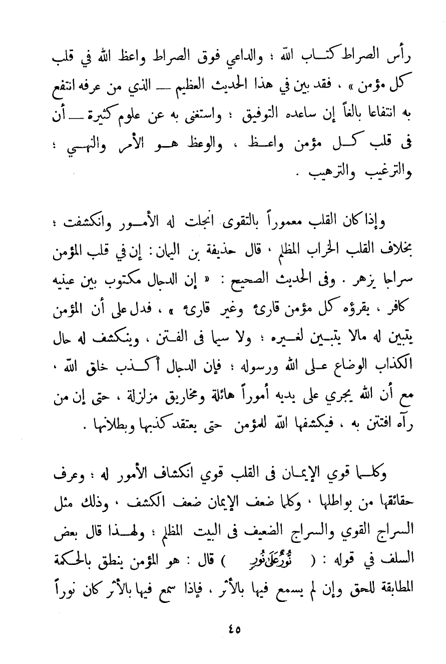 الصِّرَاطِ كِتَابُ اللَّهِ؛ وَالدَّاعِي فَوْقَ الصِّرَاطِ وَاعِظُ اللَّهِ فِي قَلْبِ كُلِّ مُؤْمِنٍ} فَقَدْ بَيَّنَ فِي هَذَا الْحَدِيثِ الْعَظِيمِ - الَّذِي مَنْ عَرَفَهُ انْتَفَعَ بِهِ انْتِفَاعًا بَالِغًا إنْ سَاعَدَهُ التَّوْفِيقُ؛ وَاسْتَغْنَى بِهِ عَنْ عُلُومٍ كَثِيرَةٍ - أَنَّ فِي قَلْبِ كُلِّ مُؤْمِنٍ وَاعِظًا وَالْوَعْظُ هُوَ الْأَمْرُ وَالنَّهْيُ؛ وَالتَّرْغِيبُ وَالتَّرْهِيبُ. وَإِذَا كَانَ الْقَلْبُ مَعْمُورًا بِالتَّقْوَى انْجَلَتْ لَهُ الْأُمُورُ وَانْكَشَفَتْ؛ بِخِلَافِ الْقَلْبِ الْخَرَابِ الْمُظْلِمِ؛ قَالَ حُذَيْفَةُ بْنُ الْيَمَانِ: إنَّ فِي قَلْبِ الْمُؤْمِنِ سِرَاجًا يُزْهِرُ. وَفِي الْحَدِيثِ الصَّحِيحِ: " {إنَّ الدَّجَّالَ مَكْتُوبٌ بَيْنَ عَيْنَيْهِ كَافِرٌ يَقْرَؤُهُ كُلُّ مُؤْمِنٍ قَارِئٍ وَغَيْرِ قَارِئٍ} فَدَلَّ عَلَى أَنَّ الْمُؤْمِنَ يَتَبَيَّنُ لَهُ مَا لَا يَتَبَيَّنُ لِغَيْرِهِ؛ وَلَا سِيَّمَا فِي الْفِتَنِ وَيَنْكَشِفُ لَهُ حَالُ الْكَذَّابِ الْوَضَّاعِ عَلَى اللَّهِ وَرَسُولِهِ؛ فَإِنَّ الدَّجَّالَ أَكْذَبُ خَلْقِ اللَّهِ مَعَ أَنَّ اللَّهَ يُجْرِي عَلَى يَدَيْهِ أُمُورًا هَائِلَةً ومخاريق مُزَلْزِلَةً حَتَّى إنَّ مَنْ رَآهُ افْتَتَنَ بِهِ فَيَكْشِفُهَا اللَّهُ لِلْمُؤْمِنِ حَتَّى يَعْتَقِدَ كَذِبَهَا وَبُطْلَانَهَا. وَكُلَّمَا قَوِيَ الْإِيمَانُ فِي الْقَلْبِ قَوِيَ انْكِشَافُ الْأُمُورِ لَهُ؛ وَعَرَفَ حَقَائِقَهَا مِنْ بَوَاطِلِهَا وَكُلَّمَا ضَعُفَ الْإِيمَانُ ضَعُفَ الْكَشْفُ وَذَلِكَ مَثَلُ السِّرَاجِ الْقَوِيِّ وَالسِّرَاجِ الضَّعِيفِ فِي الْبَيْتِ الْمُظْلِمِ؛ وَلِهَذَا قَالَ بَعْضُ السَّلَفِ فِي قَوْلِهِ: {نُورٌ عَلَى نُورٍ} قَالَ: هُوَ الْمُؤْمِنُ يَنْطِقُ بِالْحِكْمَةِ الْمُطَابِقَةِ لِلْحَقِّ وَإِنْ لَمْ يَسْمَعْ فِيهَا بِالْأَثَرِ فَإِذَا سَمِعَ فِيهَا بِالْأَثَرِ كَانَ نُورًا
