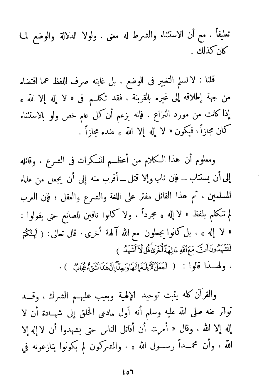 تَعْلِيقًا مَعَ أَنَّ الِاسْتِثْنَاءَ وَالشَّرْطَ لَهُ مَعْنًى. وَلَوْلَا الدَّلَالَةُ وَالْوَضْعُ لَمَا كَانَ كَذَلِكَ. قُلْنَا: لَا نُسَلِّمُ التَّغْيِيرَ فِي الْوَضْعِ بَلْ غَايَتُهُ صَرْفُ اللَّفْظِ عَمَّا اقْتَضَاهُ مِنْ جِهَةِ إطْلَاقِهِ إلَى غَيْرِهِ بِالْقَرِينَةِ فَقَدْ تَكَلَّمَ فِي " لَا إلَهَ إلَّا اللَّهُ " إذَا كَانَتْ مِنْ مَوْرِدِ النِّزَاعِ فَإِنَّهُ يَزْعُمُ أَنَّ كُلَّ عَامٍّ خُصَّ وَلَوْ بِالِاسْتِثْنَاءِ كَانَ مَجَازًا؛ فَيَكُونُ " لَا إلَهَ إلَّا اللَّهُ " عِنْدَهُ مَجَازًا. وَمَعْلُومٌ أَنَّ هَذَا الْكَلَامَ مِنْ أَعْظَمِ الْمُنْكَرَاتِ فِي الشَّرْعِ وَقَائِلُهُ إلَى أَنْ يُسْتَتَابَ - فَإِنْ تَابَ وَإِلَّا قُتِلَ - أَقْرَبُ مِنْهُ إلَى أَنْ يُجْعَلَ مِنْ عُلَمَاءِ الْمُسْلِمِينَ ثُمَّ هَذَا الْقَائِلُ مُفْتَرٍ عَلَى اللُّغَةِ وَالشَّرْعِ وَالْعَقْلِ؛ فَإِنَّ الْعَرَبَ لَمْ تَتَكَلَّمْ بِلَفْظِ " لَا إلَهَ " مُجَرَّدًا وَلَا كَانُوا نَافِينَ لِلصَّانِعِ حَتَّى يَقُولُوا: " لَا إلَهَ " بَلْ كَانُوا يَجْعَلُونَ مَعَ اللَّهِ آلِهَةً أُخْرَى قَالَ تَعَالَى: {أَئِنَّكُمْ لَتَشْهَدُونَ أَنَّ مَعَ اللَّهِ آلِهَةً أُخْرَى قُلْ لَا أَشْهَدُ} وَلِهَذَا قَالُوا: {أَجَعَلَ الْآلِهَةَ إلَهًا وَاحِدًا إنَّ هَذَا لَشَيْءٌ عُجَابٌ} . وَالْقُرْآنُ كُلُّهُ يُثْبِتُ تَوْحِيدَ الْإِلَهِيَّةِ وَيَعِيبُ عَلَيْهِمْ الشِّرْكَ وَقَدْ تَوَاتَرَ عَنْهُ صَلَّى اللَّهُ عَلَيْهِ وَسَلَّمَ أَنَّهُ أَوَّلُ مَا دَعَا الْخَلْقَ إلَى شَهَادَةِ أَنْ لَا إلَهَ إلَّا اللَّهُ وَقَالَ {أُمِرْت أَنْ أُقَاتِلَ النَّاسَ حَتَّى يَشْهَدُوا أَنْ لَا إلَهَ إلَّا اللَّهُ وَأَنَّ مُحَمَّدًا رَسُولُ اللَّهِ} وَالْمُشْرِكُونَ لَمْ يَكُونُوا يُنَازِعُونَهُ فِي