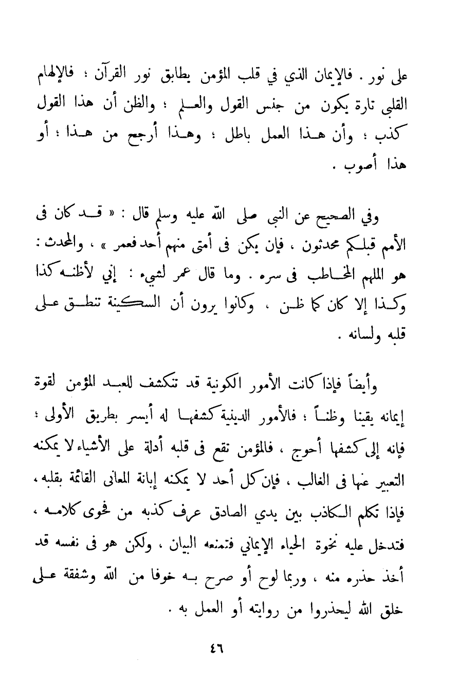 عَلَى نُورٍ. فَالْإِيمَانُ الَّذِي فِي قَلْبِ الْمُؤْمِنِ يُطَابِقُ نُورَ الْقُرْآنِ؛ فَالْإِلْهَامُ الْقَلْبِيُّ تَارَةً يَكُونُ مِنْ جِنْسِ الْقَوْلِ وَالْعِلْمِ؛ وَالظَّنُّ أَنَّ هَذَا الْقَوْلَ كَذِبٌ. وَأَنَّ هَذَا الْعَمَلَ بَاطِلٌ؛ وَهَذَا أَرْجَحُ مِنْ هَذَا؛ أَوْ هَذَا أَصْوَبُ. وَفِي الصَّحِيح عَنْ النَّبِيِّ صَلَّى اللَّهُ عَلَيْهِ وَسَلَّمَ قَالَ: {قَدْ كَانَ فِي الْأُمَمِ قَبْلَكُمْ مُحَدِّثُونَ فَإِنْ يَكُنْ فِي أُمَّتِي مِنْهُمْ أَحَدٌ فَعُمَرُ} . وَالْمُحَدِّثُ: هُوَ الْمُلْهَمُ الْمُخَاطَبُ فِي سِرِّهِ. وَمَا قَالَ عُمَرُ لِشَيْءِ: إنِّي لَأَظُنّهُ كَذَا وَكَذَا إلَّا كَانَ كَمَا ظَنَّ وَكَانُوا يَرَوْنَ أَنَّ السَّكِينَةَ تَنْطِقُ عَلَى قَلْبِهِ وَلِسَانِهِ. وَأَيْضًا فَإِذَا كَانَتْ الْأُمُورُ الْكَوْنِيَّةُ قَدْ تَنْكَشِفُ لِلْعَبْدِ الْمُؤْمِنِ لِقُوَّةِ إيمَانِهِ يَقِينًا وَظَنًّا؛ فَالْأُمُورُ الدِّينِيَّةُ كَشْفُهَا لَهُ أَيْسَرُ بِطَرِيقِ الْأَوْلَى؛ فَإِنَّهُ إلَى كَشْفِهَا أَحْوَجُ فَالْمُؤْمِنُ تَقَعُ فِي قَلْبِهِ أَدِلَّةٌ عَلَى الْأَشْيَاءِ لَا يُمْكِنُهُ التَّعْبِيرُ عَنْهَا فِي الْغَالِبِ فَإِنَّ كُلَّ أَحَدٍ لَا يُمْكِنُهُ إبَانَةُ الْمَعَانِي الْقَائِمَةِ بِقَلْبِهِ فَإِذَا تَكَلَّمَ الْكَاذِبُ بَيْنَ يَدَيْ الصَّادِقِ عَرَفَ كَذِبَهُ مِنْ فَحْوَى كَلَامِهِ فَتَدْخُلُ عَلَيْهِ نَخْوَةُ الْحَيَاءِ الْإِيمَانِيِّ فَتَمْنَعُهُ الْبَيَانَ وَلَكِنْ هُوَ فِي نَفْسِهِ قَدْ أَخَذَ حِذْرَهُ مِنْهُ وَرُبَّمَا لَوَّحَ أَوْ صَرَّحَ بِهِ خَوْفًا مِنْ اللَّهِ وَشَفَقَةً عَلَى خَلْقِ اللَّهِ لِيَحْذَرُوا مِنْ رِوَايَتِهِ أَوْ الْعَمَلِ بِهِ.
