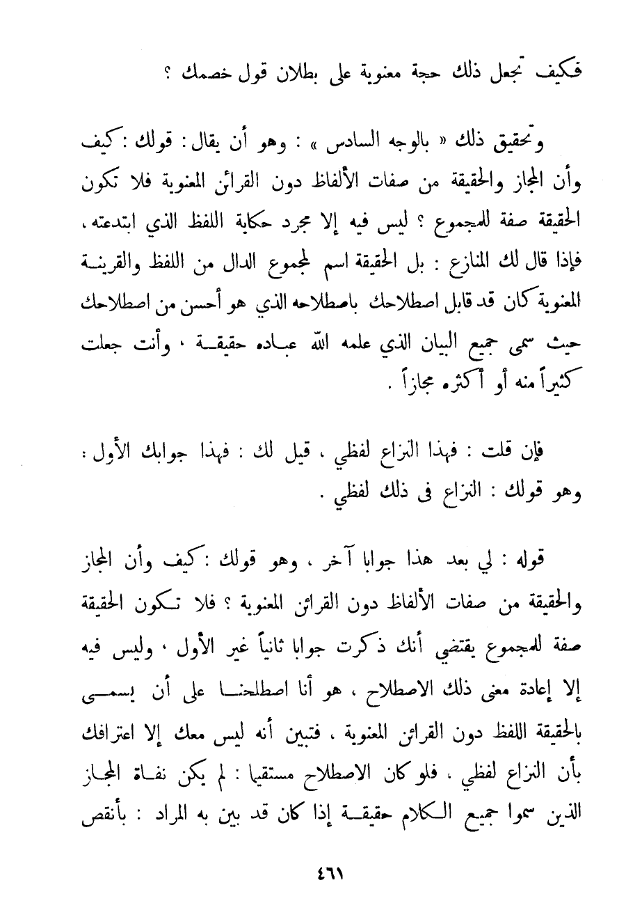 فَكَيْفَ تَجْعَلُ ذَلِكَ حُجَّةً مَعْنَوِيَّةً عَلَى بُطْلَانِ قَوْلِ خَصْمِك؟ وَتَحْقِيقُ ذَلِكَ " بِالْوَجْهِ السَّادِسِ ": وَهُوَ أَنْ يُقَالَ: قَوْلُك: كَيْفَ وَأَنَّ الْمَجَازَ وَالْحَقِيقَةَ مِنْ صِفَاتِ الْأَلْفَاظِ دُونَ الْقَرَائِنِ الْمَعْنَوِيَّةِ فَلَا تَكُونُ الْحَقِيقَةُ صِفَةً لِلْمَجْمُوعِ؟ لَيْسَ فِيهِ إلَّا مُجَرَّدُ حِكَايَةِ اللَّفْظِ الَّذِي ابْتَدَعْته فَإِذَا قَالَ لَك الْمُنَازِعُ: بَلْ الْحَقِيقَةُ اسْمٌ لِمَجْمُوعِ الدَّالِّ مِنْ اللَّفْظِ وَالْقَرِينَةِ الْمَعْنَوِيَّةِ كَانَ قَدْ قَابَلَ اصْطِلَاحَك بِاصْطِلَاحِهِ الَّذِي هُوَ أَحْسَنُ مِنْ اصْطِلَاحِك حَيْثُ سَمَّى جَمِيعَ الْبَيَانِ الَّذِي عَلَّمَهُ اللَّهُ عِبَادَهُ حَقِيقَةً وَأَنْتَ جَعَلْت كَثِيرًا مِنْهُ أَوْ أَكْثَرَهُ مَجَازًا. فَإِنْ قُلْت: فَهَذَا النِّزَاعُ لَفْظِيٌّ قِيلَ لَك: فَهَذَا جَوَابُك الْأَوَّلُ؛ وَهُوَ قَوْلُك: النِّزَاعُ فِي ذَلِكَ لَفْظِيٌّ. قَوْلُهُ: لِي بَعْدَ هَذَا جَوَابٌ آخَرُ؛ وَهُوَ قَوْلُك: كَيْفَ وَأَنَّ الْمَجَازَ وَالْحَقِيقَةَ مِنْ صِفَاتِ الْأَلْفَاظِ دُونَ الْقَرَائِنِ الْمَعْنَوِيَّةِ؟ فَلَا تَكُونُ الْحَقِيقَةُ صِفَةً لِلْمَجْمُوعِ يَقْتَضِي أَنَّك ذَكَرْت جَوَابًا ثَانِيًا غَيْرَ الْأَوَّلِ وَلَيْسَ فِيهِ إلَّا إعَادَةُ مَعْنَى ذَلِكَ الِاصْطِلَاحِ هُوَ أَنَّا اصْطَلَحْنَا عَلَى أَنْ يُسَمَّى بِالْحَقِيقَةِ اللَّفْظُ دُونَ الْقَرَائِنِ الْمَعْنَوِيَّةِ فَتَبَيَّنَ أَنَّهُ لَيْسَ مَعَك إلَّا اعْتِرَافُك بِأَنَّ النِّزَاعَ لَفْظِيٌّ فَلَوْ كَانَ الِاصْطِلَاحُ مُسْتَقِيمًا: لَمْ يَكُنْ نفاة الْمَجَازِ الَّذِينَ سَمَّوْا جَمِيعَ الْكَلَامِ حَقِيقَةً إذَا كَانَ قَدْ بَيَّنَ بِهِ الْمُرَادَ: بِأَنْقَصَ