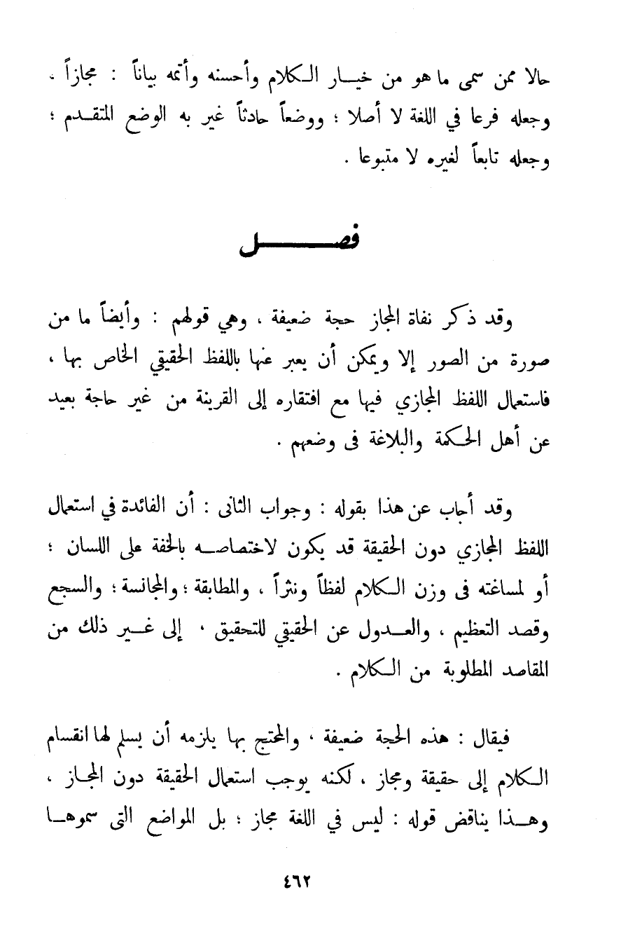 وَقَدْ ذَكَرَ نُفَاةِ الْمَجَازِ حُجَّةً ضَعِيفَةً وَهِيَ قَوْلُهُمْ: وَأَيْضًا مَا مِنْ صُورَةٍ مِنْ الصُّوَرِ إلَّا وَيُمْكِنُ أَنْ يُعَبَّرَ عَنْهَا بِاللَّفْظِ الْحَقِيقِيِّ الْخَاصِّ بِهَا فَاسْتِعْمَالُ اللَّفْظِ الْمَجَازِيِّ فِيهَا مَعَ افْتِقَارِهِ إلَى الْقَرِينَةِ مِنْ غَيْرِ حَاجَةٍ بَعِيدٌ عَنْ أَهْلِ الْحِكْمَةِ وَالْبَلَاغَةِ فِي وَضْعِهِمْ. وَقَدْ أَجَابَ عَنْ هَذَا بِقَوْلِهِ: وَجَوَابُ الثَّانِي: أَنَّ الْفَائِدَةَ فِي اسْتِعْمَالِ اللَّفْظِ الْمَجَازِيِّ دُونَ الْحَقِيقَةِ قَدْ يَكُونُ لِاخْتِصَاصِهِ بِالْخِفَّةِ عَلَى اللِّسَانِ؛ أَوْ لِمُسَاغَتِهِ فِي وَزْنِ الْكَلَامِ لَفْظًا وَنَثْرًا وَالْمُطَابَقَةِ؛ وَالْمُجَانَسَةِ؛ وَالسَّجْعِ وَقَصْدِ التَّعْظِيمِ وَالْعُدُولِ عَنْ الْحَقِيقِيِّ لِلتَّحْقِيقِ إلَى غَيْرِ ذَلِكَ مِنْ الْمَقَاصِدِ الْمَطْلُوبَةِ مِنْ الْكَلَامِ. فَيُقَالُ: هَذِهِ الْحُجَّةُ ضَعِيفَةٌ وَالْمُحْتَجُّ بِهَا يَلْزَمُهُ أَنْ يُسَلِّمَ لَهَا انْقِسَامَ الْكَلَامِ إلَى حَقِيقَةٍ وَمَجَازٍ لَكِنَّهُ يُوجِبُ اسْتِعْمَالَ الْحَقِيقَةِ دُونَ الْمَجَازِ وَهَذَا يُنَاقِضُ قَوْلَهُ: لَيْسَ فِي اللُّغَةِ مَجَازٌ؛ بَلْ الْمَوَاضِعُ الَّتِي سَمَّوْهَا