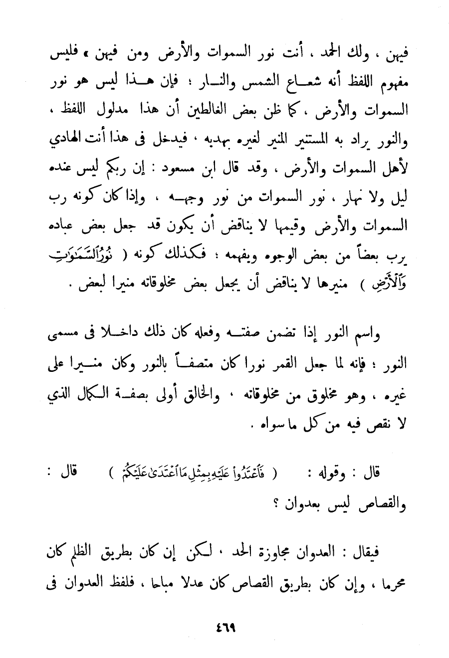 وَمَنْ فِيهِنَّ وَلَك الْحَمْدُ أَنْتَ نُورُ السَّمَوَاتِ وَالْأَرْضِ وَمَنْ فِيهِنَّ} فَلَيْسَ مَفْهُومُ اللَّفْظِ أَنَّهُ شُعَاعُ الشَّمْسِ وَالنَّارِ؛ فَإِنَّ هَذَا لَيْسَ هُوَ نُورُ السَّمَوَاتِ وَالْأَرْضِ كَمَا ظَنَّ بَعْضُ الغالطين أَنَّ هَذَا مَدْلُولُ اللَّفْظِ وَالنُّورُ يُرَادُ بِهِ الْمُسْتَنِيرُ الْمُنِيرُ لِغَيْرِهِ بِهَدْيِهِ فَيَدْخُلُ فِي هَذَا أَنْتَ الْهَادِي لِأَهْلِ السَّمَوَاتِ وَالْأَرْضِ وَقَدْ قَالَ ابْنُ مَسْعُودٍ: إنَّ رَبَّكُمْ لَيْسَ عِنْدَهُ لَيْلٌ وَلَا نَهَارٌ نُورُ السَّمَوَاتِ مِنْ نُورِ وَجْهِهِ وَإِذَا كَانَ كَوْنُهُ رَبَّ السَّمَوَاتِ وَالْأَرْضِ وَقَيِّمَهَا لَا يُنَاقِضُ أَنْ يَكُونَ قَدْ جَعَلَ بَعْضَ عِبَادِهِ يَرُبُّ بَعْضًا مِنْ بَعْضِ الْوُجُوهِ وَيَفْهَمُهُ؛ فَكَذَلِكَ كَوْنُهُ {اللَّهُ نُورُ السَّمَاوَاتِ وَالْأَرْضِ} مُنِيرُهَا لَا يُنَاقِضُ أَنْ يَجْعَلَ بَعْضَ مَخْلُوقَاتِهِ مُنِيرًا لِبَعْضِ. وَاسْمُ النُّورِ إذَا تَضَمَّنَ صِفَتَهُ وَفِعْلَهُ كَانَ ذَلِكَ دَاخِلًا فِي مُسَمَّى النُّورِ؛ فَإِنَّهُ لَمَّا جَعَلَ الْقَمَرَ نُورًا كَانَ مُتَّصِفًا بِالنُّورِ وَكَانَ مُنِيرًا عَلَى غَيْرِهِ وَهُوَ مَخْلُوقٌ مِنْ مَخْلُوقَاتِهِ وَالْخَالِقُ أَوْلَى بِصِفَةِ الْكَمَالِ الَّذِي لَا نَقْصَ فِيهِ مِنْ كُلِّ مَا سِوَاهُ.