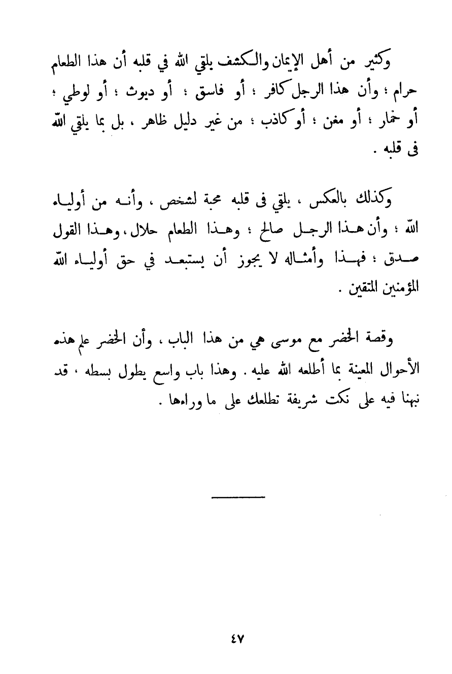 وَكَثِيرٌ مِنْ أَهْلِ الْإِيمَانِ وَالْكَشْفِ يُلْقِي اللَّهُ فِي قَلْبِهِ أَنَّ هَذَا الطَّعَامَ حَرَامٌ؛ وَأَنَّ هَذَا الرَّجُلَ كَافِرٌ؛ أَوْ فَاسِقٌ؛ أَوْ دَيُّوثٌ؛ أَوْ لُوطِيٌّ؛ أَوْ خَمَّارٌ؛ أَوْ مُغَنٍّ؛ أَوْ كَاذِبٌ؛ مِنْ غَيْرِ دَلِيلٍ ظَاهِرٍ بَلْ بِمَا يُلْقِي اللَّهُ فِي قَلْبِهِ. وَكَذَلِكَ بِالْعَكْسِ يُلْقِي فِي قَلْبِهِ مَحَبَّةً لِشَخْصِ وَأَنَّهُ مِنْ أَوْلِيَاءِ اللَّهِ؛ وَأَنَّ هَذَا الرَّجُلَ صَالِحٌ؛ وَهَذَا الطَّعَامَ حَلَالٌ وَهَذَا الْقَوْلَ صِدْقٌ؛ فَهَذَا وَأَمْثَالُهُ لَا يَجُوزُ أَنْ يُسْتَبْعَدَ فِي حَقِّ أَوْلِيَاءِ اللَّهِ الْمُؤْمِنِينَ الْمُتَّقِينَ. وَقِصَّةُ الْخَضِرِ مَعَ مُوسَى هِيَ مِنْ هَذَا الْبَابِ وَأَنَّ الْخَضِرَ عَلِمَ هَذِهِ الْأَحْوَالَ الْمُعَيَّنَةَ بِمَا أَطْلَعَهُ اللَّهُ عَلَيْهِ. وَهَذَا بَابٌ وَاسِعٌ يَطُولُ بَسْطُهُ قَدْ نَبَّهْنَا فِيهِ عَلَى نُكَتٍ شَرِيفَةٍ تُطْلِعُك عَلَى مَا وَرَاءَهَا.