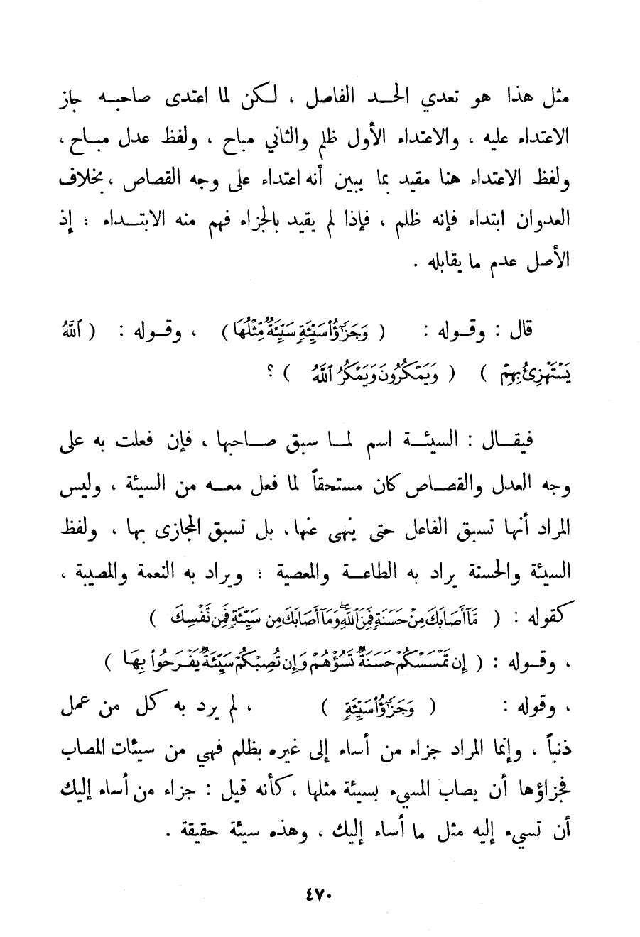 قَالَ: وَقَوْلُهُ: {وَجَزَاءُ سَيِّئَةٍ سَيِّئَةٌ مِثْلُهَا} وَقَوْلُهُ: {اللَّهُ يَسْتَهْزِئُ بِهِمْ} {وَيَمْكُرُونَ وَيَمْكُرُ اللَّهُ} ؟ فَيُقَالُ: السَّيِّئَةُ اسْمٌ لِمَا سَبَقَ صَاحِبُهَا فَإِنْ فُعِلَتْ بِهِ عَلَى وَجْهِ الْعَدْلِ وَالْقِصَاصِ كَانَ مُسْتَحِقًّا لِمَا فُعِلَ مَعَهُ مِنْ السَّيِّئَةِ وَلَيْسَ الْمُرَادُ أَنَّهَا تَسْبِقُ الْفَاعِلَ حَتَّى يُنْهَى عَنْهَا بَلْ تَسْبِقُ الْمُجَازَى بِهَا وَلَفْظُ السَّيِّئَةِ وَالْحَسَنَةِ يُرَادُ بِهِ الطَّاعَةُ وَالْمَعْصِيَةُ؛ وَيُرَادُ بِهِ النِّعْمَةُ وَالْمُصِيبَةُ كَقَوْلِهِ: {مَا أَصَابَكَ مِنْ حَسَنَةٍ فَمِنَ اللَّهِ وَمَا أَصَابَكَ مِنْ سَيِّئَةٍ فَمِنْ نَفْسِكَ} وَقَوْلِهِ: {إنْ تَمْسَسْكُمْ حَسَنَةٌ تَسُؤْهُمْ وَإِنْ تُصِبْكُمْ سَيِّئَةٌ يَفْرَحُوا بِهَا} ؟ وَقَوْلِهِ: {وَجَزَاءُ سَيِّئَةٍ} لَمْ يُرِدْ بِهِ كُلَّ مَنْ عَمِلَ ذَنْبًا وَإِنَّمَا الْمُرَادُ جَزَاءُ مَنْ أَسَاءَ إلَى غَيْرِهِ بِظُلْمِ فَهِيَ مِنْ سَيِّئَاتِ الْمُصَابِ فَجَزَاؤُهَا أَنْ يُصَابَ الْمُسِيءُ بِسَيِّئَةٍ مِثْلِهَا كَأَنَّهُ قِيلَ: جَزَاءُ مَنْ أَسَاءَ إلَيْك أَنْ تُسِيءَ إلَيْهِ مِثْلَ مَا أَسَاءَ إلَيْك وَهَذِهِ سَيِّئَةٌ حَقِيقَةً.