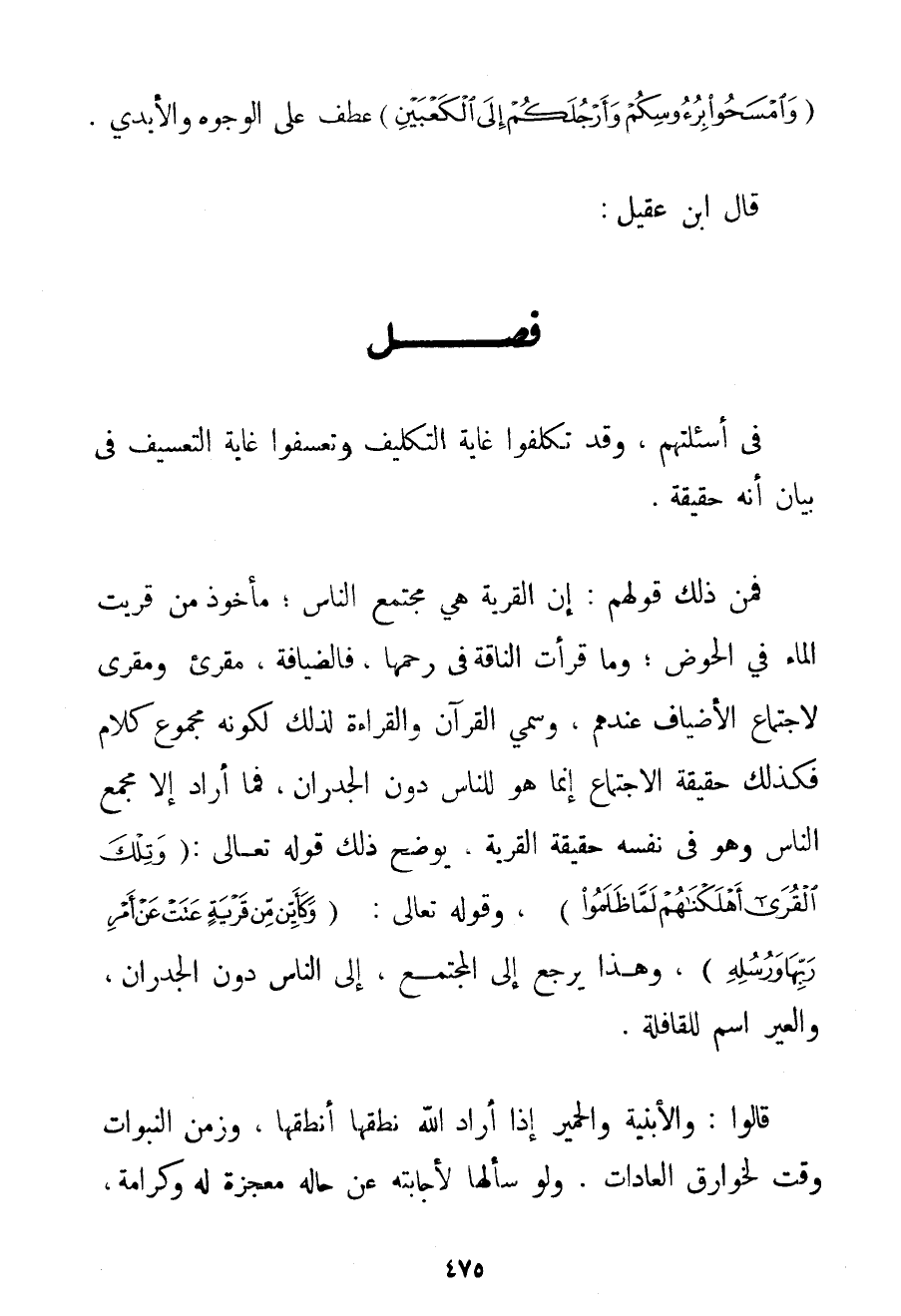 فَمِنْ ذَلِكَ قَوْلُهُمْ: إنَّ الْقَرْيَةَ هِيَ مُجْتَمَعُ النَّاسِ؛ مَأْخُوذٌ مِنْ قَرَيْت الْمَاءَ فِي الْحَوْضِ؛ وَمَا قَرَأَتْ النَّاقَةُ فِي رَحِمِهَا فَالضِّيَافَةُ مُقْرِئٌ وَمُقْرٍ لِاجْتِمَاعِ الْأَضْيَافِ عِنْدَهُمْ وَسُمِّيَ الْقُرْآنُ وَالْقِرَاءَةُ لِذَلِكَ لِكَوْنِهِ مَجْمُوعَ كَلَامٍ فَكَذَلِكَ حَقِيقَةُ الِاجْتِمَاعِ إنَّمَا هُوَ لِلنَّاسِ دُونَ الْجُدْرَانِ فَمَا أَرَادَ إلَّا مَجْمَعَ النَّاسِ وَهُوَ فِي نَفْسِهِ حَقِيقَةُ الْقَرْيَةِ يُوَضِّحُ ذَلِكَ قَوْله تَعَالَى {وَتِلْكَ الْقُرَى أَهْلَكْنَاهُمْ لَمَّا ظَلَمُوا} وقَوْله تَعَالَى {وَكَأَيِّنْ مِنْ قَرْيَةٍ عَتَتْ عَنْ أَمْرِ رَبِّهَا وَرُسُلِهِ} وَهَذَا يَرْجِعُ إلَى الْمُجْتَمَعِ إلَى النَّاسِ دُونَ الْجُدْرَانِ وَالْعِيرُ اسْمٌ لِلْقَافِلَةِ. قَالُوا: وَالْأَبْنِيَةُ وَالْحَمِيرُ إذَا أَرَادَ اللَّهُ نُطْقَهَا أَنْطَقَهَا وَزَمَنُ النُّبُوَّاتِ وَقْتٌ لِخَوَارِقِ الْعَادَاتِ. وَلَوْ سَأَلَهَا لَأَجَابَتْهُ عَنْ حَالِهِ مُعْجِزَةً لَهُ وَكَرَامَةً.