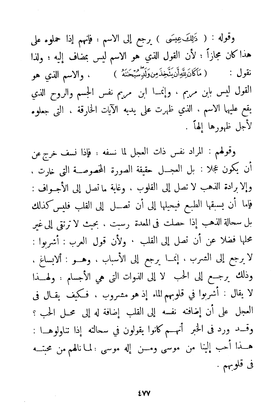 وَقَوْلُهُ: {ذَلِكَ عِيسَى} يَرْجِعُ إلَى الِاسْمِ: فَإِنَّهُمْ إذَا حَمَلُوهُ عَلَى هَذَا كَانَ مَجَازًا؛ لِأَنَّ الْقَوْلَ الَّذِي هُوَ الِاسْمُ لَيْسَ بِمُضَافِ إلَيْهِ؛ وَلِذَا نَقُولُ: {مَا كَانَ لِلَّهِ أَنْ يَتَّخِذَ مِنْ وَلَدٍ سُبْحَانَهُ} وَالِاسْمُ الَّذِي هُوَ الْقَوْلُ لَيْسَ بِابْنِ مَرْيَمَ وَإِنَّمَا ابْنُ مَرْيَمَ نَفْسُ الْجِسْمِ وَالرُّوحِ الَّذِي يَقَعُ عَلَيْهِمَا الِاسْمُ الَّذِي ظَهَرَتْ عَلَى يَدَيْهِ الْآيَاتُ الْخَارِقَةُ الَّتِي جَعَلُوهُ لِأَجْلِ ظُهُورِهَا إلَهًا. وَقَوْلُهُمْ: الْمُرَادُ نَفْسُ ذَاتِ الْعِجْلِ لَمَّا نَسَفَهُ: فَإِذَا نُسِفَ خَرَجَ عَنْ أَنْ يَكُونَ عِجْلًا: بَلْ الْعِجْلُ حَقِيقَةُ الصُّورَةِ الْمَخْصُوصَةِ الَّتِي خَارَتْ وَإِلَّا بُرَادَةُ الذَّهَبِ لَا تَصِلُ إلَّا الْقُلُوبَ وَغَايَةُ مَا تَصِلُ إلَى الْأَجْوَافِ: فَإِمَّا أَنْ يَسْبِقَهَا الطَّبْعُ فَيُحِيلَهَا إلَى أَنْ تَصِلَ إلَى الْقَلْبِ فَلَيْسَ كَذَلِكَ بَلْ سُحَالَةُ الذَّهَبِ إذَا حَصَلَتْ فِي الْمَعِدَةِ رَسَبَتْ بِحَيْثُ لَا تَرْتَقِي إلَى غَيْرِ مَحَلِّهَا فَضْلًا عَنْ أَنْ تَصِلَ إلَى الْقَلْبِ؛ وَلِأَنَّ قَوْلَ الْعَرَبِ: أُشْرِبُوا: لَا يَرْجِعُ إلَى الشُّرْبِ إنَّمَا يَرْجِعُ إلَى الْأَسْبَابِ وَهُوَ: الإيساغ وَذَلِكَ يَرْجِعُ إلَى الْحُبِّ لَا إلَى الذَّوَاتِ الَّتِي هِيَ الْأَجْسَامُ؛ وَلِهَذَا لَا يُقَالُ: أُشْرِبُوا فِي قُلُوبِهِمْ الْمَاءَ إذْ هُوَ مَشْرُوبٌ فَكَيْفَ يُقَالُ فِي الْعِجْلِ عَلَى أَنَّ إضَافَتَهُ نَفْسَهُ إلَى الْقَلْبِ إضَافَةٌ لَهُ إلَى مَحَلِّ الْحُبِّ؟ وَقَدْ وَرَدَ فِي الْخَبَرِ أَنَّهُمْ كَانُوا يَقُولُونَ فِي سِحَالَتِهِ إذَا تَنَاوَلُوهَا: هَذَا أَحَبُّ إلَيْنَا مِنْ مُوسَى وَمِنْ إلَهِ مُوسَى؛ لِمَا نَالَهُمْ مِنْ مَحَبَّتِهِ فِي قُلُوبِهِمْ.
