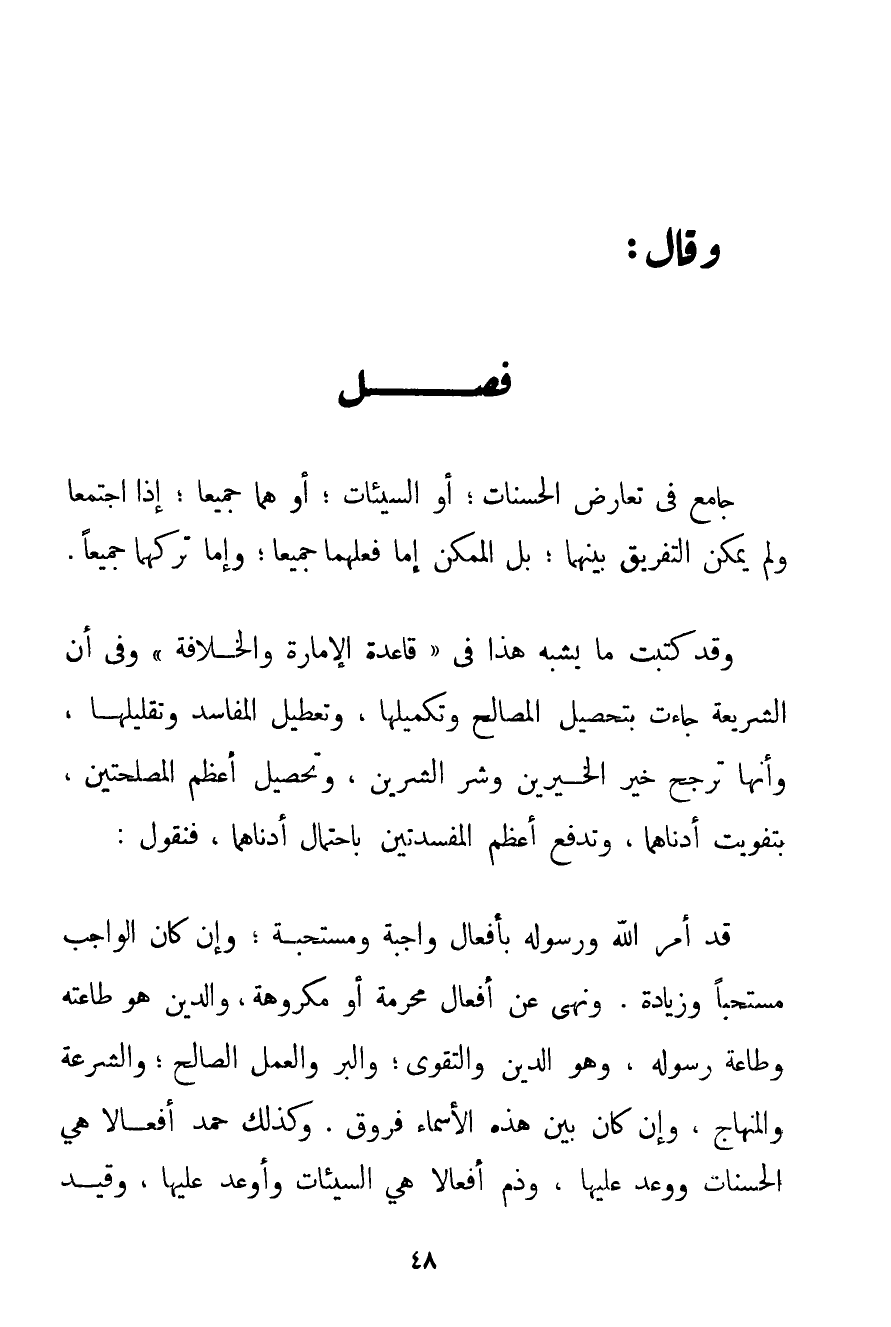 جَامِعٌ فِي تَعَارُضِ الْحَسَنَاتِ؛ أَوْ السَّيِّئَاتِ؛ أَوْ هُمَا جَمِيعًا. إذَا اجْتَمَعَا وَلَمْ يُمْكِنْ التَّفْرِيقُ بَيْنَهُمَا؛ بَلْ الْمُمْكِنُ إمَّا فِعْلُهُمَا جَمِيعًا وَإِمَّا تَرْكُهُمَا جَمِيعًا. وَقَدْ كَتَبْت مَا يُشْبِهُ هَذَا فِي " قَاعِدَةِ الْإِمَارَةِ وَالْخِلَافَةِ " وَفِي أَنَّ الشَّرِيعَةَ جَاءَتْ بِتَحْصِيلِ الْمَصَالِحِ وَتَكْمِيلِهَا وَتَعْطِيلِ الْمَفَاسِدِ وَتَقْلِيلِهَا وَأَنَّهَا تُرَجِّحُ خَيْرَ الْخَيْرَيْنِ وَشَرَّ الشَّرَّيْنِ وَتَحْصِيلِ أَعْظَمِ الْمَصْلَحَتَيْنِ بِتَفْوِيتِ أَدْنَاهُمَا وَتَدْفَعُ أَعْظَمَ الْمَفْسَدَتَيْنِ بِاحْتِمَالِ أَدْنَاهُمَا فَنَقُولُ: قَدْ أَمَرَ اللَّهُ وَرَسُولُهُ بِأَفْعَالِ وَاجِبَةٍ وَمُسْتَحَبَّةٍ؛ وَإِنْ كَانَ الْوَاجِبُ مُسْتَحَبًّا وَزِيَادَةً. وَنَهَى عَنْ أَفْعَالٍ مُحَرَّمَةٍ أَوْ مَكْرُوهَةٍ وَالدِّينُ هُوَ طَاعَتُهُ وَطَاعَةُ رَسُولِهِ وَهُوَ الدِّينُ وَالتَّقْوَى؛ وَالْبِرُّ وَالْعَمَلُ الصَّالِحُ؛ وَالشِّرْعَةُ وَالْمِنْهَاجُ وَإِنْ كَانَ بَيْنَ هَذِهِ الْأَسْمَاءِ فُرُوقٌ. وَكَذَلِكَ حَمِدَ أَفْعَالًا هِيَ الْحَسَنَاتُ وَوَعَدَ عَلَيْهَا وَذَمَّ أَفْعَالًا هِيَ السَّيِّئَاتُ وَأَوْعَدَ عَلَيْهَا وَقَيَّدَ