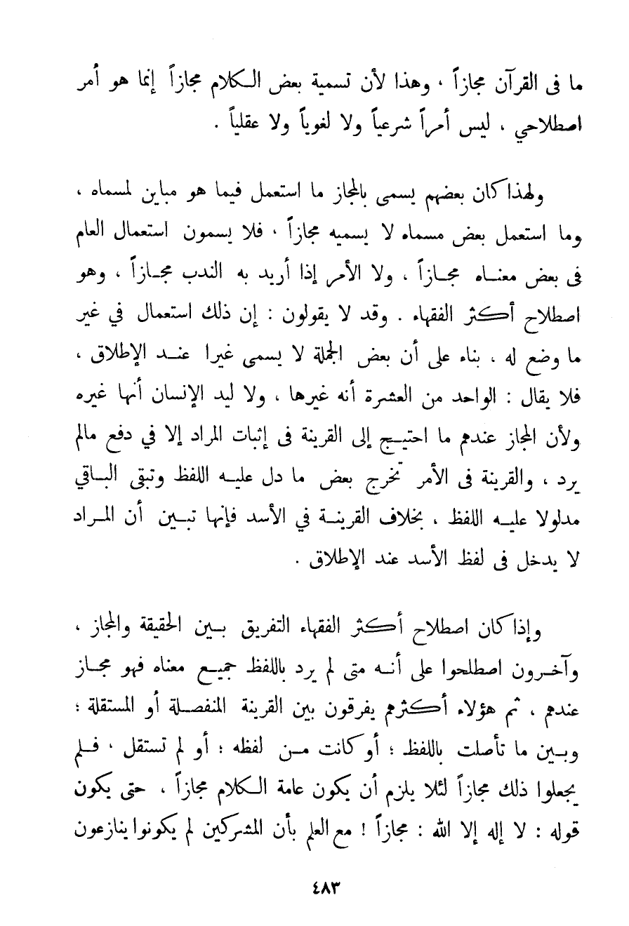 مَا فِي الْقُرْآنِ مَجَازًا وَهَذَا لِأَنَّ تَسْمِيَةَ بَعْضِ الْكَلَامِ مَجَازًا إنَّمَا هُوَ أَمْرٌ اصْطِلَاحِيٌّ لَيْسَ أَمْرًا شَرْعِيًّا وَلَا لُغَوِيًّا وَلَا عَقْلِيًّا. وَلِهَذَا كَانَ بَعْضُهُمْ يُسَمِّي بِالْمَجَازِ مَا اُسْتُعْمِلَ فِيمَا هُوَ مُبَايِنٌ لِمُسَمَّاهُ وَمَا اُسْتُعْمِلَ بَعْضُ مُسَمَّاهُ لَا يُسَمِّيهِ مَجَازًا فَلَا يُسَمُّونَ اسْتِعْمَالَ الْعَامِّ فِي بَعْضِ مَعْنَاهُ مَجَازًا وَلَا الْأَمْرَ إذَا أُرِيدَ بِهِ النَّدْبُ مَجَازًا وَهُوَ اصْطِلَاحُ أَكْثَرِ الْفُقَهَاءِ. وَقَدْ لَا يَقُولُونَ: إنَّ ذَلِكَ اسْتِعْمَالٌ فِي غَيْرِ مَا وُضِعَ لَهُ بِنَاءً عَلَى أَنَّ بَعْضَ الْجُمْلَةِ لَا يُسَمَّى غَيْرًا عِنْدَ الْإِطْلَاقِ فَلَا يُقَالُ: الْوَاحِدُ مِنْ الْعَشَرَةِ أَنَّهُ غَيْرُهَا وَلَا لِيَدِ الْإِنْسَان أَنَّهَا غَيْرُهُ وَلِأَنَّ الْمَجَازَ عِنْدَهُمْ مَا اُحْتِيجَ إلَى الْقَرِينَةِ فِي إثْبَاتِ الْمُرَادِ إلَّا فِي دَفْعِ مَا لَمْ يُرَدْ وَالْقَرِينَةُ فِي الْأَمْرِ تُخْرِجُ بَعْضَ مَا دَلَّ عَلَيْهِ اللَّفْظُ وَتُبْقِي الْبَاقِيَ مَدْلُولًا عَلَيْهِ اللَّفْظُ بِخِلَافِ الْقَرِينَةِ فِي الْأَسَدِ فَإِنَّهَا تُبَيِّنُ أَنَّ الْمُرَادَ لَا يَدْخُلُ فِي لَفْظِ الْأَسَدِ عِنْدَ الْإِطْلَاقِ. وَإِذَا كَانَ اصْطِلَاحُ أَكْثَرِ الْفُقَهَاءِ التَّفْرِيقَ بَيْنَ الْحَقِيقَةِ وَالْمَجَازِ وَآخَرُونَ اصْطَلَحُوا عَلَى أَنَّهُ مَتَى لَمْ يُرِدْ بِاللَّفْظِ جَمِيعَ مَعْنَاهُ فَهُوَ مَجَازٌ عِنْدَهُمْ ثُمَّ هَؤُلَاءِ أَكْثَرُهُمْ يُفَرِّقُونَ بَيْنَ الْقَرِينَةِ الْمُنْفَصِلَةِ أَوْ الْمُسْتَقِلَّةِ؛ وَبَيْنَ مَا تَأَصَّلَتْ بِاللَّفْظِ؛ أَوْ كَانَتْ مِنْ لَفْظِهِ؛ أَوْ لَمْ تَسْتَقِلَّ؛ فَلَمْ يَجْعَلُوا ذَلِكَ مَجَازًا لِئَلَّا يَلْزَمُ أَنْ يَكُونَ عَامَّةُ الْكَلَامِ مَجَازًا حَتَّى يَكُونَ قَوْلُهُ: لَا إلَهَ إلَّا اللَّهُ: مَجَازًا مَعَ الْعِلْمِ بِأَنَّ الْمُشْرِكِينَ لَمْ يَكُونُوا يُنَازِعُونَ