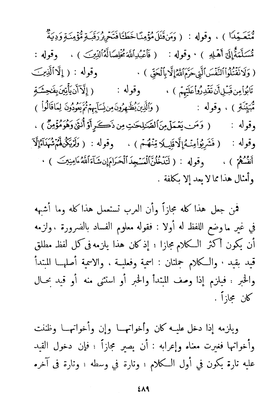 مُتَعَمِّدًا} وَقَوْلَهُ: {وَمَنْ قَتَلَ مُؤْمِنًا خَطَأً فَتَحْرِيرُ رَقَبَةٍ مُؤْمِنَةٍ وَدِيَةٌ مُسَلَّمَةٌ إلَى أَهْلِهِ} وَقَوْلَهُ: {أَنْ أَعْبُدَ اللَّهَ مُخْلِصًا لَهُ الدِّينَ} وَقَوْلَهُ: {وَلَا تَقْتُلُوا النَّفْسَ الَّتِي حَرَّمَ اللَّهُ إلَّا بِالْحَقِّ} وَقَوْلَهُ: {إلَّا الَّذِينَ تَابُوا مِنْ قَبْلِ أَنْ تَقْدِرُوا عَلَيْهِمْ} وَقَوْلَهُ: {إلَّا أَنْ يَأْتِينَ بِفَاحِشَةٍ مُبَيِّنَةٍ} وَقَوْلَهُ: {وَالَّذِينَ يُظَاهِرُونَ مِنْ نِسَائِهِمْ ثُمَّ يَعُودُونَ لِمَا قَالُوا} وَقَوْلَهُ: {وَمَنْ يَعْمَلْ مِنَ الصَّالِحَاتِ مِنْ ذَكَرٍ أَوْ أُنْثَى وَهُوَ مُؤْمِنٌ} وَقَوْلَهُ: {فَشَرِبُوا مِنْهُ إلَّا قَلِيلًا مِنْهُمْ} وَقَوْلَهُ: {وَلَمْ يَكُنْ لَهُمْ شُهَدَاءُ إلَّا أَنْفُسُهُمْ} وَقَوْلَهُ: {لَتَدْخُلُنَّ الْمَسْجِدَ الْحَرَامَ إنْ شَاءَ اللَّهُ آمِنِينَ} وَأَمْثَالَ هَذَا مِمَّا لَا يُعَدُّ إلَّا بِكُلْفَةِ. فَمَنْ جَعَلَ هَذَا كُلَّهُ مَجَازًا وَأَنَّ الْعَرَبَ تَسْتَعْمِلُ هَذَا كُلَّهُ وَمَا أَشْبَهَهُ فِي غَيْرِ مَا وُضِعَ اللَّفْظُ لَهُ أَوَّلًا: فَقَوْلُهُ مَعْلُومُ الْفَسَادِ بِالضَّرُورَةِ وَلَزِمَهُ أَنْ يَكُونَ أَكْثَرُ الْكَلَامِ مَجَازًا؛ إذْ كَانَ هَذَا يَلْزَمُهُ فِي كُلِّ لَفْظٍ مُطْلَقٍ قُيِّدَ بِقَيْدِ وَالْكَلَامُ جُمْلَتَانِ: اسْمِيَّةٌ وَفِعْلِيَّةٌ وَالِاسْمِيَّةُ أَصْلُهَا الْمُبْتَدَأُ وَالْخَبَرُ؛ فَيَلْزَمُ إذَا وُصِفَ الْمُبْتَدَأُ وَالْخَبَرُ أَوْ اُسْتُثْنِيَ مِنْهُ أَوْ قُيِّدَ بِحَالِ كَانَ مَجَازًا. وَيَلْزَمُهُ إذَا دَخَلَ عَلَيْهِ كَانَ وَأَخَوَاتُهَا وَإِنَّ وَأَخَوَاتُهَا وَظَنَنْت وَأَخَوَاتُهَا فَغَيَّرَتْ مَعْنَاهُ وَإِعْرَابَهُ أَنْ يَصِيرَ مَجَازًا: فَإِنَّ دُخُولَ الْقَيْدِ عَلَيْهِ تَارَةً يَكُونُ فِي أَوَّلِ الْكَلَامِ؛ وَتَارَةً فِي وَسَطِهِ: وَتَارَةً فِي آخِرِهِ