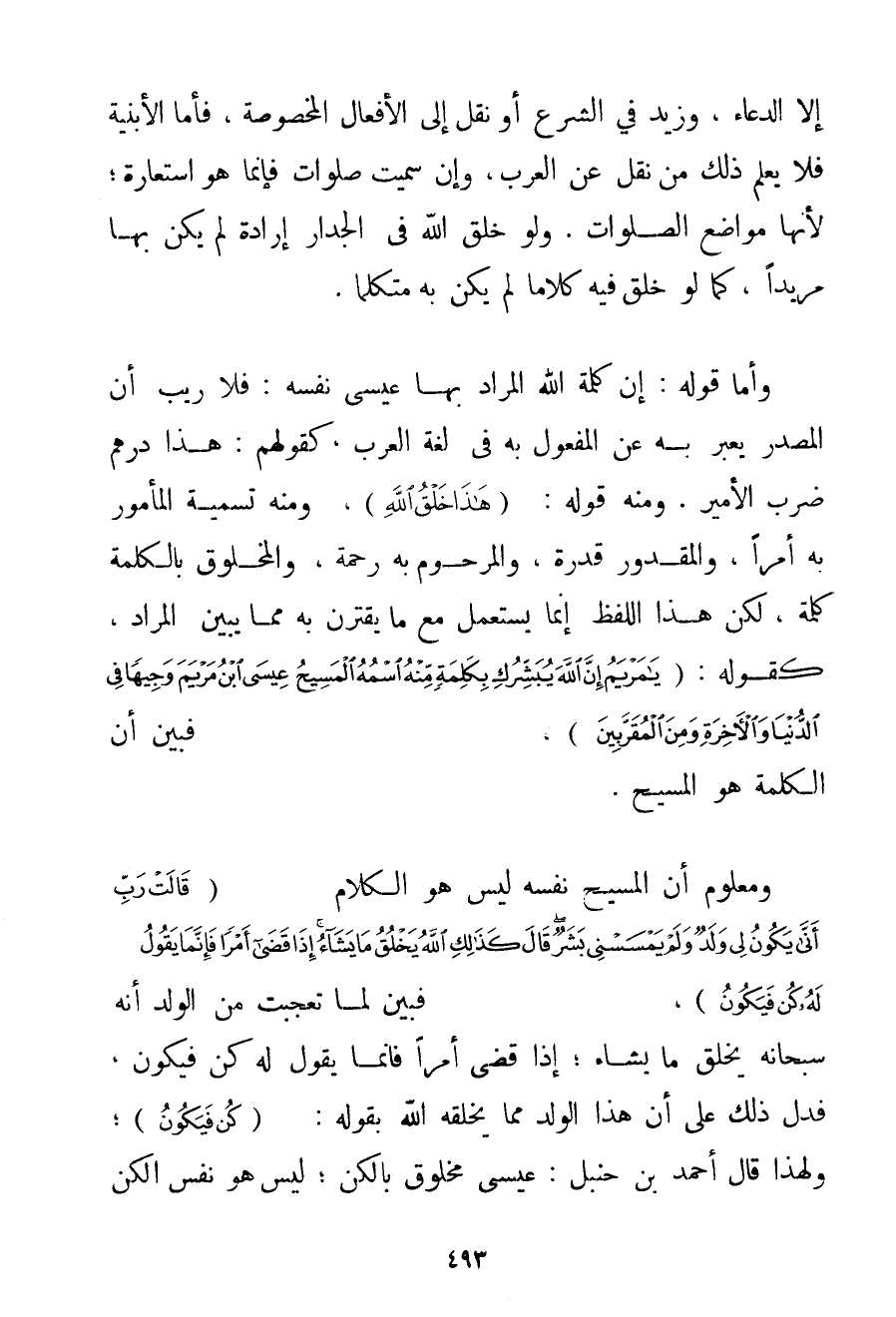 إلَّا الدُّعَاءُ وَزِيدَ فِي الشَّرْعِ أَوْ نُقِلَ إلَى الْأَفْعَالِ الْمَخْصُوصَةِ فَأَمَّا الْأَبْنِيَةُ فَلَا يُعْلَمُ ذَلِكَ مِنْ نَقْلٍ عَنْ الْعَرَبِ وَإِنْ سُمِّيَتْ صَلَوَاتٍ فَإِنَّمَا هُوَ اسْتِعَارَةٌ؛ لِأَنَّهَا مَوَاضِعُ الصَّلَوَاتِ. وَلَوْ خَلَقَ اللَّهُ فِي الْجِدَارِ إرَادَةً لَمْ يَكُنْ بِهَا مُرِيدًا كَمَا لَوْ خَلَقَ فِيهِ كَلَامًا لَمْ يَكُنْ بِهِ مُتَكَلِّمًا. وَأَمَّا قَوْلُهُ: إنَّ كَلِمَةَ اللَّهِ الْمُرَادُ بِهَا عِيسَى نَفْسُهُ: فَلَا رَيْبَ أَنَّ الْمَصْدَرَ يُعَبَّرُ بِهِ عَنْ الْمَفْعُولِ بِهِ فِي لُغَةِ الْعَرَبِ كَقَوْلِهِمْ: هَذَا دِرْهَمُ ضَرْبُ الْأَمِيرِ. وَمِنْهُ قَوْلُهُ: {هَذَا خَلْقُ اللَّهِ} وَمِنْهُ تَسْمِيَةُ الْمَأْمُورِ بِهِ أَمْرًا وَالْمَقْدُورِ قُدْرَةً وَالْمَرْحُومِ بِهِ رَحْمَةً وَالْمَخْلُوقِ بِالْكَلِمَةِ كَلِمَةً لَكِنَّ هَذَا اللَّفْظَ إنَّمَا يُسْتَعْمَلُ مَعَ مَا يَقْتَرِنُ بِهِ مِمَّا يُبَيِّنُ الْمُرَادَ كَقَوْلِهِ: {يَا مَرْيَمُ إنَّ اللَّهَ يُبَشِّرُكِ بِكَلِمَةٍ مِنْهُ اسْمُهُ الْمَسِيحُ عِيسَى ابْنُ مَرْيَمَ وَجِيهًا فِي الدُّنْيَا وَالْآخِرَةِ وَمِنَ الْمُقَرَّبِينَ} فَبَيَّنَ أَنَّ الْكَلِمَةَ هُوَ الْمَسِيحُ. وَمَعْلُومٌ أَنَّ الْمَسِيحَ نَفْسَهُ لَيْسَ هُوَ الْكَلَامُ {قَالَتْ رَبِّ أَنَّى يَكُونُ لِي وَلَدٌ وَلَمْ يَمْسَسْنِي بَشَرٌ قَالَ كَذَلِكِ اللَّهُ يَخْلُقُ مَا يَشَاءُ إذَا قَضَى أَمْرًا فَإِنَّمَا يَقُولُ لَهُ كُنْ فَيَكُونُ} فَبَيَّنَ لَمَّا تَعَجَّبَتْ مِنْ الْوَلَدِ أَنَّهُ سُبْحَانَهُ يَخْلُقُ مَا يَشَاءُ؛ إذَا قَضَى أَمْرًا فَإِنَّمَا يَقُولُ لَهُ كُنْ فَيَكُونُ فَدَلَّ ذَلِكَ عَلَى أَنَّ هَذَا الْوَلَدَ مِمَّا يَخْلُقُهُ اللَّهُ بِقَوْلِهِ: {كُنْ فَيَكُونُ} وَلِهَذَا قَالَ أَحْمَد بْنُ حَنْبَلٍ: عِيسَى مَخْلُوقٌ بالكن؛ لَيْسَ هُوَ نَفْسَ الكن
