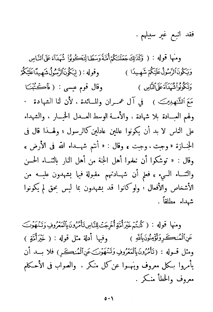 فَقَدْ اتَّبَعَ غَيْرَ سَبِيلِهِمْ. وَمِنْهَا قَوْلُهُ: {وَكَذَلِكَ جَعَلْنَاكُمْ أُمَّةً وَسَطًا لِتَكُونُوا شُهَدَاءَ عَلَى النَّاسِ وَيَكُونَ الرَّسُولُ عَلَيْكُمْ شَهِيدًا} وَقَوْلُهُ: {لِيَكُونَ الرَّسُولُ شَهِيدًا عَلَيْكُمْ وَتَكُونُوا شُهَدَاءَ عَلَى النَّاسِ} وَقَالَ قَوْمُ عِيسَى: {فَاكْتُبْنَا مَعَ الشَّاهِدِينَ} فِي آلِ عِمْرَانَ وَالْمَائِدَةِ لِأَنَّ لَنَا الشَّهَادَةَ وَلَهُمْ الْعِبَادَةُ بِلَا شَهَادَةٍ وَالْأُمَّةُ الْوَسَطُ الْعَدْلُ الْخِيَارُ وَالشُّهَدَاءُ عَلَى النَّاسِ لَا بُدَّ أَنْ يَكُونُوا عَالِمِينَ عَادِلِينَ كَالرَّسُولِ؛ وَلِهَذَا {قَالَ فِي الْجِنَازَةِ وَجَبَتْ وَجَبَتْ وَقَالَ: أَنْتُمْ شُهَدَاءُ اللَّهِ فِي الْأَرْضِ} وَقَالَ: {تُوشِكُوا أَنْ تَعْلَمُوا أَهْلَ الْجَنَّةِ مِنْ أَهْلِ النَّارِ بِالثَّنَاءِ الْحَسَنِ وَالثَّنَاءِ السَّيِّئِ} فَعُلِمَ أَنَّ شَهَادَتَهُمْ مَقْبُولَةٌ فِيمَا يَشْهَدُونَ عَلَيْهِ مِنْ الْأَشْخَاصِ وَالْأَفْعَالِ؛ وَلَوْ كَانُوا قَدْ يَشْهَدُونَ بِمَا لَيْسَ بِحَقِّ لَمْ يَكُونُوا شُهَدَاءَ مُطْلَقًا. وَمِنْهَا قَوْلُهُ: {كُنْتُمْ خَيْرَ أُمَّةٍ أُخْرِجَتْ لِلنَّاسِ تَأْمُرُونَ بِالْمَعْرُوفِ وَتَنْهَوْنَ عَنِ الْمُنْكَرِ وَتُؤْمِنُونَ بِاللَّهِ} وَفِيهَا أَدِلَّةٌ مِثْلُ قَوْلِهِ: {خَيْرَ أُمَّةٍ} وَمِثْلُ قَوْلِهِ: {تَأْمُرُونَ بِالْمَعْرُوفِ وَتَنْهَوْنَ عَنِ الْمُنْكَرِ} فَلَا بُدَّ أَنْ يَأْمُرُوا بِكُلِّ مَعْرُوفٍ وَيَنْهَوْا عَنْ كُلِّ مُنْكَرٍ وَالصَّوَابُ فِي الْأَحْكَامِ مَعْرُوفٌ وَالْخَطَأُ مُنْكَرٌ.