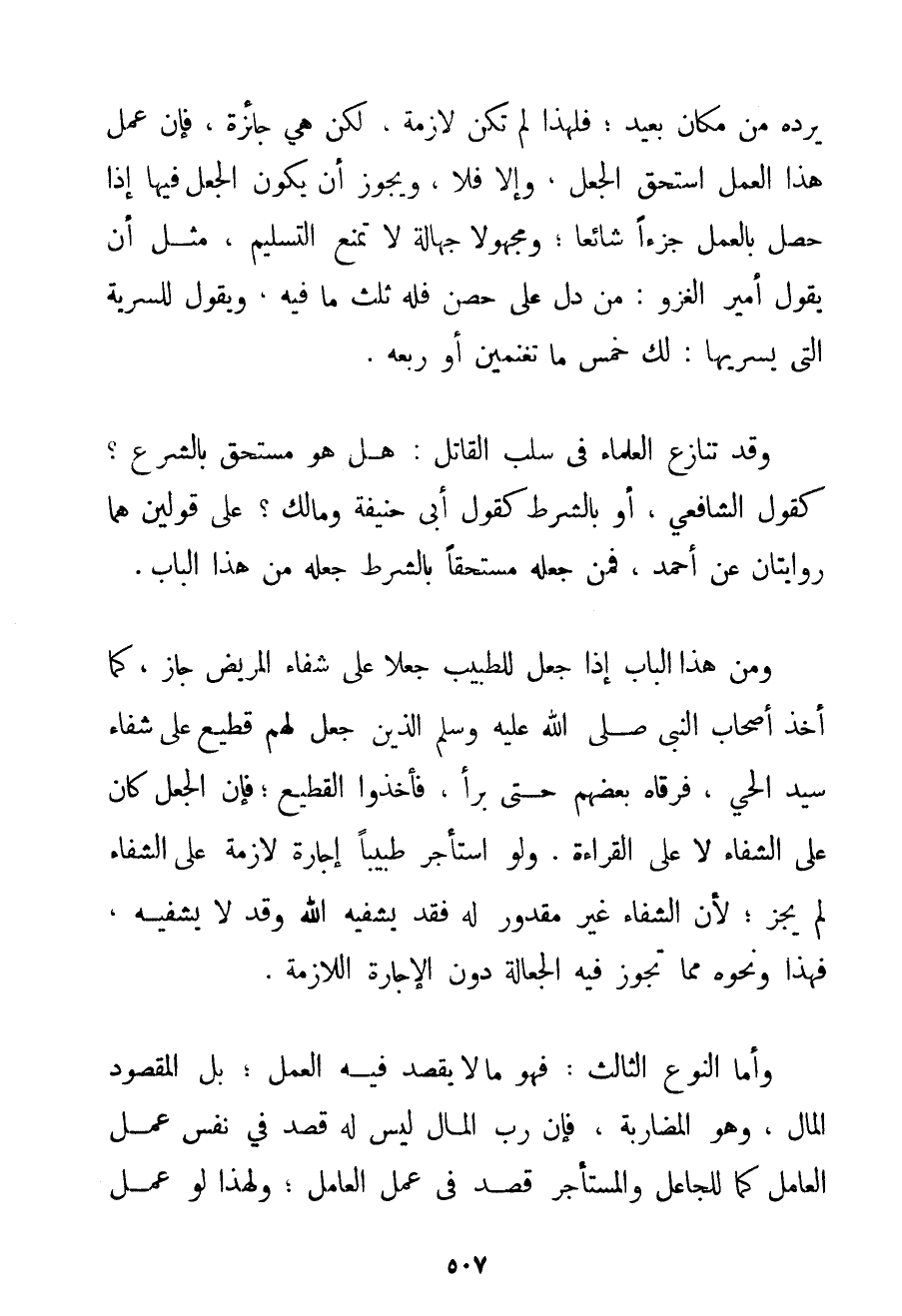 يَرُدُّهُ مِنْ مَكَانٍ بَعِيدٍ؛ فَلِهَذَا لَمْ تَكُنْ لَازِمَةً لَكِنْ هِيَ جَائِزَةٌ فَإِنْ عَمِلَ هَذَا الْعَمَلَ اسْتَحَقَّ الْجُعْلَ وَإِلَّا فَلَا وَيَجُوزُ أَنْ يَكُونَ الْجُعْلُ فِيهَا إذَا حَصَلَ بِالْعَمَلِ جُزْءًا شَائِعًا؛ وَمَجْهُولًا جَهَالَةً لَا تَمْنَعُ التَّسْلِيمَ مِثْلَ أَنْ يَقُولَ أَمِيرُ الْغَزْوِ: مَنْ دَلَّ عَلَى حِصْنٍ فَلَهُ ثُلُثُ مَا فِيهِ " وَيَقُولَ لِلسَّرِيَّةِ الَّتِي يَسْرِيهَا: لَك خُمُسُ مَا تَغْنَمِينَ أَوْ رُبُعُهُ. وَقَدْ تَنَازَعَ الْعُلَمَاءُ فِي سَلَبِ الْقَاتِلِ: هَلْ هُوَ مُسْتَحَقٌّ بِالشَّرْعِ؟ كَقَوْلِ الشَّافِعِيِّ أَوْ بِالشَّرْطِ كَقَوْلِ أَبِي حَنِيفَةَ وَمَالِكٍ؟ عَلَى قَوْلَيْنِ هُمَا رِوَايَتَانِ عَنْ أَحْمَد فَمَنْ جَعَلَهُ مُسْتَحَقًّا بِالشَّرْطِ جَعَلَهُ مِنْ هَذَا الْبَابِ. وَمِنْ هَذَا الْبَابِ إذَا جَعَلَ لِلطَّبِيبِ جُعْلًا عَلَى شِفَاءِ الْمَرِيضِ جَازَ كَمَا أَخَذَ أَصْحَابُ النَّبِيِّ صَلَّى اللَّهُ عَلَيْهِ وَسَلَّمَ الَّذِينَ جُعِلَ لَهُمْ قَطِيعٌ عَلَى شِفَاءِ سَيِّدِ الْحَيِّ فَرَقَاهُ بَعْضُهُمْ حَتَّى بَرِئَ فَأَخَذُوا الْقَطِيعَ؛ فَإِنَّ الْجُعْلَ كَانَ عَلَى الشِّفَاءِ لَا عَلَى الْقِرَاءَةِ. وَلَوْ اسْتَأْجَرَ طَبِيبًا إجَارَةً لَازِمَةً عَلَى الشِّفَاءِ لَمْ يَجُزْ؛ لِأَنَّ الشِّفَاءَ غَيْرُ مَقْدُورٍ لَهُ فَقَدْ يَشْفِيهِ اللَّهُ وَقَدْ لَا يَشْفِيهِ فَهَذَا وَنَحْوُهُ مِمَّا تَجُوزُ فِيهِ الْجَعَالَةُ دُونَ الْإِجَارَةِ اللَّازِمَةِ. وَأَمَّا النَّوْعُ الثَّالِثُ: فَهُوَ مَا لَا يُقْصَدُ فِيهِ الْعَمَلُ؛ بَلْ الْمَقْصُودُ الْمَالُ وَهُوَ الْمُضَارَبَةُ فَإِنَّ رَبَّ الْمَالِ لَيْسَ لَهُ قَصْدٌ فِي نَفْسِ عَمَلِ الْعَامِلِ كَمَا لِلْجَاعِلِ وَالْمُسْتَأْجِرِ قَصْدٌ فِي عَمَلِ الْعَامِلِ؛ وَلِهَذَا لَوْ عَمِلَ