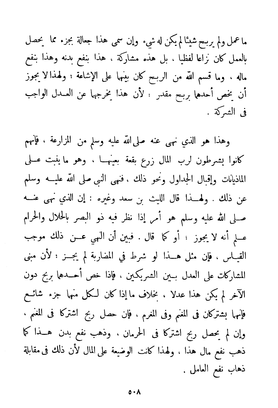مَا عَمِلَ وَلَمْ يَرْبَحْ شَيْئًا لَمْ يَكُنْ لَهُ شَيْءٌ وَإِنْ سُمِّيَ هَذَا جَعَالَةً بِجُزْءِ مِمَّا يَحْصُلُ بِالْعَمَلِ كَانَ نِزَاعًا لَفْظِيًّا بَلْ هَذِهِ مُشَارَكَةٌ هَذَا بِنَفْعِ بَدَنِهِ وَهَذَا بِنَفْعِ مَالِهِ وَمَا قَسَّمَ اللَّهُ مِنْ الرِّبْحِ كَانَ بَيْنَهُمَا عَلَى الْإِشَاعَةِ؛ وَلِهَذَا لَا يَجُوزُ أَنْ يَخُصَّ أَحَدَهُمَا بِرِبْحِ مُقَدَّرٍ؛ لِأَنَّ هَذَا يُخْرِجُهُمَا عَنْ الْعَدْلِ الْوَاجِبِ فِي الشَّرِكَةِ. وَهَذَا هُوَ الَّذِي نَهَى عَنْهُ صَلَّى اللَّهُ عَلَيْهِ وَسَلَّمَ مِنْ الْمُزَارَعَةِ فَإِنَّهُمْ كَانُوا يَشْرُطُونَ لِرَبِّ الْمَالِ زَرْعَ بُقْعَةٍ بِعَيْنِهَا وَهُوَ مَا يَنْبُتُ عَلَى الماذيانات وَإِقْبَالِ الْجَدَاوِلِ وَنَحْوِ ذَلِكَ فَنَهَى النَّبِيُّ صَلَّى اللَّهُ عَلَيْهِ وَسَلَّمَ عَنْ ذَلِكَ. وَلِهَذَا قَالَ اللَّيْثُ بْنُ سَعْدٍ وَغَيْرُهُ: إنَّ الَّذِي نَهَى عَنْهُ صَلَّى اللَّهُ عَلَيْهِ وَسَلَّمَ هُوَ أَمْرٌ إذَا نَظَرَ فِيهِ ذُو الْبَصَرِ بِالْحَلَالِ وَالْحَرَامِ عَلِمَ أَنَّهُ لَا يَجُوزُ؛ أَوْ كَانَ قَالَ. فَبَيَّنَ أَنَّ النَّهْيَ عَنْ ذَلِكَ مُوجِبُ الْقِيَاسِ فَإِنَّ مِثْلَ هَذَا لَوْ شُرِطَ فِي الْمُضَارَبَةِ لَمْ يَجُزْ؛ لَأَنَّ مَبْنَى الْمُشَارَكَاتِ عَلَى الْعَدْلِ بَيْنَ الشَّرِيكَيْنِ فَإِذَا خُصَّ أَحَدُهُمَا بِرِبْحِ دُونَ الْآخَرِ لَمْ يَكُنْ هَذَا عَدْلًا بِخِلَافِ مَا إذَا كَانَ لِكُلِّ مِنْهُمَا جُزْءٌ شَائِعٌ فَإِنَّهُمَا يَشْتَرِكَانِ فِي الْمَغْنَمِ وَفِي الْمَغْرَمِ فَإِنْ حَصَلَ رِبْحٌ اشْتَرَكَا فِي الْمَغْنَمِ وَإِنْ لَمْ يَحْصُلْ رِبْحٌ اشْتَرَكَا فِي الْحِرْمَانِ وَذَهَبَ نَفْعُ بَدَنِ هَذَا كَمَا ذَهَبَ نَفْعُ مَالِ هَذَا وَلِهَذَا كَانَتْ الْوَضِيعَةُ عَلَى الْمَالِ لِأَنَّ ذَلِكَ فِي مُقَابَلَةِ ذَهَابِ نَفْعِ الْعَامِلِ.