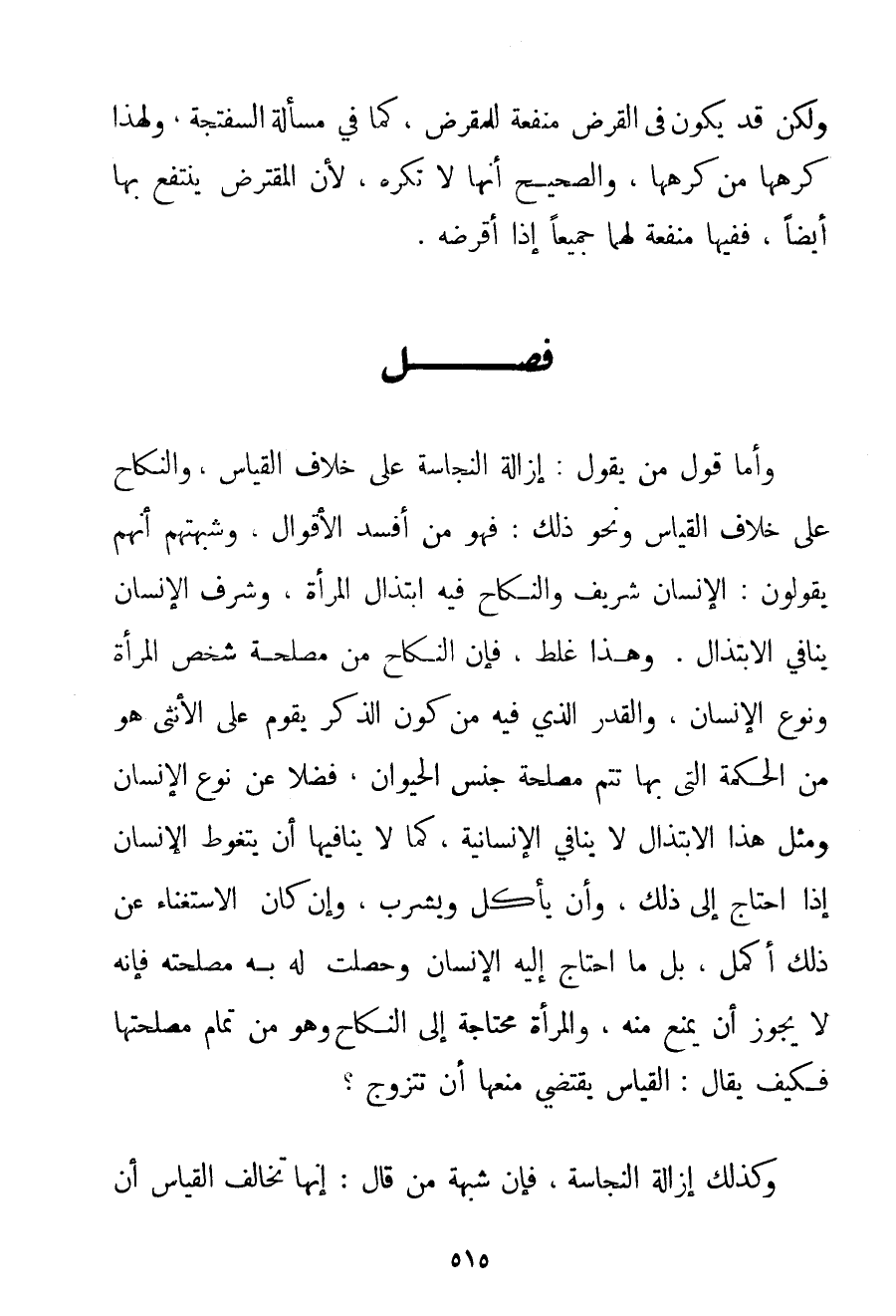 وَأَمَّا قَوْلُ مَنْ يَقُولُ: إزَالَةُ النَّجَاسَةِ عَلَى خِلَافِ الْقِيَاسِ وَالنِّكَاحُ عَلَى خِلَافِ الْقِيَاسِ وَنَحْوُ ذَلِكَ: فَهُوَ مِنْ أَفْسَدِ الْأَقْوَالِ وَشُبْهَتُهُمْ أَنَّهُمْ يَقُولُونَ: الْإِنْسَانُ شَرِيفٌ وَالنِّكَاحُ فِيهِ ابْتِذَالُ الْمَرْأَةِ وَشَرَفُ الْإِنْسَانِ يُنَافِي الِابْتِذَالَ. وَهَذَا غَلَطٌ فَإِنَّ النِّكَاحَ مِنْ مَصْلَحَةِ شَخْصِ الْمَرْأَةِ وَنَوْعِ الْإِنْسَانِ وَالْقَدَرُ الَّذِي فِيهِ مِنْ كَوْنِ الذَّكَرِ يَقُومُ عَلَى الْأُنْثَى هُوَ مِنْ الْحِكْمَةِ الَّتِي بِهَا تَتِمُّ مَصْلَحَةُ جِنْسِ الْحَيَوَانِ فَضْلًا عَنْ نَوْعِ الْإِنْسَانِ وَمِثْلُ هَذَا الِابْتِذَالُ لَا يُنَافِي الْإِنْسَانِيَّةَ كَمَا لَا يُنَافِيهَا أَنْ يَتَغَوَّطَ الْإِنْسَانُ إذَا احْتَاجَ إلَى ذَلِكَ وَأَنْ يَأْكُلَ وَيَشْرَبَ وَإِنْ كَانَ الِاسْتِغْنَاءُ عَنْ ذَلِكَ أَكْمَلَ بَلْ مَا احْتَاجَ إلَيْهِ الْإِنْسَانُ وَحَصَلَتْ لَهُ بِهِ مَصْلَحَتُهُ فَإِنَّهُ لَا يَجُوزُ أَنْ يُمْنَعَ مِنْهُ وَالْمَرْأَةُ مُحْتَاجَةٌ إلَى النِّكَاحِ وَهُوَ مِنْ تَمَامِ مَصْلَحَتِهَا فَكَيْفَ يُقَالُ: الْقِيَاسُ يَقْتَضِي مَنْعَهَا أَنْ تَتَزَوَّجَ؟ وَكَذَلِكَ إزَالَةُ النَّجَاسَةِ فَإِنَّ شُبْهَةَ مَنْ قَالَ: إنَّهَا تُخَالِفُ الْقِيَاسَ أَنَّ