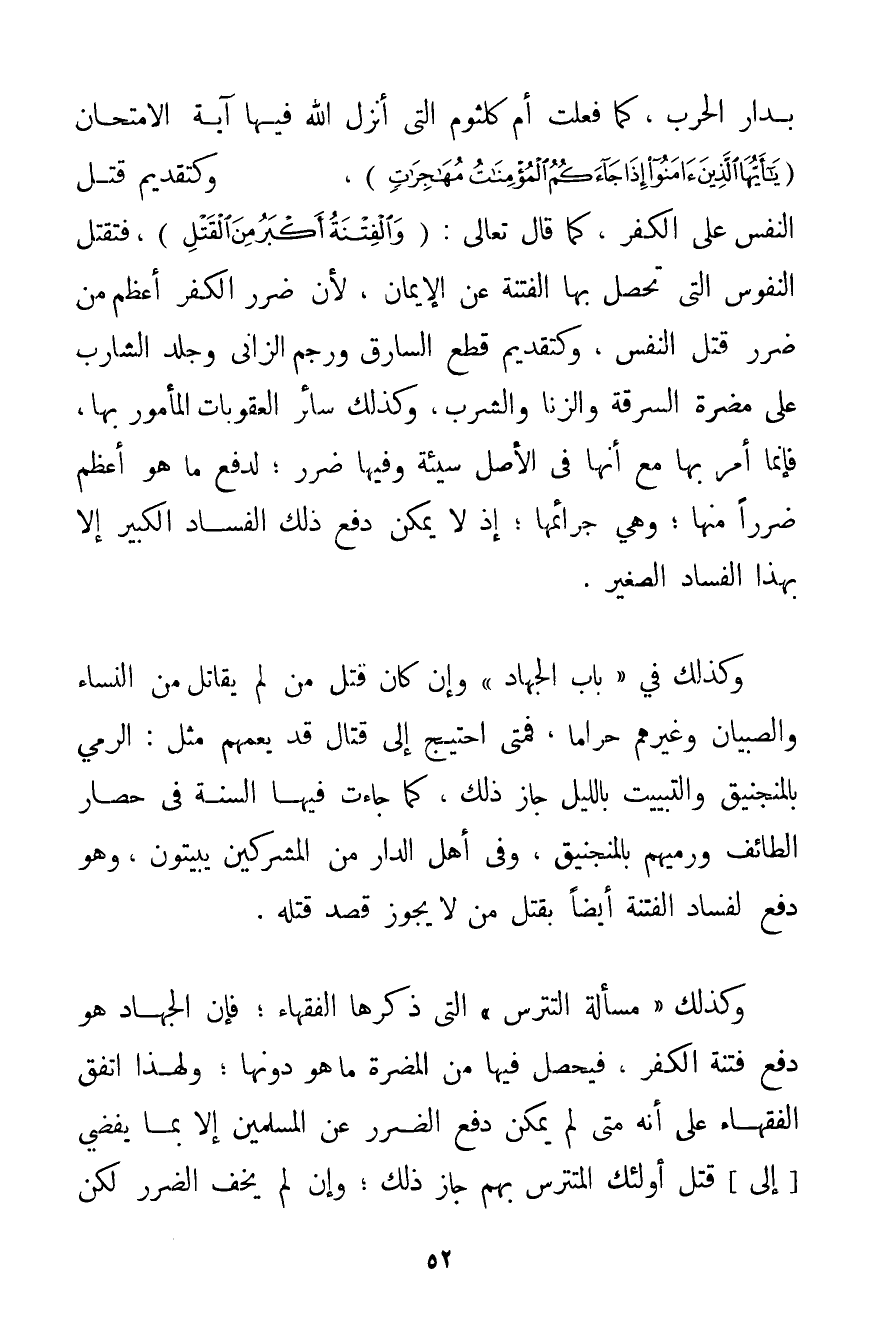 بِدَارِ الْحَرْبِ كَمَا فَعَلَتْ أُمُّ كُلْثُومٍ الَّتِي أَنْزَلَ اللَّهُ فِيهَا آيَةَ الِامْتِحَانِ {يَا أَيُّهَا الَّذِينَ آمَنُوا إذَا جَاءَكُمُ الْمُؤْمِنَاتُ مُهَاجِرَاتٍ} وَكَتَقْدِيمِ قَتْلِ النَّفْسِ عَلَى الْكُفْرِ كَمَا قَالَ تَعَالَى: {وَالْفِتْنَةُ أَكْبَرُ مِنَ الْقَتْلِ} فَتُقْتَلُ النُّفُوسُ الَّتِي تَحْصُلُ بِهَا الْفِتْنَةُ عَنْ الْإِيمَانِ لِأَنَّ ضَرَرَ الْكُفْرِ أَعْظَمُ مِنْ ضَرَرِ قَتْلِ النَّفْسِ وَكَتَقْدِيمِ قَطْعِ السَّارِقِ وَرَجْمِ الزَّانِي وَجَلْدِ الشَّارِبِ عَلَى مَضَرَّةِ السَّرِقَةِ وَالزِّنَا وَالشُّرْبِ وَكَذَلِكَ سَائِرُ الْعُقُوبَاتِ الْمَأْمُورِ بِهَا فَإِنَّمَا أَمَرَ بِهَا مَعَ أَنَّهَا فِي الْأَصْلِ سَيِّئَةٌ وَفِيهَا ضَرَرٌ؛ لِدَفْعِ مَا هُوَ أَعْظَمُ ضَرَرًا مِنْهَا؛ وَهِيَ جَرَائِمُهَا؛ إذْ لَا يُمْكِنُ دَفْعُ ذَلِكَ الْفَسَادِ الْكَبِيرِ إلَّا بِهَذَا الْفَسَادِ الصَّغِيرِ. وَكَذَلِكَ فِي " بَابِ الْجِهَادِ " وَإِنْ كَانَ قَتْلُ مَنْ لَمْ يُقَاتِلْ مِنْ النِّسَاءِ وَالصِّبْيَانِ وَغَيْرِهِمْ حَرَامًا فَمَتَى اُحْتِيجَ إلَى قِتَالٍ قَدْ يَعُمُّهُمْ مِثْلُ: الرَّمْيُ بِالْمَنْجَنِيقِ وَالتَّبْيِيتُ بِاللَّيْلِ جَازَ ذَلِكَ كَمَا جَاءَتْ فِيهَا السُّنَّةُ فِي حِصَارِ الطَّائِفِ وَرَمْيِهِمْ بِالْمَنْجَنِيقِ وَفِي أَهْلِ الدَّارِ مِنْ الْمُشْرِكِينَ يَبِيتُونَ وَهُوَ دَفْعٌ لِفَسَادِ الْفِتْنَةِ أَيْضًا بِقَتْلِ مَنْ لَا يَجُوزُ قَصْدُ قَتْلِهِ. وَكَذَلِكَ " مَسْأَلَةُ التَّتَرُّسِ " الَّتِي ذَكَرَهَا الْفُقَهَاءُ؛ فَإِنَّ الْجِهَادَ هُوَ دَفْعُ فِتْنَةِ الْكُفْرِ فَيَحْصُلُ فِيهَا مِنْ الْمَضَرَّةِ مَا هُوَ دُونَهَا؛ وَلِهَذَا اتَّفَقَ الْفُقَهَاءُ عَلَى أَنَّهُ مَتَى لَمْ يُمْكِنْ دَفْعُ الضَّرَرِ عَنْ الْمُسْلِمِينَ إلَّا بِمَا يُفْضِي إلَى قَتْلِ أُولَئِكَ الْمُتَتَرَّسِ بِهِمْ جَازَ ذَلِكَ؛ وَإِنْ لَمْ يَخَفْ الضَّرَرَ لَكِنْ