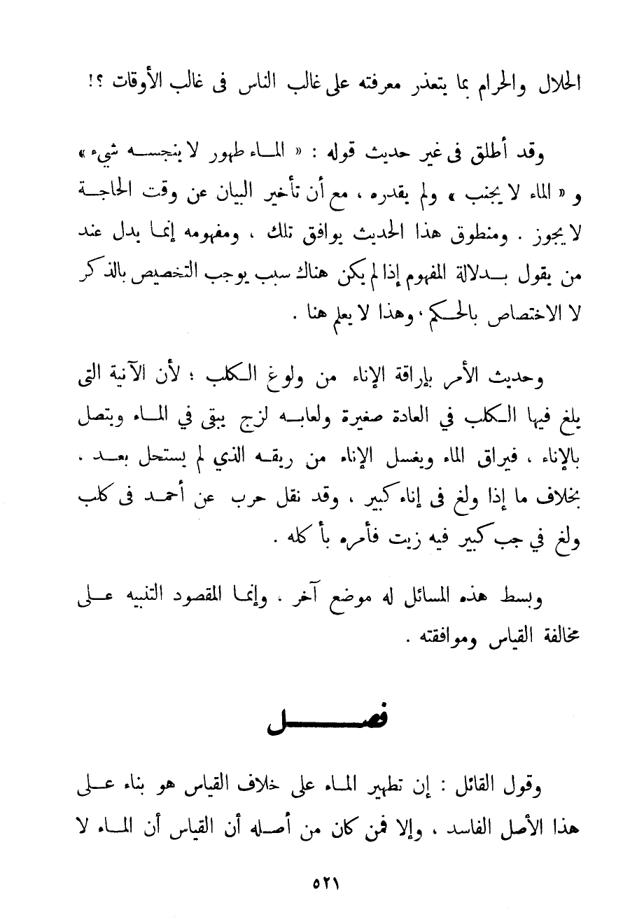 الْحَلَالِ وَالْحَرَامِ بِمَا يَتَعَذَّرُ مَعْرِفَتُهُ عَلَى غَالِبِ النَّاسِ فِي غَالِبِ الْأَوْقَاتِ وَقَدْ أَطْلَقَ فِي غَيْرِ حَدِيثٍ قَوْلَهُ: {الْمَاءُ طَهُورٌ لَا يُنَجِّسُهُ شَيْءٌ} وَ {الْمَاءُ لَا يُجْنِبُ} وَلَمْ يُقَدِّرْهُ مَعَ أَنَّ تَأْخِيرَ الْبَيَانِ عَنْ وَقْتِ الْحَاجَةِ لَا يَجُوزُ وَمَنْطُوقُ هَذَا الْحَدِيثِ يُوَافِقُ تِلْكَ وَمَفْهُومُهُ إنَّمَا يَدُلُّ عِنْدَ مَنْ يَقُولُ بِدَلَالَةِ الْمَفْهُومِ إذَا لَمْ يَكُنْ هُنَاكَ سَبَبٌ يُوجِبُ التَّخْصِيصَ بِالذِّكْرِ لَا الِاخْتِصَاصَ بِالْحُكْمِ وَهَذَا لَا يُعْلَمُ هُنَا. وَحَدِيثُ الْأَمْرِ بِإِرَاقَةِ الْإِنَاءِ مِنْ وُلُوغِ الْكَلْبِ؛ لِأَنَّ الْآنِيَةَ الَّتِي يَلَغُ فِيهَا الْكَلْبُ فِي الْعَادَةِ صَغِيرَةٌ وَلُعَابُهُ لَزِجٌ يَبْقَى فِي الْمَاءِ وَيَتَّصِلُ بِالْإِنَاءِ فَيُرَاقُ الْمَاءُ وَيُغْسَلُ الْإِنَاءُ مِنْ رِيقِهِ الَّذِي لَمْ يَسْتَحِلَّ بَعْدُ بِخِلَافِ مَا إذَا وَلَغَ فِي إنَاءٍ كَبِيرٍ وَقَدْ نَقَلَ حَرْبٌ عَنْ أَحْمَد فِي كَلْبٍ وَلَغَ فِي جُبٍّ كَبِيرٍ فِيهِ زَيْتٌ فَأَمَرَهُ بِأَكْلِهِ. وَبَسْطُ هَذِهِ الْمَسَائِلِ لَهُ مَوْضِعٌ آخَرُ وَإِنَّمَا الْمَقْصُودُ التَّنْبِيهُ عَلَى مُخَالَفَةِ الْقِيَاسِ وَمُوَافَقَتِهِ.