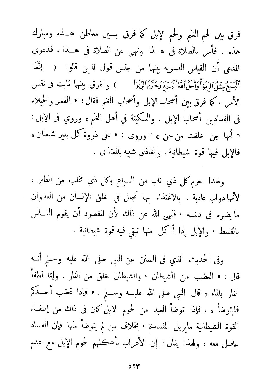فَرَّقَ بَيْنَ لَحْمِ الْغَنَمِ وَلَحْمِ الْإِبِلِ كَمَا فَرَّقَ بَيْنَ مَعَاطِنِ هَذِهِ وَمَبَارِكِ هَذِهِ فَأَمَرَ بِالصَّلَاةِ فِي هَذَا وَنَهَى عَنْ الصَّلَاةِ فِي هَذَا فَدَعْوَى الْمُدَّعِي أَنَّ الْقِيَاسَ التَّسْوِيَةُ بَيْنَهُمَا مِنْ جِنْسِ قَوْلِ الَّذِينَ قَالُوا {إنَّمَا الْبَيْعُ مِثْلُ الرِّبَا وَأَحَلَّ اللَّهُ الْبَيْعَ وَحَرَّمَ الرِّبَا} وَالْفَرْقُ بَيْنَهُمَا ثَابِتٌ فِي نَفْسِ الْأَمْرِ كَمَا فَرَّقَ بَيْنَ أَصْحَابِ الْإِبِلِ وَأَصْحَابِ الْغَنَمِ فَقَالَ: {الْفَخْرُ وَالْخُيَلَاءُ فِي الْفَدَادِينِ أَصْحَابِ الْإِبِلِ وَالسَّكِينَةِ فِي أَهْلِ الْغَنَمِ} {وَرُوِيَ فِي الْإِبِلِ: أَنَّهَا جِنٌّ خُلِقَتْ مِنْ جِنٍّ وَرُوِيَ: عَلَى ذُرْوَةِ كُلِّ بَعِيرٍ شَيْطَانٌ} فَالْإِبِلُ فِيهَا قُوَّةٌ شَيْطَانِيَّةٌ وَالْغَاذِي شَبِيهٌ بِالْمُغْتَذَى. وَلِهَذَا حَرُمَ كُلُّ ذِي نَابٍ مِنْ السِّبَاعِ وَكُلُّ ذِي مِخْلَبٍ مِنْ الطَّيْرِ: لِأَنَّهَا دَوَابُّ عَادِيَةٌ بِالِاغْتِذَاءِ بِهَا تَجْعَلُ فِي خُلُقِ الْإِنْسَانِ مِنْ الْعُدْوَانِ مَا يَضُرُّهُ فِي دِينِهِ فَنَهَى اللَّهُ عَنْ ذَلِكَ لِأَنَّ الْمَقْصُودَ أَنْ يَقُومَ النَّاسُ بِالْقِسْطِ وَالْإِبِلُ إذَا أَكَلَ مِنْهَا تُبْقِي فِيهِ قُوَّةً شَيْطَانِيَّةً. وَفِي الْحَدِيثِ الَّذِي فِي السُّنَنِ عَنْ النَّبِيِّ صَلَّى اللَّهُ عَلَيْهِ وَسَلَّمَ أَنَّهُ قَالَ: {الْغَضَبُ مِنْ الشَّيْطَانِ وَالشَّيْطَانُ خُلِقَ مِنْ النَّارِ وَإِنَّمَا تُطْفَأُ النَّارُ بِالْمَاءِ قَالَ النَّبِيُّ صَلَّى اللَّهُ عَلَيْهِ وَسَلَّمَ فَإِذَا غَضِبَ أَحَدُكُمْ فَلْيَتَوَضَّأْ} فَإِذَا تَوَضَّأَ الْعَبْدُ مِنْ لُحُومِ الْإِبِلِ كَانَ فِي ذَلِكَ مِنْ إطْفَاءِ الْقُوَّةِ الشَّيْطَانِيَّةِ مَا يُزِيلُ الْمَفْسَدَةَ بِخِلَافِ مَنْ لَمْ يَتَوَضَّأْ مِنْهَا فَإِنَّ الْفَسَادَ حَاصِلٌ مَعَهُ وَلِهَذَا يُقَالُ: إنَّ الْأَعْرَابَ بِأَكْلِهِمْ لُحُومَ الْإِبِلِ مَعَ عَدَمِ