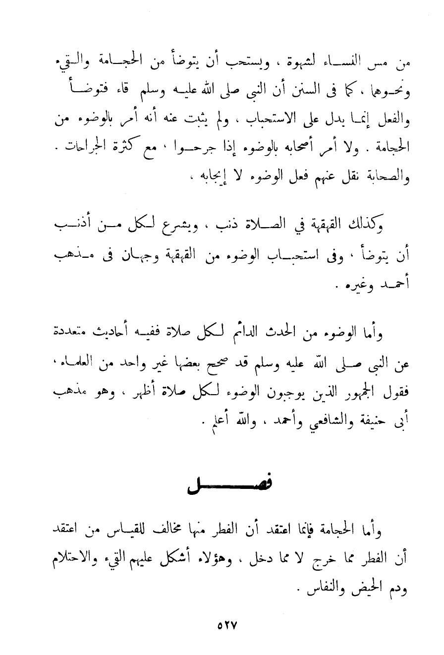 مِنْ مَسِّ النِّسَاءِ لِشَهْوَةِ وَيُسْتَحَبُّ أَنْ يَتَوَضَّأَ مِنْ الْحِجَامَةِ وَالْقَيْءِ وَنَحْوِهِمَا كَمَا فِي السُّنَنِ {أَنَّ النَّبِيَّ صَلَّى اللَّهُ عَلَيْهِ وَسَلَّمَ قَاءَ فَتَوَضَّأَ} وَالْفِعْلُ إنَّمَا يَدُلُّ عَلَى الِاسْتِحْبَابِ وَلَمْ يَثْبُتْ عَنْهُ أَنَّهُ أَمَرَ بِالْوُضُوءِ مِنْ الْحِجَامَةِ وَلَا أَمَرَ أَصْحَابَهُ بِالْوُضُوءِ إذَا جُرِحُوا مَعَ كَثْرَةِ الْجِرَاحَاتِ وَالصَّحَابَةُ نُقِلَ عَنْهُمْ فِعْلُ الْوُضُوءِ لَا إيجَابُهُ. وَكَذَلِكَ الْقَهْقَهَةُ فِي الصَّلَاةِ ذَنْبٌ وَيُشْرَعُ لِكُلِّ مَنْ أَذْنَبَ أَنْ يَتَوَضَّأَ وَفِي اسْتِحْبَابِ الْوُضُوءِ مِنْ الْقَهْقَهَةِ وَجْهَانِ فِي مَذْهَبِ أَحْمَد وَغَيْرِهِ. وَأَمَّا الْوُضُوءُ مِنْ الْحَدَثِ الدَّائِمِ لِكُلِّ صَلَاةٍ فَفِيهِ أَحَادِيثُ مُتَعَدِّدَةٌ عَنْ النَّبِيِّ صَلَّى اللَّهُ عَلَيْهِ وَسَلَّمَ قَدّ صَحَّحَ بَعْضَهَا غَيْرُ وَاحِدٍ مِنْ الْعُلَمَاءِ فَقَوْلُ الْجُمْهُورِ الَّذِينَ يُوجِبُونَ الْوُضُوءَ لِكُلِّ صَلَاةٍ أَظْهَرُ؛ وَهُوَ مَذْهَبُ أَبِي حَنِيفَةَ وَالشَّافِعِيِّ وَأَحْمَد وَاَللَّهُ أَعْلَمُ.