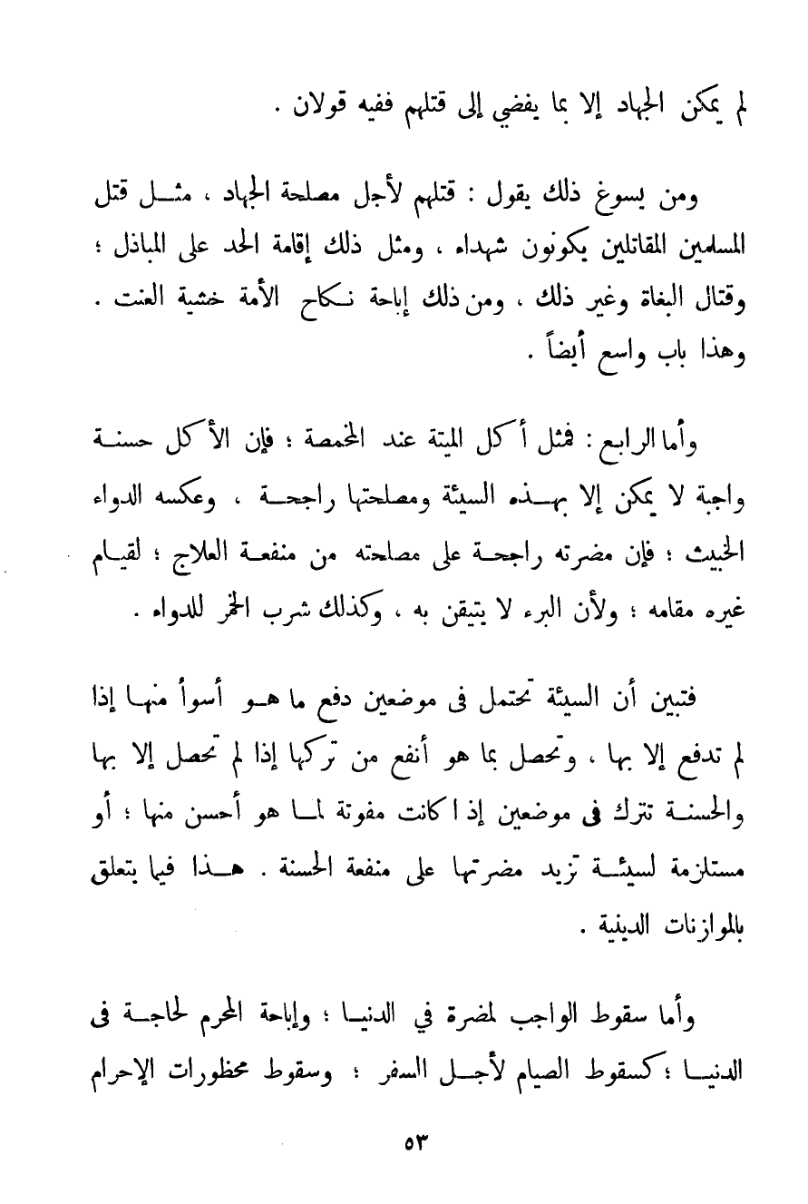 لَمْ يُمْكِنْ الْجِهَادُ إلَّا بِمَا يُفْضِي إلَى قَتْلِهِمْ فَفِيهِ قَوْلَانِ. وَمَنْ يُسَوِّغُ ذَلِكَ يَقُولُ: قَتْلُهُمْ لِأَجْلِ مَصْلَحَةِ الْجَلَّادِ مِثْلَ قَتْلِ الْمُسْلِمِينَ الْمُقَاتِلِينَ يَكُونُونَ شُهَدَاءَ وَمِثْلُ ذَلِكَ إقَامَةُ الْحَدِّ عَلَى الْمَبَاذِلِ؛ وَقِتَالِ الْبُغَاةِ وَغَيْرِ ذَلِكَ وَمِنْ ذَلِكَ إبَاحَةُ نِكَاحِ الْأَمَةِ خَشْيَةَ الْعَنَتِ. وَهَذَا بَابٌ وَاسِعٌ أَيْضًا. وَأَمَّا الرَّابِعُ: فَمِثْلُ أَكْلِ الْمَيْتَةِ عِنْدَ الْمَخْمَصَةِ؛ فَإِنَّ الْأَكْلَ حَسَنَةٌ وَاجِبَةٌ لَا يُمْكِنُ إلَّا بِهَذِهِ السَّيِّئَةِ وَمَصْلَحَتُهَا رَاجِحَةٌ وَعَكْسُهُ الدَّوَاءُ الْخَبِيثُ؛ فَإِنَّ مَضَرَّتَهُ رَاجِحَةٌ عَلَى مَصْلَحَتِهِ مِنْ مَنْفَعَةِ الْعِلَاجِ لِقِيَامِ غَيْرِهِ مَقَامَهُ؛ وَلِأَنَّ الْبُرْءَ لَا يُتَيَقَّنُ بِهِ وَكَذَلِكَ شُرْبُ الْخَمْرِ لِلدَّوَاءِ. فَتَبَيَّنَ أَنَّ السَّيِّئَةَ تُحْتَمَلُ فِي مَوْضِعَيْنِ دَفْعِ مَا هُوَ أَسْوَأُ مِنْهَا إذَا لَمْ تُدْفَعْ إلَّا بِهَا وَتَحْصُلُ بِمَا هُوَ أَنْفَعُ مِنْ تَرْكِهَا إذَا لَمْ تَحْصُلْ إلَّا بِهَا وَالْحَسَنَةُ تُتْرَكُ فِي مَوْضِعَيْنِ إذَا كَانَتْ مُفَوِّتَةً لِمَا هُوَ أَحْسَنُ مِنْهَا؛ أَوْ مُسْتَلْزِمَةً لِسَيِّئَةٍ تَزِيدُ مَضَرَّتُهَا عَلَى مَنْفَعَةِ الْحَسَنَةِ. هَذَا فِيمَا يَتَعَلَّقُ بِالْمُوَازَنَاتِ الدِّينِيَّةِ. وَأَمَّا سُقُوطُ الْوَاجِبِ لِمَضَرَّةِ فِي الدُّنْيَا؛ وَإِبَاحَةُ الْمُحَرَّمِ لِحَاجَةِ فِي الدُّنْيَا؛ كَسُقُوطِ الصِّيَامِ لِأَجْلِ السَّفَرِ؛ وَسُقُوطِ مَحْظُورَاتِ الْإِحْرَامِ