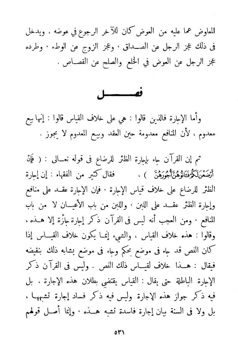 وَأَمَّا الْإِجَارَةُ فَاَلَّذِينَ قَالُوا: هِيَ عَلَى خِلَافِ الْقِيَاسِ قَالُوا: إنَّهَا بَيْعُ مَعْدُومٍ لِأَنَّ الْمَنَافِعَ مَعْدُومَةٌ حِينَ الْعَقْدِ وَبَيْعُ الْمَعْدُومِ لَا يَجُوزُ. ثُمَّ إنَّ الْقُرْآنَ جَاءَ بِإِجَارَةِ الظِّئْرِ لِلرَّضَاعِ فِي قَوْله تَعَالَى {فَإِنْ أَرْضَعْنَ لَكُمْ فَآتُوهُنَّ أُجُورَهُنَّ} فَقَالَ كَثِيرٌ مِنْ الْفُقَهَاءِ: إنَّ إجَارَةَ الظِّئْرِ لِلرَّضَاعِ عَلَى خِلَافِ قِيَاسِ الْإِجَارَةِ فَإِنَّ الْإِجَارَةَ عَقْدٌ عَلَى مَنَافِعَ وَإِجَارَةُ الظِّئْرِ عَقْدٌ عَلَى اللَّبَنِ وَاللَّبَنُ مِنْ بَابِ الْأَعْيَانِ لَا مِنْ بَابِ الْمَنَافِعِ وَمِنْ الْعَجَبِ أَنَّهُ لَيْسَ فِي الْقُرْآنِ ذَكَرَ إجَارَةٍ جَائِزَةٍ إلَّا هَذِهِ وَقَالُوا: هَذِهِ خِلَافُ الْقِيَاسِ وَالشَّيْءُ إنَّمَا يَكُونُ خِلَافَ الْقِيَاسِ إذَا كَانَ النَّصُّ قَدْ جَاءَ فِي مَوْضِعٍ بِحُكْمِ وَجَاءَ فِي مَوْضِعٍ يُشَابِهُ ذَلِكَ بِنَقِيضِهِ فَيُقَالُ: هَذَا خِلَافٌ لِقِيَاسِ ذَلِكَ النَّصِّ. وَلَيْسَ فِي الْقُرْآنِ ذِكْرُ الْإِجَارَةِ الْبَاطِلَةِ حَتَّى يُقَالَ: الْقِيَاسُ يَقْتَضِي بُطْلَانَ هَذِهِ الْإِجَارَةِ بَلْ فِيهِ ذِكْرُ جَوَازِ هَذِهِ الْإِجَارَةِ وَلَيْسَ فِيهِ ذِكْرُ فَسَادِ إجَارَةٍ تُشْبِهُهَا بَلْ وَلَا فِي السُّنَّةِ بَيَانُ إجَارَةٍ فَاسِدَةٍ تُشْبِهُ هَذِهِ وَإِنَّمَا أَصْلُ قَوْلِهِمْ