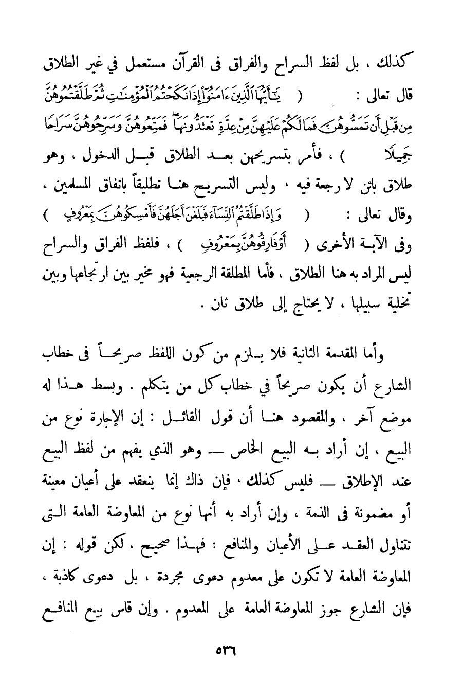 كَذَلِكَ بَلْ لَفْظُ السَّرَاحِ وَالْفِرَاقِ فِي الْقُرْآنِ مُسْتَعْمَلٌ فِي غَيْرِ الطَّلَاقِ قَالَ تَعَالَى: {يَا أَيُّهَا الَّذِينَ آمَنُوا إذَا نَكَحْتُمُ الْمُؤْمِنَاتِ ثُمَّ طَلَّقْتُمُوهُنَّ مِنْ قَبْلِ أَنْ تَمَسُّوهُنَّ فَمَا لَكُمْ عَلَيْهِنَّ مِنْ عِدَّةٍ تَعْتَدُّونَهَا فَمَتِّعُوهُنَّ وَسَرِّحُوهُنَّ سَرَاحًا جَمِيلًا} فَأَمَرَ بِتَسْرِيحِهِنَّ بَعْدَ الطَّلَاقِ قَبْلَ الدُّخُولِ وَهُوَ طَلَاقٌ بَائِنٌ لَا رَجْعَةَ فِيهِ وَلَيْسَ التَّسْرِيحُ هُنَا تَطْلِيقًا بِاتِّفَاقِ الْمُسْلِمِينَ وَقَالَ تَعَالَى: {وَإِذَا طَلَّقْتُمُ النِّسَاءَ فَبَلَغْنَ أَجَلَهُنَّ فَأَمْسِكُوهُنَّ بِمَعْرُوفٍ} وَفِي الْآيَةِ الْأُخْرَى {أَوْ فَارِقُوهُنَّ بِمَعْرُوفٍ} فَلَفْظُ الْفِرَاقِ وَالسَّرَاحِ لَيْسَ الْمُرَادُ بِهِ هُنَا الطَّلَاقَ فَأَمَّا الْمُطَلَّقَةُ الرَّجْعِيَّةُ فَهُوَ مُخَيَّرٌ بَيْنَ ارْتِجَاعِهَا وَبَيْنَ تَخْلِيَةِ سَبِيلِهَا لَا يَحْتَاجُ إلَى طَلَاقٍ ثَانٍ. وَأَمَّا الْمُقَدِّمَةُ الثَّانِيَةُ فَلَا يَلْزَمُ مِنْ كَوْنِ اللَّفْظِ صَرِيحًا فِي خِطَابِ الشَّارِعِ أَنْ يَكُونَ صَرِيحًا فِي خِطَابِ كُلِّ مَنْ يَتَكَلَّمُ. وَبَسْطُ هَذَا لَهُ مَوْضِعٌ آخَرُ وَالْمَقْصُودُ هُنَا أَنَّ قَوْلَ الْقَائِلِ: إنَّ الْإِجَارَةَ نَوْعٌ مِنْ الْبَيْعِ إنْ أَرَادَ بِهِ الْبَيْعَ الْخَاصَّ - وَهُوَ الَّذِي يُفْهَمُ مِنْ لَفْظِ الْبَيْعِ عِنْدَ الْإِطْلَاقِ - فَلَيْسَ كَذَلِكَ فَإِنَّ ذَاكَ إنَّمَا يَنْعَقِدُ عَلَى أَعْيَانٍ مُعَيَّنَةٍ أَوْ مَضْمُونَةٍ فِي الذِّمَّةِ وَإِنْ أَرَادَ بِهِ أَنَّهَا نَوْعٌ مِنْ الْمُعَاوَضَةِ الْعَامَّةِ الَّتِي تَتَنَاوَلُ الْعَقْدَ عَلَى الْأَعْيَانِ وَالْمَنَافِعِ: فَهَذَا صَحِيحٌ لَكِنَّ قَوْلَهُ؛ إنَّ الْمُعَاوَضَةَ الْعَامَّةَ لَا تَكُونُ عَلَى مَعْدُومِ دَعْوَى مُجَرَّدَةٍ بَلْ دَعْوَى كَاذِبَةٍ فَإِنَّ الشَّارِعَ جَوَّزَ الْمُعَاوَضَةَ الْعَامَّةَ عَلَى الْمَعْدُومِ. وَإِنْ قَاسَ بَيْعَ الْمَنَافِعِ