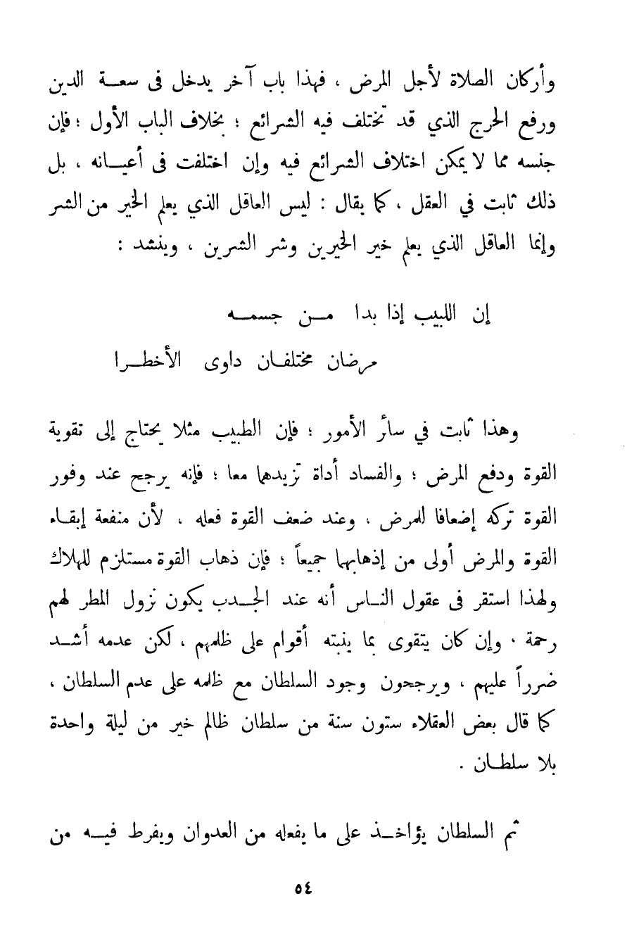 وَأَرْكَانِ الصَّلَاةِ لِأَجْلِ الْمَرَضِ فَهَذَا بَابٌ آخَرُ يَدْخُلُ فِي سِعَةِ الدِّينِ وَرَفْعِ الْحَرَجِ الَّذِي قَدْ تَخْتَلِفُ فِيهِ الشَّرَائِعُ؛ بِخِلَافِ الْبَابِ الْأَوَّلِ؛ فَإِنَّ جِنْسَهُ مِمَّا لَا يُمْكِنُ اخْتِلَافُ الشَّرَائِعِ فِيهِ وَإِنْ اخْتَلَفَتْ فِي أَعْيَانِهِ بَلْ ذَلِكَ ثَابِتٌ فِي الْعَقْلِ كَمَا يُقَالُ: لَيْسَ الْعَاقِلُ الَّذِي يَعْلَمُ الْخَيْرَ مِنْ الشَّرِّ وَإِنَّمَا الْعَاقِلُ الَّذِي يَعْلَمُ خَيْرَ الْخَيْرَيْنِ وَشَرَّ الشَّرَّيْنِ وَيَنْشُدُ: إنَّ اللَّبِيبَ إذَا بَدَا مِنْ جِسْمِهِ مَرَضَانِ مُخْتَلِفَانِ دَاوَى الْأَخْطَرَا وَهَذَا ثَابِتٌ فِي سَائِرِ الْأُمُورِ؛ فَإِنَّ الطَّبِيبَ مَثَلًا يَحْتَاجُ إلَى تَقْوِيَةِ الْقُوَّةِ وَدَفْعِ الْمَرَضِ؛ وَالْفَسَادُ أَدَاةٌ تَزِيدُهُمَا مَعًا؛ فَإِنَّهُ يُرَجَّحُ عِنْدَ وُفُورِ الْقُوَّةِ تَرْكُهُ إضْعَافًا لِلْمَرَضِ وَعِنْدَ ضَعْفِ الْقُوَّةِ فِعْلُهُ لِأَنَّ مَنْفَعَةَ إبْقَاءِ الْقُوَّةِ وَالْمَرَضِ أَوْلَى مِنْ إذْهَابِهِمَا جَمِيعًا؛ فَإِنَّ ذَهَابَ الْقُوَّةِ مُسْتَلْزِمٌ لِلْهَلَاكِ وَلِهَذَا اسْتَقَرَّ فِي عُقُولِ النَّاسِ أَنَّهُ عِنْدَ الْجَدْبِ يَكُونُ نُزُولُ الْمَطَرِ لَهُمْ رَحْمَةً وَإِنْ كَانَ يَتَقَوَّى بِمَا يُنْبِتُهُ أَقْوَامٌ عَلَى ظُلْمِهِمْ لَكِنَّ عَدَمَهُ أَشَدُّ ضَرَرًا عَلَيْهِمْ وَيُرَجِّحُونَ وُجُودَ السُّلْطَانِ مَعَ ظُلْمِهِ عَلَى عَدَمِ السُّلْطَانِ كَمَا قَالَ بَعْضُ الْعُقَلَاءِ سِتُّونَ سَنَةً مِنْ سُلْطَانٍ ظَالِمٍ خَيْرٌ مِنْ لَيْلَةٍ وَاحِدَةٍ بِلَا سُلْطَانٍ. ثُمَّ السُّلْطَانُ يُؤَاخَذُ عَلَى مَا يَفْعَلُهُ مِنْ الْعُدْوَانِ وَيُفَرِّطُ فِيهِ مِنْ