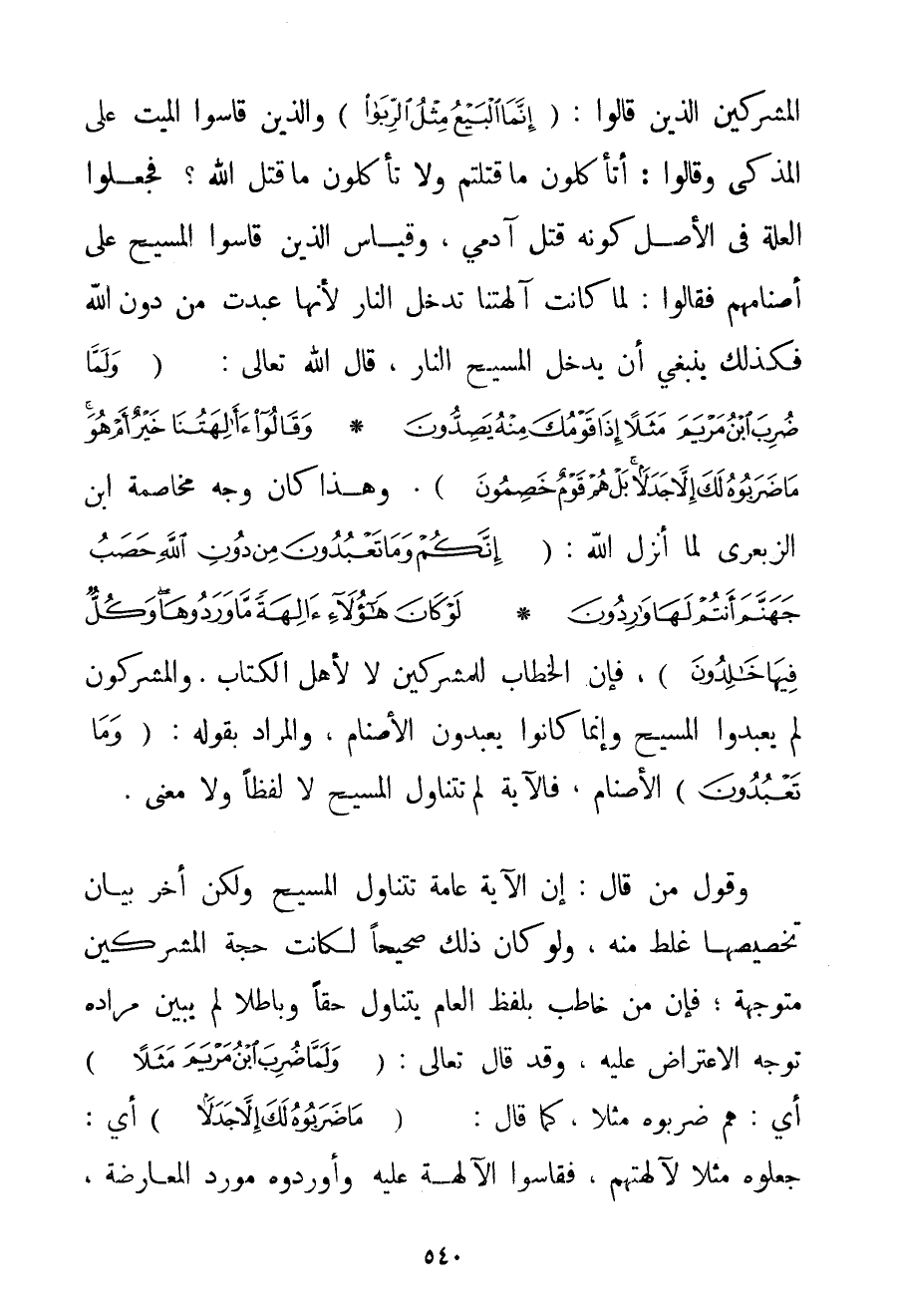 الْمُشْرِكِينَ الَّذِينَ قَالُوا: {إنَّمَا الْبَيْعُ مِثْلُ الرِّبَا} وَاَلَّذِينَ قَاسُوا الْمَيِّتَ عَلَى الْمُذَكَّى وَقَالُوا: أَتَأْكُلُونَ مَا قَتَلْتُمْ وَلَا تَأْكُلُونَ مَا قَتَلَ اللَّهُ؟ فَجَعَلُوا الْعِلَّةَ فِي الْأَصْلِ كَوْنَهُ قَتْلَ آدَمِيٍّ وَقِيَاسِ الَّذِينَ قَاسُوا الْمَسِيحَ عَلَى أَصْنَامِهِمْ فَقَالُوا: لَمَّا كَانَتْ آلِهَتُنَا تَدْخُلُ النَّارَ لِأَنَّهَا عُبِدَتْ مِنْ دُونِ اللَّهِ فَكَذَلِكَ يَنْبَغِي أَنْ يَدْخُلَ الْمَسِيحُ النَّارَ قَالَ اللَّهُ تَعَالَى: {وَلَمَّا ضُرِبَ ابْنُ مَرْيَمَ مَثَلًا إذَا قَوْمُكَ مِنْهُ يَصِدُّونَ} {وَقَالُوا أَآلِهَتُنَا خَيْرٌ أَمْ هُوَ مَا ضَرَبُوهُ لَكَ إلَّا جَدَلًا بَلْ هُمْ قَوْمٌ خَصِمُونَ} وَهَذَا كَانَ وَجْهَ مُخَاصَمَةِ ابْنِ الزبعرى لَمَّا أَنْزَلَ اللَّهُ: {إنَّكُمْ وَمَا تَعْبُدُونَ مِنْ دُونِ اللَّهِ حَصَبُ جَهَنَّمَ أَنْتُمْ لَهَا وَارِدُونَ} {لَوْ كَانَ هَؤُلَاءِ آلِهَةً مَا وَرَدُوهَا وَكُلٌّ فِيهَا خَالِدُونَ} فَإِنَّ الْخِطَابَ لِلْمُشْرِكِينَ لَا لِأَهْلِ الْكِتَابِ. وَالْمُشْرِكُونَ لَمْ يَعْبُدُوا الْمَسِيحَ وَإِنَّمَا كَانُوا يَعْبُدُونَ الْأَصْنَامَ وَالْمُرَادُ بِقَوْلِهِ: {وَمَا تَعْبُدُونَ} الْأَصْنَامَ فَالْآيَةُ لَمْ تَتَنَاوَلْ الْمَسِيحَ لَا لَفْظًا وَلَا مَعْنًى. وَقَوْلُ مَنْ قَالَ: إنَّ الْآيَةَ عَامَّةٌ تَتَنَاوَلُ الْمَسِيحَ وَلَكِنْ أُخِّرَ بَيَانُ تَخْصِيصِهَا غَلَطٌ مِنْهُ وَلَوْ كَانَ ذَلِكَ صَحِيحًا لَكَانَتْ حُجَّةُ الْمُشْرِكِينَ مُتَوَجِّهَةً؛ فَإِنَّ مَنْ خَاطَبَ بِلَفْظِ الْعَامِّ يَتَنَاوَلُ حَقًّا وَبَاطِلًا لَمْ يُبَيِّنْ مُرَادَهُ تَوَجَّهَ الِاعْتِرَاضُ عَلَيْهِ وَقَدْ قَالَ تَعَالَى: {وَلَمَّا ضُرِبَ ابْنُ مَرْيَمَ مَثَلًا} أَيْ: هُمْ ضَرَبُوهُ مَثَلًا كَمَا قَالَ: {مَا ضَرَبُوهُ لَكَ إلَّا جَدَلًا} أَيْ: جَعَلُوهُ مَثَلًا لِآلِهَتِهِمْ فَقَاسُوا الْآلِهَةَ عَلَيْهِ وَأَوْرَدُوهُ مَوْرِدَ الْمُعَارَضَةِ