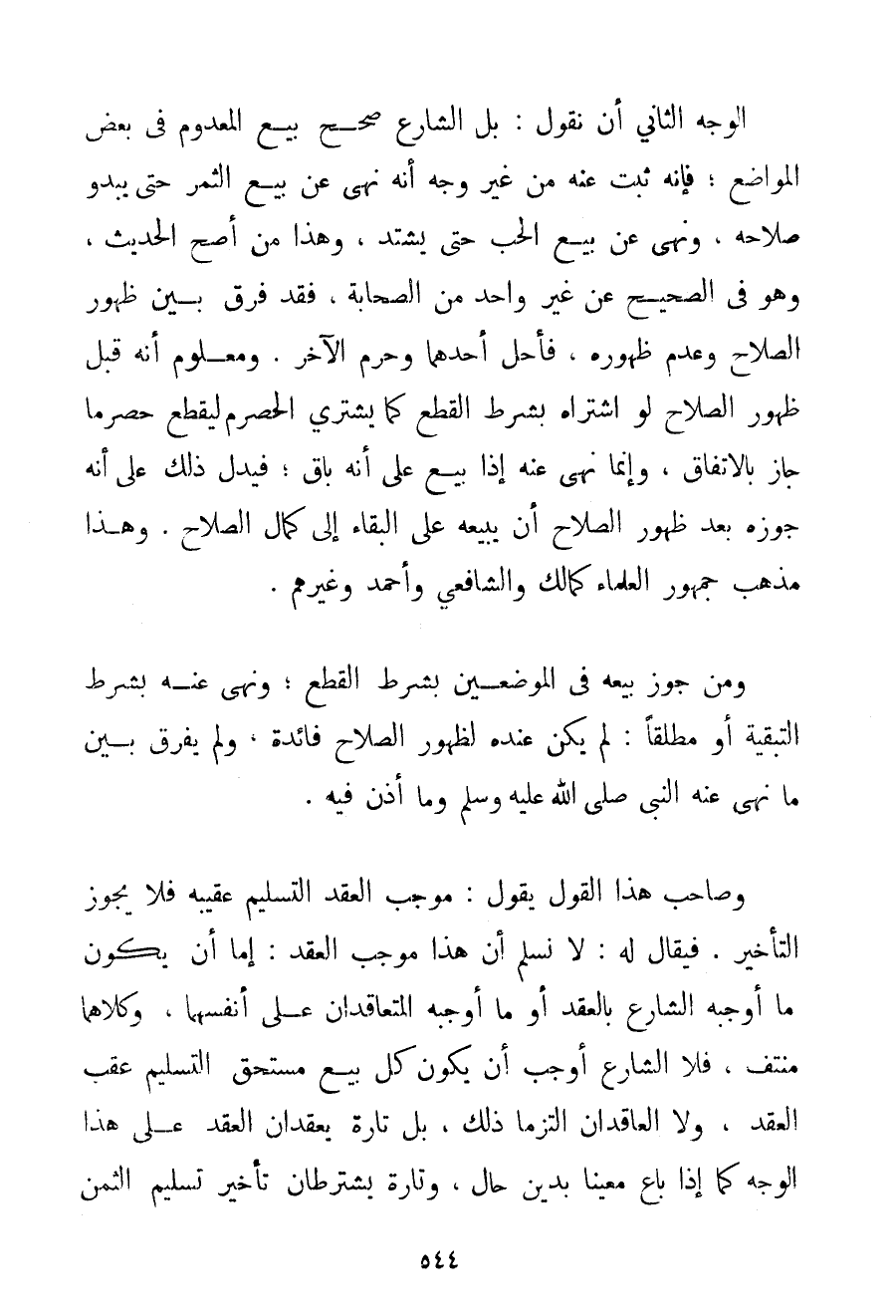 الْوَجْهُ الثَّانِي أَنْ نَقُولَ: بَلْ الشَّارِعُ صَحَّحَ بَيْعَ الْمَعْدُومِ فِي بَعْضِ الْمَوَاضِعِ فَإِنَّهُ ثَبَتَ عَنْهُ مِنْ غَيْرِ وَجْهٍ {أَنَّهُ نَهَى عَنْ بَيْعِ الثَّمَرِ حَتَّى يَبْدُوَ صَلَاحُهُ} {وَنَهَى عَنْ بَيْعِ الْحَبِّ حَتَّى يَشْتَدَّ} وَهَذَا مِنْ أَصَحِّ الْحَدِيثِ وَهُوَ فِي الصَّحِيحِ عَنْ غَيْرِ وَاحِدٍ مِنْ الصَّحَابَةِ قَدْ فَرَّقَ بَيْنَ ظُهُورِ الصَّلَاحِ وَعَدَمِ ظُهُورِهِ فَأَحَلَّ أَحَدَهُمَا وَحَرَّمَ الْآخَرَ. وَمَعْلُومٌ أَنَّهُ قَبْلَ ظُهُورِ الصَّلَاحِ لَوْ اشْتَرَاهُ بِشَرْطِ الْقَطْعِ كَمَا يَشْتَرِي الْحِصْرِمَ لِيَقْطَعَ حِصْرِمًا جَازَ بِالِاتِّفَاقِ وَإِنَّمَا نَهَى عَنْهُ إذَا بِيعَ عَلَى أَنَّهُ بَاقٍ؛ فَيَدُلُّ ذَلِكَ عَلَى أَنَّهُ جَوَّزَهُ بَعْدَ ظُهُورِ الصَّلَاحِ أَنْ يَبِيعَهُ عَلَى الْبَقَاءِ إلَى كَمَالِ الصَّلَاحِ وَهَذَا مَذْهَبُ جُمْهُورِ الْعُلَمَاءِ كَمَالِكِ وَالشَّافِعِيِّ وَأَحْمَدَ وَغَيْرِهِمْ. وَمَنْ جَوَّزَ بَيْعَهُ فِي الْمَوْضِعَيْنِ بِشَرْطِ الْقَطْعِ؛ وَنَهَى عَنْهُ بِشَرْطِ التَّبْقِيَةِ أَوْ مُطْلَقًا: لَمْ يَكُنْ عِنْدَهُ لِظُهُورِ الصَّلَاحِ فَائِدَةٌ وَلَمْ يُفَرِّقْ بَيْنَ مَا نَهَى عَنْهُ النَّبِيُّ صَلَّى اللَّهُ عَلَيْهِ وَسَلَّمَ وَمَا أَذِنَ فِيهِ. وَصَاحِبُ هَذَا الْقَوْلِ يَقُولُ: مُوجَبُ الْعَقْدِ التَّسْلِيمُ عَقِيبَهُ فَلَا يَجُوزُ التَّأْخِيرُ. فَيُقَالُ لَهُ: لَا نُسَلِّمُ أَنَّ هَذَا مُوجِبُ الْعَقْدِ: إمَّا أَنْ يَكُونَ مَا أَوْجَبَهُ الشَّارِعُ بِالْعَقْدِ أَوْ مَا أَوْجَبَهُ الْمُتَعَاقِدَانِ عَلَى أَنْفُسِهِمَا وَكِلَاهُمَا مُنْتَفٍ فَلَا الشَّارِعُ أَوْجَبَ أَنْ يَكُونَ كُلُّ بَيْعٍ مُسْتَحِقٍّ التَّسْلِيمَ عَقِبَ الْعَقْدِ وَلَا الْعَاقِدَانِ الْتَزَمَا ذَلِكَ بَلْ تَارَةً يَعْقِدَانِ الْعَقْدَ عَلَى هَذَا الْوَجْهِ كَمَا إذَا بَاعَ مُعَيَّنًا بِدَيْنِ حَالٍّ وَتَارَةً يَشْتَرِطَانِ تَأْخِيرَ تَسْلِيمِ الثَّمَنِ