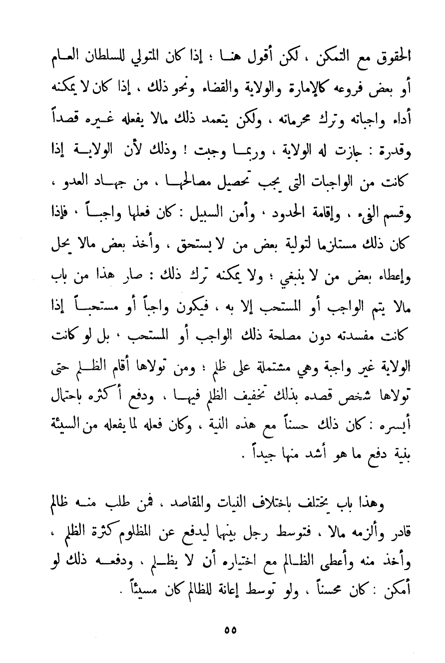 الْحُقُوقِ مَعَ التَّمَكُّنِ لَكِنْ أَقُولُ هُنَا؛ إذَا كَانَ الْمُتَوَلِّي لِلسُّلْطَانِ الْعَامَّ أَوْ بَعْضَ فُرُوعِهِ كَالْإِمَارَةِ وَالْوِلَايَةِ وَالْقَضَاءِ وَنَحْوُ ذَلِكَ إذَا كَانَ لَا يُمْكِنُهُ أَدَاءُ وَاجِبَاتِهِ وَتَرْكُ مُحَرَّمَاتِهِ وَلَكِنْ يَتَعَمَّدُ ذَلِكَ مَا لَا يَفْعَلُهُ غَيْرُهُ قَصْدًا وَقُدْرَةً: جَازَتْ لَهُ الْوِلَايَةُ وَرُبَّمَا وَجَبَتْ وَذَلِكَ لِأَنَّ الْوِلَايَةَ إذَا كَانَتْ مِنْ الْوَاجِبَاتِ الَّتِي يَجِبُ تَحْصِيلُ مَصَالِحهَا مِنْ جِهَادِ الْعَدُوِّ وَقَسْمِ الْفَيْءِ وَإِقَامَةِ الْحُدُودِ وَأَمْنِ السَّبِيلِ: كَانَ فِعْلُهَا وَاجِبًا فَإِذَا كَانَ ذَلِكَ مُسْتَلْزِمًا لِتَوْلِيَةِ بَعْضِ مَنْ لَا يَسْتَحِقُّ وَأَخْذِ بَعْضِ مَا لَا يَحِلُّ وَإِعْطَاءِ بَعْضِ مَنْ لَا يَنْبَغِي؛ وَلَا يُمْكِنُهُ تَرْكُ ذَلِكَ: صَارَ هَذَا مِنْ بَابِ مَا لَا يَتِمُّ الْوَاجِبُ أَوْ الْمُسْتَحَبُّ إلَّا بِهِ فَيَكُونُ وَاجِبًا أَوْ مُسْتَحَبًّا إذَا كَانَتْ مَفْسَدَتُهُ دُونَ مَصْلَحَةِ ذَلِكَ الْوَاجِبِ أَوْ الْمُسْتَحَبِّ بَلْ لَوْ كَانَتْ الْوِلَايَةُ غَيْرَ وَاجِبَةٍ وَهِيَ مُشْتَمِلَةٌ عَلَى ظُلْمٍ؛ وَمَنْ تَوَلَّاهَا أَقَامَ الظُّلْمَ حَتَّى تَوَلَّاهَا شَخْصٌ قَصْدُهُ بِذَلِكَ تَخْفِيفُ الظُّلْمِ فِيهَا. وَدَفْعُ أَكْثَرِهِ بِاحْتِمَالِ أَيْسَرِهِ: كَانَ ذَلِكَ حَسَنًا مَعَ هَذِهِ النِّيَّةِ وَكَانَ فِعْلُهُ لِمَا يَفْعَلُهُ مِنْ السَّيِّئَةِ بِنِيَّةِ دَفْعِ مَا هُوَ أَشَدُّ مِنْهَا جَيِّدًا. وَهَذَا بَابٌ يَخْتَلِفُ بِاخْتِلَافِ النِّيَّاتِ وَالْمَقَاصِدِ فَمَنْ طَلَبَ مِنْهُ ظَالِمٌ قَادِرٌ وَأَلْزَمَهُ مَالًا فَتَوَسَّطَ رَجُلٌ بَيْنَهُمَا لِيَدْفَعَ عَنْ الْمَظْلُومِ كَثْرَةَ الظُّلْمِ وَأَخَذَ مِنْهُ وَأَعْطَى الظَّالِمَ مَعَ اخْتِيَارِهِ أَنْ لَا يَظْلِمَ وَدَفْعَهُ ذَلِكَ لَوْ أَمْكَنَ: كَانَ مُحْسِنًا وَلَوْ تَوَسَّطَ إعَانَةً لِلظَّالِمِ كَانَ مُسِيئًا.