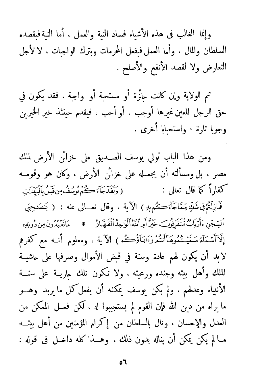 وَإِنَّمَا الْغَالِبُ فِي هَذِهِ الْأَشْيَاءِ فَسَادُ النِّيَّةِ وَالْعَمَلِ أَمَّا النِّيَّةُ فَبِقَصْدِهِ. السُّلْطَانَ وَالْمَالَ وَأَمَّا الْعَمَلُ فَبِفِعْلِ الْمُحَرَّمَاتِ وَبِتَرْكِ الْوَاجِبَاتِ لَا لِأَجْلِ التَّعَارُضِ وَلَا لِقَصْدِ الْأَنْفَعِ وَالْأَصْلَحِ. ثُمَّ الْوِلَايَةُ وَإِنْ كَانَتْ جَائِزَةً أَوْ مُسْتَحَبَّةً أَوْ وَاجِبَةً فَقَدْ يَكُونُ فِي حَقِّ الرَّجُلِ الْمُعِينِ غَيْرُهَا أَوْجَبُ. أَوْ أَحَبُّ فَيُقَدَّمُ حِينَئِذٍ خَيْرُ الْخَيْرَيْنِ وُجُوبًا تَارَةً وَاسْتِحْبَابًا أُخْرَى. وَمِنْ هَذَا الْبَابِ تَوَلِّي يُوسُفَ الصِّدِّيقَ عَلَى خَزَائِنِ الْأَرْضِ لِمَلِكِ مِصْرَ بَلْ وَمَسْأَلَتُهُ أَنْ يَجْعَلَهُ عَلَى خَزَائِنِ الْأَرْضِ وَكَانَ هُوَ وَقَوْمُهُ كُفَّارًا كَمَا قَالَ تَعَالَى: {وَلَقَدْ جَاءَكُمْ يُوسُفُ مِنْ قَبْلُ بِالْبَيِّنَاتِ فَمَا زِلْتُمْ فِي شَكٍّ مِمَّا جَاءَكُمْ بِهِ} الْآيَةَ وَقَالَ تَعَالَى عَنْهُ: {يَا صَاحِبَيِ السِّجْنِ أَأَرْبَابٌ مُتَفَرِّقُونَ خَيْرٌ أَمِ اللَّهُ الْوَاحِدُ الْقَهَّارُ} {مَا تَعْبُدُونَ مِنْ دُونِهِ إلَّا أَسْمَاءً سَمَّيْتُمُوهَا أَنْتُمْ وَآبَاؤُكُمْ} الْآيَةَ وَمَعْلُومٌ أَنَّهُ مَعَ كُفْرِهِمْ لَا بُدَّ أَنْ يَكُونَ لَهُمْ عَادَةٌ وَسُنَّةٌ فِي قَبْضِ الْأَمْوَالِ وَصَرْفِهَا عَلَى حَاشِيَةِ الْمَلِكِ وَأَهْلِ بَيْتِهِ وَجُنْدِهِ وَرَعِيَّتِهِ وَلَا تَكُونُ تِلْكَ جَارِيَةً عَلَى سُنَّةِ الْأَنْبِيَاءِ وَعَدْلِهِمْ وَلَمْ يَكُنْ يُوسُفُ يُمْكِنُهُ أَنْ يَفْعَلَ كُلَّ مَا يُرِيدُ وَهُوَ مَا يَرَاهُ مِنْ دِينِ اللَّهِ فَإِنَّ الْقَوْمَ لَمْ يَسْتَجِيبُوا لَهُ لَكِنْ فَعَلَ الْمُمْكِنَ مِنْ الْعَدْلِ وَالْإِحْسَانِ وَنَالَ بِالسُّلْطَانِ مِنْ إكْرَامِ الْمُؤْمِنِينَ مِنْ أَهْلِ بَيْتِهِ مَا لَمْ يَكُنْ يُمْكِنُ أَنْ يَنَالَهُ بِدُونِ ذَلِكَ وَهَذَا كُلُّهُ دَاخِلٌ فِي قَوْلِهِ: