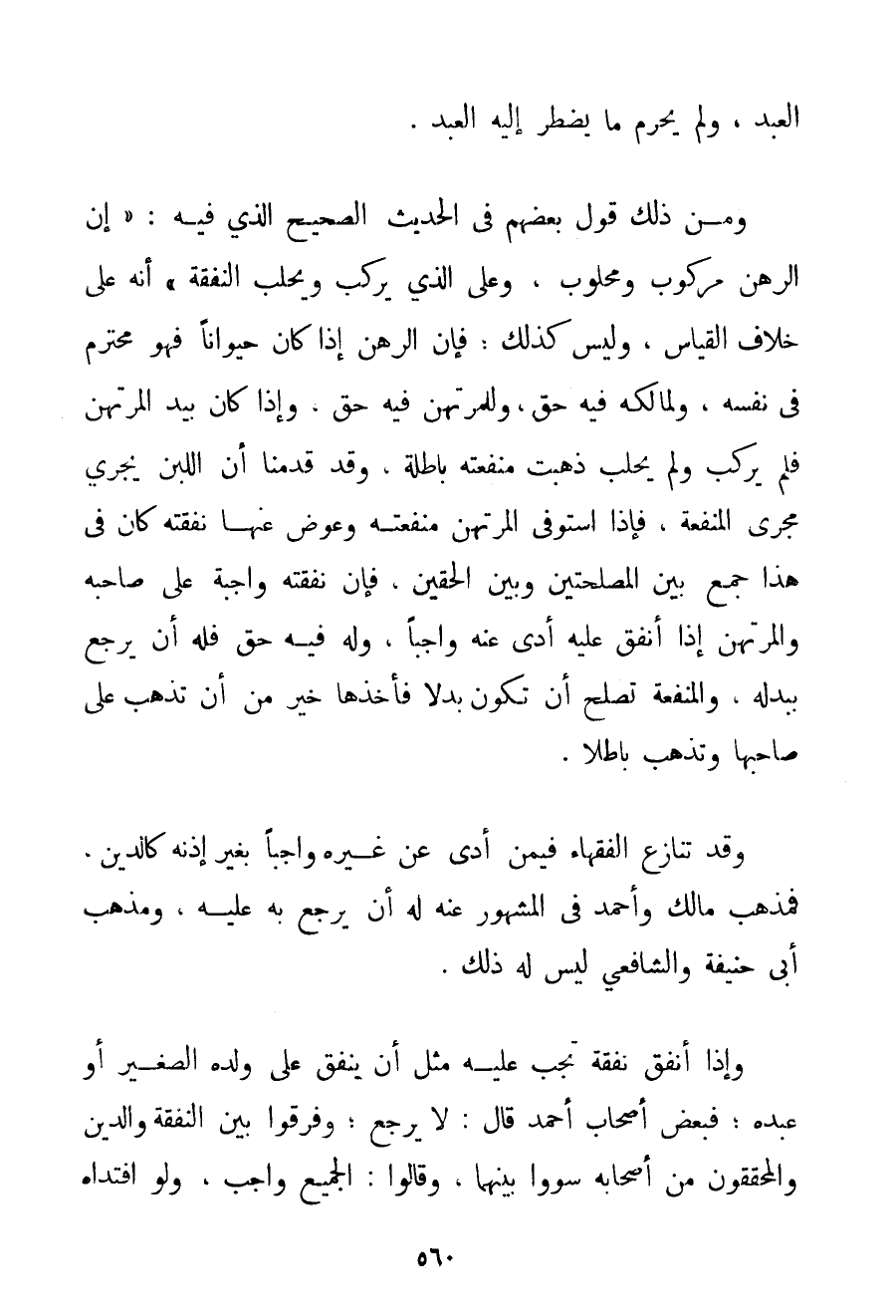 وَمِنْ ذَلِكَ قَوْلُ بَعْضِهِمْ فِي الْحَدِيثِ الصَّحِيحِ الَّذِي فِيهِ: {إنَّ الرَّهْنَ مَرْكُوبٌ وَمَحْلُوبٌ وَعَلَى الَّذِي يَرْكَبُ وَيَحْلِبُ النَّفَقَةُ} إنَّهُ عَلَى خِلَافِ الْقِيَاسِ وَلَيْسَ كَذَلِكَ؛ فَإِنَّ الرَّهْنَ إذَا كَانَ حَيَوَانًا فَهُوَ مُحْتَرَمٌ فِي نَفْسِهِ وَلِمَالِكِهِ فِيهِ حَقٌّ؛ وَلِلْمُرْتَهِنِ فِيهِ حَقٌّ وَإِذَا كَانَ بِيَدِ الْمُرْتَهِنِ فَلَمْ يَرْكَبْ وَلَمْ يَحْلِبْ ذَهَبَتْ مَنْفَعَتُهُ بَاطِلَةً وَقَدْ قَدَّمْنَا أَنَّ اللَّبَنَ يَجْرِي مَجْرَى الْمَنْفَعَةِ فَإِذَا اسْتَوْفَى الْمُرْتَهِنُ مَنْفَعَتَهُ وَعَوَّضَ عَنْهَا نَفَقَتَهُ كَانَ فِي هَذَا جَمْعٌ بَيْنَ الْمَصْلَحَتَيْنِ وَبَيْنَ الْحَقَّيْنِ فَإِنَّ نَفَقَتَهُ وَاجِبَةٌ عَلَى صَاحِبِهِ وَالْمُرْتَهِنُ إذَا أَنْفَقَ عَلَيْهِ أَدَّى عَنْهُ وَاجِبًا وَلَهُ فِيهِ حَقٌّ فَلَهُ أَنْ يَرْجِعَ بِبَدَلِهِ وَالْمَنْفَعَةُ تَصْلُحُ أَنْ تَكُونَ بَدَلًا فَأَخْذُهَا خَيْرٌ مِنْ أَنْ تَذْهَبَ عَلَى صَاحِبِهَا وَتَذْهَبَ بَاطِلًا. وَقَدْ تَنَازَعَ الْفُقَهَاءُ فِيمَنْ أَدَّى عَنْ غَيْرِهِ وَاجِبًا بِغَيْرِ إذْنِهِ كَالدَّيْنِ فَمَذْهَبُ مَالِكٍ وَأَحْمَد فِي الْمَشْهُورِ عَنْهُ لَهُ أَنْ يَرْجِعَ بِهِ عَلَيْهِ وَمَذْهَبُ أَبِي حَنِيفَةَ وَالشَّافِعِيِّ لَيْسَ لَهُ ذَلِكَ. وَإِذَا أَنْفَقَ نَفَقَةً تَجِبُ عَلَيْهِ مِثْلَ أَنْ يُنْفِقَ عَلَى وَلَدِهِ الصَّغِيرِ أَوْ عَبْدِهِ؛ فَبَعْضُ أَصْحَابِ أَحْمَد قَالَ: لَا يَرْجِعُ؛ وَفَرَّقُوا بَيْنَ النَّفَقَةِ وَالدَّيْنِ وَالْمُحَقِّقُونَ مِنْ أَصْحَابِهِ سَوَّوْا بَيْنَهُمَا وَقَالُوا: الْجَمِيعُ وَاجِبٌ وَلَوْ افْتَدَاهُ