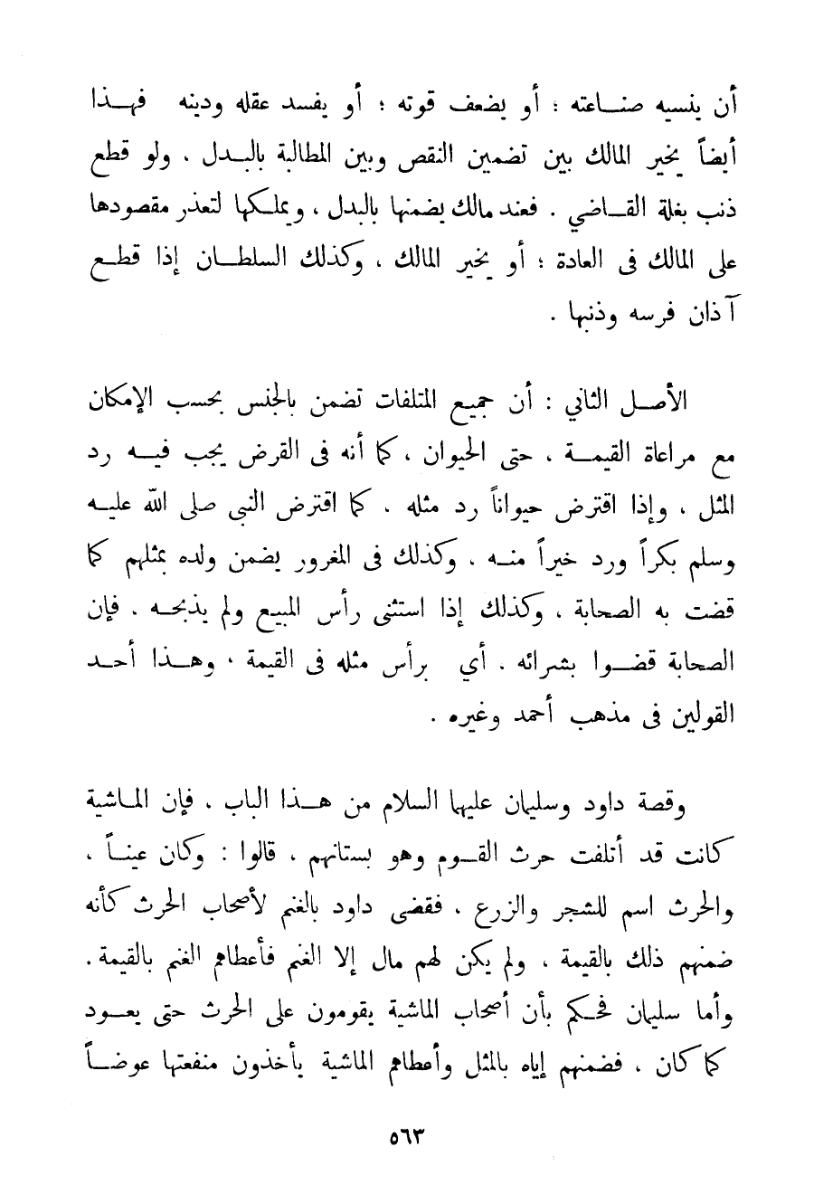 أَنْ يُنْسِيَهُ صِنَاعَتَهُ: أَوْ يُضْعِفَ قُوَّتَهُ؛ أَوْ يُفْسِدَ عَقْلَهُ وَدِينَهُ: فَهَذَا أَيْضًا يُخَيَّرُ الْمَالِكُ بَيْنَ تَضْمِينِ النَّقْصِ وَبَيْنَ الْمُطَالَبَةِ بِالْبَدَلِ وَلَوْ قَطَعَ ذَنَبَ بَغْلَةِ الْقَاضِي. فَعِنْدَ مَالِكٍ يَضْمَنُهَا بِالْبَدَلِ وَيَمْلِكُهَا لِتَعَذُّرِ مَقْصُودِهَا عَلَى الْمَالِكِ فِي الْعَادَةِ؛ أَوْ يُخَيَّرُ الْمَالِكُ وَكَذَلِكَ السُّلْطَانُ إذَا قَطَعَ آذَانَ فَرَسِهِ وَذَنَبَهَا. الْأَصْلُ الثَّانِي: أَنَّ جَمِيعَ الْمُتْلَفَاتِ تُضْمَنُ بِالْجِنْسِ بِحَسَبِ الْإِمْكَانِ مَعَ مُرَاعَاةِ الْقِيمَةِ حَتَّى الْحَيَوَانِ كَمَا أَنَّهُ فِي الْقَرْضِ يَجِبُ فِيهِ رَدُّ الْمِثْلِ وَإِذَا اقْتَرَضَ حَيَوَانًا رَدَّ مِثْلَهُ كَمَا {اقْتَرَضَ النَّبِيُّ صَلَّى اللَّهُ عَلَيْهِ وَسَلَّمَ بِكْرًا وَرَدَّ خَيْرًا مِنْهُ} وَكَذَلِكَ فِي الْمَغْرُورِ يُضْمَنُ وَلَدُهُ بِمِثْلِهِمْ كَمَا قَضَتْ بِهِ الصَّحَابَةُ وَكَذَلِكَ إذَا اسْتَثْنَى رَأْسَ الْمَبِيع وَلَمْ يَذْبَحْهُ فَإِنَّ الصَّحَابَةَ قَضَوْا بِشِرَائِهِ أَيْ: بِرَأْسِ مِثْلِهِ فِي الْقِيمَةِ وَهَذَا أَحَدُ الْقَوْلَيْنِ فِي مَذْهَبِ أَحْمَد وَغَيْرِهِ. وَقِصَّةُ دَاوُد وَسُلَيْمَانَ عَلَيْهِمَا السَّلَامُ مِنْ هَذَا الْبَابِ فَإِنَّ الْمَاشِيَةَ كَانَتْ قَدْ أَتْلَفَتْ حَرْثَ الْقَوْمِ وَهُوَ بُسْتَانُهُمْ قَالُوا: وَكَانَ عَيْنًا وَالْحَرْثُ اسْمٌ لِلشَّجَرِ وَالزَّرْعِ فَقَضَى دَاوُد بِالْغَنَمِ لِأَصْحَابِ الْحَرْثِ كَأَنَّهُ ضَمَّنَهُمْ ذَلِكَ بِالْقِيمَةِ وَلَمْ يَكُنْ لَهُمْ مَالٌ إلَّا الْغَنَمُ فَأَعْطَاهُمْ الْغَنَمَ بِالْقِيمَةِ. وَأَمَّا سُلَيْمَانُ فَحَكَمَ بِأَنَّ أَصْحَابَ الْمَاشِيَةِ يَقُومُونَ عَلَى الْحَرْثِ حَتَّى يَعُودَ كَمَا كَانَ فَضَمَّنَهُمْ إيَّاهُ بِالْمِثْلِ وَأَعْطَاهُمْ الْمَاشِيَةَ يَأْخُذُونَ مَنْفَعَتَهَا عِوَضًا