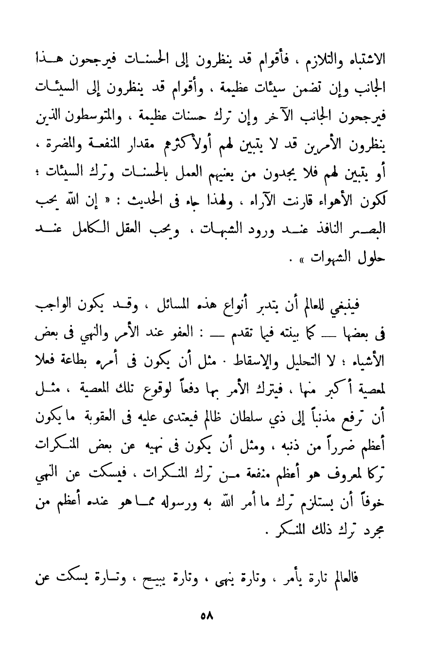 الِاشْتِبَاهُ وَالتَّلَازُمُ فَأَقْوَامٌ قَدْ يَنْظُرُونَ إلَى الْحَسَنَاتِ فَيُرَجِّحُونَ هَذَا الْجَانِبَ وَإِنْ تَضَمَّنَ سَيِّئَاتٍ عَظِيمَةً وَأَقْوَامٌ قَدْ يَنْظُرُونَ إلَى السَّيِّئَاتِ فَيُرَجِّحُونَ الْجَانِبَ الْآخَرَ وَإِنْ تَرَكَ حَسَنَاتٍ عَظِيمَةً والمتوسطون الَّذِينَ يَنْظُرُونَ الْأَمْرَيْنِ قَدْ لَا يَتَبَيَّنُ لَهُمْ أَوْ لِأَكْثَرِهِمْ مِقْدَارُ الْمَنْفَعَةِ وَالْمَضَرَّةِ أَوْ يَتَبَيَّنُ لَهُمْ فَلَا يَجِدُونَ مَنْ يُعِينُهُمْ الْعَمَلَ بِالْحَسَنَاتِ وَتَرْكَ السَّيِّئَاتِ؛ لِكَوْنِ الْأَهْوَاءِ قَارَنَتْ الْآرَاءَ وَلِهَذَا جَاءَ فِي الْحَدِيثِ: {إنَّ اللَّهَ يُحِبُّ الْبَصَرَ النَّافِذَ عِنْدَ وُرُودِ الشُّبُهَاتِ وَيُحِبُّ الْعَقْلَ الْكَامِلَ عِنْدَ حُلُولِ الشَّهَوَاتِ} . فَيَنْبَغِي لِلْعَالِمِ أَنْ يَتَدَبَّرَ أَنْوَاعَ هَذِهِ الْمَسَائِلِ وَقَدْ يَكُونُ الْوَاجِبُ فِي بَعْضِهَا - كَمَا بَيَّنْته فِيمَا تَقَدَّمَ -: الْعَفْوَ عِنْدَ الْأَمْرِ وَالنَّهْيِ فِي بَعْضِ الْأَشْيَاءِ؛ لَا التَّحْلِيلَ وَالْإِسْقَاطَ. مِثْلَ أَنْ يَكُونَ فِي أَمْرِهِ بِطَاعَةِ فِعْلًا لِمَعْصِيَةِ أَكْبَرَ مِنْهَا فَيَتْرُكُ الْأَمْرَ بِهَا دَفْعًا لِوُقُوعِ تِلْكَ الْمَعْصِيَةِ مِثْلَ أَنْ تَرْفَعَ مُذْنِبًا إلَى ذِي سُلْطَانٍ ظَالِمٍ فَيَعْتَدِي عَلَيْهِ فِي الْعُقُوبَةِ مَا يَكُونُ أَعْظَمَ ضَرَرًا مِنْ ذَنْبِهِ وَمِثْلَ أَنْ يَكُونَ فِي نَهْيِهِ عَنْ بَعْضِ الْمُنْكَرَاتِ تَرْكًا لِمَعْرُوفِ هُوَ أَعْظَمُ مَنْفَعَةً مِنْ تَرْكِ الْمُنْكَرَاتِ فَيَسْكُتُ عَنْ النَّهْيِ خَوْفًا أَنْ يَسْتَلْزِمَ تَرْكَ مَا أَمَرَ اللَّهُ بِهِ وَرَسُولُهُ مِمَّا هُوَ عِنْدَهُ أَعْظَمُ مِنْ مُجَرَّدِ تَرْكِ ذَلِكَ الْمُنْكَرِ. فَالْعَالِمُ تَارَةً يَأْمُرُ وَتَارَةً يَنْهَى وَتَارَةً يُبِيحُ وَتَارَةً يَسْكُتُ عَنْ